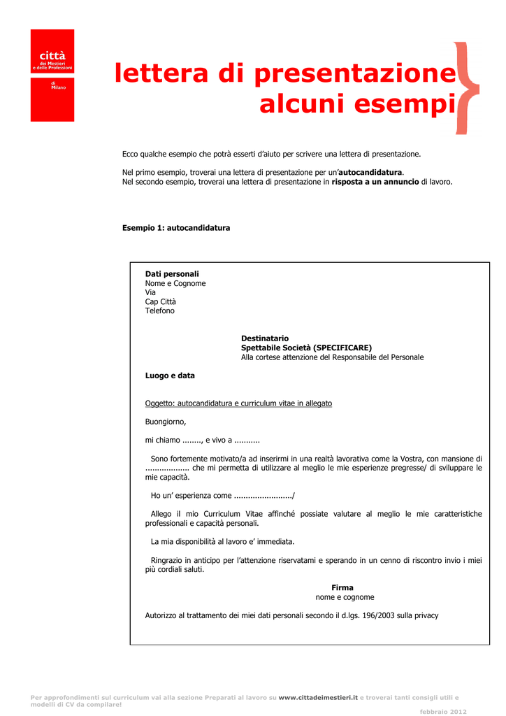 lettera di presentazione alcuni esempi Ecco qualche esempio che potrà esserti d’aiuto per scrivere una lettera di presentazione. Nel primo esempio, troverai una lettera di presentazione per un’autocandidatura. Nel secondo esempio, troverai una lettera di presentazione in risposta a un annuncio di lavoro. Esempio 1: autocandidatura Dati personali Nome e Cognome Via Cap Città Telefono Destinatario Spettabile Società (SPECIFICARE) Alla cortese attenzione del Responsabile del Personale Luogo e data Oggetto: autocandidatura e curriculum vitae in allegato Buongiorno, mi chiamo ........, e vivo a ........... Sono fortemente motivato/a ad inserirmi in una realtà lavorativa come la Vostra, con mansione di ................... che mi permetta di utilizzare al meglio le mie esperienze pregresse/ di sviluppare le mie capacità. Ho un’ esperienza come ........................./ Allego il mio Curriculum Vitae affinché possiate valutare al meglio le mie caratteristiche professionali e capacità personali. La mia disponibilità al lavoro e’ immediata. Ringrazio in anticipo per l’attenzione riservatami e sperando in un cenno di riscontro invio i miei più cordiali saluti. Firma nome e cognome Autorizzo al trattamento dei miei dati personali secondo il d.lgs. 196/2003 sulla privacy Per approfondimenti sul curriculum vai alla sezione Preparati al lavoro su www.cittadeimestieri.it e troverai tanti consigli utili e modelli di CV da compilare! febbraio 2012 lettera di presentazione alcuni esempi Esempio 2: risposta a un annuncio Dati personali Nome e Cognome Via Cap Città Telefono Destinatario Spettabile Società (SPECIFICARE) Alla cortese attenzione del Responsabile del Personale Luogo e data Oggetto: candidatura per la posizione di…… Buongiorno, mi chiamo ........, e vivo a ........... Ho letto il vostro annuncio e ritengo di avere tutte le caratteristiche che state cercando. Sono fortemente motivato/a ad inserirmi in una realtà lavorativa come la Vostra, con mansione di ................... che mi permetta di utilizzare al meglio le mie esperienze pregresse/ di sviluppare le mie capacità. Ho un’ esperienza come ........................./ Allego il mio Curriculum Vitae affinché possiate valutare al meglio le mie caratteristiche professionali e capacità personali. La mia disponibilità al lavoro e’ immediata essendo attualmente in CIGS. Ringrazio in anticipo per l’attenzione riservatami e sperando in un cenno di riscontro invio i miei più cordiali saluti. Firma nome e cognome Autorizzo al trattamento dei miei dati personali secondo il d.lgs. 196/2003 sulla privacy Per approfondimenti sul curriculum vai alla sezione Preparati al lavoro su www.cittadeimestieri.it e troverai tanti consigli utili e modelli di CV da compilare! febbraio 2012