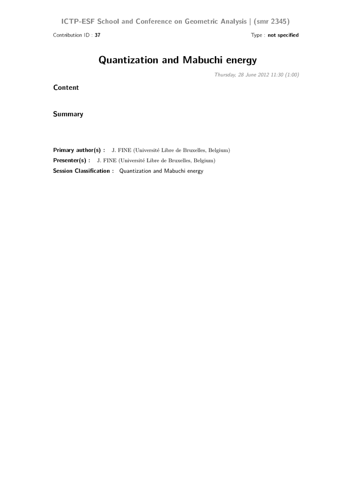 ICTP-ESF School and Conference on Geometric Analysis | (smr 2345) Contribution ID : 37 Type : not specied Quantization and Mabuchi energy Thursday, 28 June 2012 11:30 (1:00) Content Summary Primary author(s) : J. FINE (Université Libre de Bruxelles, Belgium) Presenter(s) : J. FINE (Université Libre de Bruxelles, Belgium) Session Classication : Quantization and Mabuchi energy