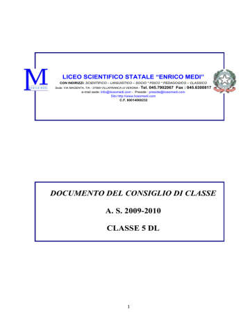 LICEO SCIENTIFICO STATALE “ENRICO MEDI” CON INDIRIZZI: SCIENTIFICO – LINGUISTICO – SOCIO * PSICO * PEDAGOGICO – CLASSICO Sede: VIA MAGENTA, 7/A - 37069 VILLAFRANCA dI VERONA - Tel. 045.7902067 Fax : 045.6300817 e-mail sede: [email protected] - Preside : [email protected] Sito http://www.liceomedi.com C.F. 80014060232 DOCUMENTO DEL CONSIGLIO DI CLASSE A. S. 2009-2010 CLASSE 5 DL 1 CONTENUTI DEL DOCUMENTO 1. Componenti del Consiglio di classe p. 2 2. Storia e giudizio complessivo sulla classe p. 3 3. Attività integrative svolte e attività di progetto p. 5 4. Obiettivi educativi e formativi comuni alla classe p. 6 5. Tematiche pluridisciplinari p. 6 6. Criteri di valutazione adottati dal Collegio dei Docenti p. 7 7. Criteri metodologici comuni p. 9 8. Relazioni e programmi disciplinari svolti p. 11 9. Griglie di valutazione p. 64 10. Testi di simulazione di terza prova e relativa griglia di valutazione p. 80 11. Griglie di valutazione in uso al Liceo Medi per l’esame di Stato p. 83 1. COMPONENTI DEL CONSIGLIO DI CLASSE Prof. VENTURINI Giuseppe (Lettere) Prof. ssa ICARELLI Mariangela (Storia e Filosofia) Prof. ssa FORTUNA Susanna (Inglese) Prof. ssa BALLERINI Maria-Cristina (Tedesco) Prof. ssa MAZZOTTA Giovanna (Francese) Prof. ssa SCIMIA Stefania (Matematica e Fisica) Prof. ssa FALCONE Franca (Scienze) Prof. PERUCCI Enrico (Storia dell’Arte) Prof. CINQUETTI Massimo (Ed. fisica) Prof. ssa PALMANO Giorgia (Religione) Il Dirigente Scolastico Prof.Mario G.Bonini __________________________ Villafranca di Verona, 15 maggio 2010 2 2. STORIA E GIUDIZIO COMPLESSIVO SULLA CLASSE Composizione delle classe 1. 2. 3. 4. 5. 6. 7. 8. 9. 10. 11. 12. 13. 14. 15. ALLEGRINI BALLARINI BOZZA BRUTTI BUZZI CALLINO CHELINI MONTRESOR PASQUALI ROMANO TOSI TOTARO VINCENZI ZAGO ZEVIO Giada Alessia Nicole Elisa Tanita Alessandra Anna Anna Claudia Claudia Davide Ilaria Ylenia Eleonora Valentina Numero di allievi/e nel quinquennio Classe 1° a.s. 2005-2006 La classe è composta da 26 alunni. Un’alunna ha cambiato scuola in corso d’anno. Al termine dell’anno scolastico un’alunna non viene ammessa alla classe successiva, due alunni hanno cambiato istituto ed un’alunna di origine straniera, sebbene ammessa alla classe successiva, si è iscritta nuovamente alla classe prima. Classe 2° a.s. 2006-2007 La classe è composta da 22 alunni, di cui 21 provenienti dalla ex 1D e una alunna non promossa proveniente dalla ex 2D. Al termine del secondo anno un’alunna non è ammessa alla classe successiva. Classe 3° a.s. 2007-2008 La classe è composta da 22 alunni, di cui 21 provenienti dalla ex 2D e una alunna proveniente da altro istituto. Al termine dell’anno scolastico un’alunna non viene ammessa alla classe successiva a giugno e due alunne, non essendosi presentate agli esami di verifica della sospensione, non vengono ammesse a settembre. Classe 4° a.s. 2008-2009 La classe è composta da 19 alunni. Al termine dell’anno scolastico due alunni non sono stati ammessi alla classe successiva a giugno e due alunne non hanno superato gli esami di verifica della sospensione a settembre. Classe 5° a.s. 2009-2010 La classe è composta da 15 alunni (14 femmine ed un maschio), di cui 14 provenienti dalla ex 4D ed una alunna non promossa proveniente dalla ex 5D. 3 CONTINUITÁ DEI DOCENTI MATERIA Classe 1^ Classe 2^ Religione Sinibaldi Piccoli Piccoli Palmano Palmano Italiano De Pietro Grasso Venturini Venturini Venturini Latino Zuccher Venturini Venturini Venturini Venturini Storia/Geografia Zampini Grasso Ferrari Aloisi Icarelli Storia/Filosofia Classe 3^ Classe 4^ Classe 5^ Inglese Coeli Lestingi Lestingi Lestingi Fortuna Conv. Inglese Cadin Cadin Parsno Parsno Parsno Tedesco Ballerini Ballerini Ballerini Ballerini Ballerini Conv. Tedesco Wurzer Wurzer Wurzer Wurzer Wurzer Francese Mazzotta Mazzotta Mazzotta Conv. Francese Demouveaux Demouveaux Demouveaux Diritto Zuliani Zuliani Scienze Faggioli Faggioli De Benedictis Desumma Falcone Matematica Pozzato Pozzato Mondini Scandiuzzi Scimia Fisica Mondini Mondini Disegno – Storia dell’ Arte Ed. Fisica Perucci Perucci Gaiardoni Perucci Perucci Galanti Zanoncelli Cinquetti Cinquetti Cinquetti Nell’ambito del biennio si evidenzia la continuità nell’insegnamento delle seguenti discipline : Tedesco Diritto Scienze Matematica Fisica Disegno La discontinuità si registra nelle seguenti discipline : Religione Italiano Latino Storia Nell’ambito del triennio si evidenzia : continuità nell’insegnamento delle seguenti discipline : Italiano/Latino Tedesco Francese sostanziale continuità per: Religione Inglese (ad eccezione del quinto anno) Inglese Ed. Fisica Ed. Fisica Storia dell’Arte discontinuità nelle seguenti discipline : Storia e Filosofia Scienze Matematica Il coordinamento della Classe è stato tenuto per l’intero quinquennio dalla prof.ssa Ballerini (Tedesco). 4 2.1 GIUDIZIO COMPLESSIVO SULLA CLASSE La classe ha sviluppato gradualmente un atteggiamento sempre più serio e consapevole nei confronti dell’attività didattica, si é sempre dimostrata attenta e silenziosa durante le lezioni, generalmente diligente e puntuale nell’esecuzione dei compiti assegnati e abbastanza studiosa. Nel corso dell’ultimo anno si è notato anche un sostanziale miglioramento sia della qualità dello studio sia della capacità di rielaborare in maniera più consapevole e personale gli argomenti proposti, utilizzando un forma espositiva abbastanza chiara e appropriata. I rapporti con gli insegnanti e tra compagni sono sempre stati corretti ed educati. Lo svolgimento dei programmi non ha mediamente subito modifiche rispetto alle programmazioni iniziali, anche se, in alcune discipline, le attività integrative dell’offerta formativa hanno determinato una contrazione nello sviluppo di alcuni argomenti o una accelerazione nella spiegazione. Gli obiettivi educativi e didattici indicati dal Consiglio di Classe sono stati raggiunti da quasi tutta la classe. Dal punto d