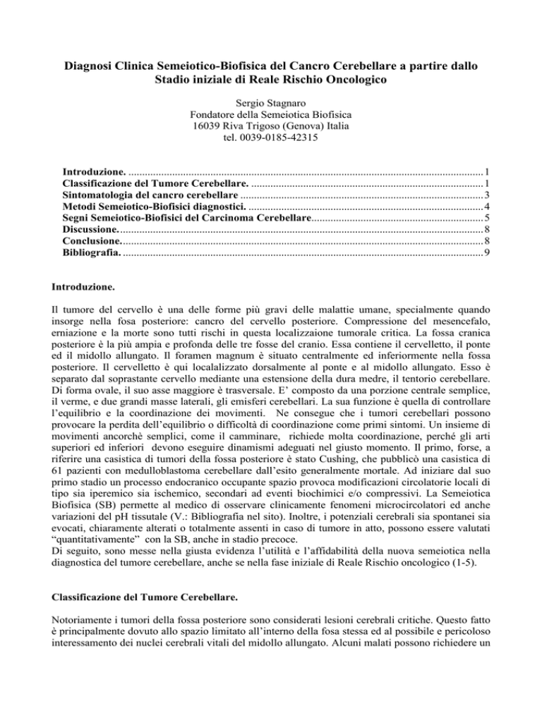 Diagnosi Clinica Semeiotico-Biofisica del Cancro Cerebellare a partire dallo Stadio iniziale di Reale Rischio Oncologico Sergio Stagnaro Fondatore della Semeiotica Biofisica 16039 Riva Trigoso (Genova) Italia tel. 0039-0185-42315 Introduzione. .................................................................................................................................. 1 Classificazione del Tumore Cerebellare. ..................................................................................... 1 Sintomatologia del cancro cerebellare ......................................................................................... 3 Metodi Semeiotico-Biofisici diagnostici. ...................................................................................... 4 Segni Semeiotico-Biofisici del Carcinoma Cerebellare............................................................... 5 Discussione. ..................................................................................................................................... 8 Conclusione. .................................................................................................................................... 8 Bibliografia. .................................................................................................................................... 9 Introduzione. Il tumore del cervello è una delle forme più gravi delle malattie umane, specialmente quando insorge nella fosa posteriore: cancro del cervello posteriore. Compressione del mesencefalo, erniazione e la morte sono tutti rischi in questa localizzaione tumorale critica. La fossa cranica posteriore è la più ampia e profonda delle tre fosse del cranio. Essa contiene il cervelletto, il ponte ed il midollo allungato. Il foramen magnum è situato centralmente ed inferiormente nella fossa posteriore. Il cervelletto è qui localalizzato dorsalmente al ponte e al midollo allungato. Esso è separato dal soprastante cervello mediante una estensione della dura medre, il tentorio cerebellare. Di forma ovale, il suo asse maggiore è trasversale. E’ composto da una porzione centrale semplice, il verme, e due grandi masse laterali, gli emisferi cerebellari. La sua funzione è quella di controllare l’equilibrio e la coordinazione dei movimenti. Ne consegue che i tumori cerebellari possono provocare la perdita dell’equilibrio o difficoltà di coordinazione come primi sintomi. Un insieme di movimenti ancorchè semplici, come il camminare, richiede molta coordinazione, perché gli arti superiori ed inferiori devono eseguire dinamismi adeguati nel giusto momento. Il primo, forse, a riferire una casistica di tumori della fossa posteriore è stato Cushing, che pubblicò una casistica di 61 pazienti con medulloblastoma cerebellare dall’esito generalmente mortale. Ad iniziare dal suo primo stadio un processo endocranico occupante spazio provoca modificazioni circolatorie locali di tipo sia iperemico sia ischemico, secondari ad eventi biochimici e/o compressivi. La Semeiotica Biofisica (SB) permette al medico di osservare clinicamente fenomeni microcircolatori ed anche variazioni del pH tissutale (V.: Bibliografia nel sito). Inoltre, i potenziali cerebrali sia spontanei sia evocati, chiaramente alterati o totalmente assenti in caso di tumore in atto, possono essere valutati “quantitativamente” con la SB, anche in stadio precoce. Di seguito, sono messe nella giusta evidenza l’utilità e l’affidabilità della nuova semeiotica nella diagnostica del tumore cerebellare, anche se nella fase iniziale di Reale Rischio oncologico (1-5). Classificazione del Tumore Cerebellare. Notoriamente i tumori della fossa posteriore sono considerati lesioni cerebrali critiche. Questo fatto è principalmente dovuto allo spazio limitato all’interno della fosa stessa ed al possibile e pericoloso interessamento dei nuclei cerebrali vitali del midollo allungato. Alcuni malati possono richiedere un intervento chirurgico immediato, specialmente se presentano sintomi “acuti” di interessamento di questi centri o erniazione, che avviene dopo anni e decenni dall’insorgenza del “reale rischio oncologico”, cioè dalla nascita. I tumori della fossa posteriore sono più frequenti nei bambini che negli adulti. Tra il 54% e il 70% di tutti i tumori nei bambini è questa la loro sede. Al contrario, il 15-20% dei tumori nell’adulto si trova nella fossa posteriore (7-11). Alcuni tipi dei tumori ivi localizzati, come il medulloblastoma, pineoblastoma, ependimoma, il tumore primitivo neuroectodermico (PNETs) e l’astrocitoma del cervelletto e del mesencefalo insorgono più frequentemente nell’infanzia. Alcuni tumori gliali, come il glioma misto, colpiscono esclusivamente i bambini. Essi sono localizzati più frequentemente nel cervelletto (67%) e sono generalmente benigni. Nulla sappiamo sulle possibili cause di questi tumori. Tuttavia, fattori genetici, come la disfunzione di alcuni geni soppressori tumorali (p53 gene) e l’attivazione di alcuni oncogeni potrebbero recitare un ruolo nel loro sviluppo esclusivamente però in individui positivi per il Terreno Oncologico con Reale Rischio oncologico cerebellare dalla nascita. In analogia con gli altri tumori maligni, fattori ambientali, come le radiazioni e le tossine, possono svolgere un ruolo patogenetico (7-11). I tipi di tumori cerebellari più frequenti sono quelli di seguito brevemente descritti. Astrocitoma cerebellare. L’astrocitoma cerebellare cistico comprende il 33% di tutti I tumori della fossa posteriore nei bambini Tumori neuroectodermici primitivi. I PNETs includono medulloblastomi, medulloepiteliomi, medulloblastomi pigmentati, ependimoblastomi, pineoblastomi e neuroblastomi cerebrali. Questi tumori originano da cellule indifferenziate nella regione sottoependimale nel cervello fetale. Come frequenza, i PNETs sono secondi solo all’astrocitoma cerebellare, comprendendo il 25% dei tumori intracranici nei bambini. Medulloblastoma Il medull