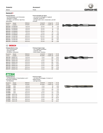 Zubehör Accessori Bohrer Punte Holzspiralbohrer - mit Zentrierspitze und 2 Schneiden - Werkstoff: CV-Stahl - für Weich- und Hartholz, Sperrholz, Spanplatten Punta elicoidale per legno - con punta di centraggio e 2 taglienti - materiale: acciaio CV - per legni dolci e duri, compensato, pannelli truciolari Bestell-Nr Modell Ø Bohrer Schaft-Ø Länge mm € / St cod.art. modello Ø Punta Ø codolo Lungh. mm € / PZ 962-0120 3012880300 3,00 mm 3,0 mm 60 1,54 962-0121 3012880400 4,00 mm 4,0 mm 75 1,54 962-0122 3012880500 5,00 mm 5,0 mm 85 1,67 962-0123 3012880600 6,00 mm 6,0 mm 90 1,71 962-0124 3012880700 7,00 mm 7,0 mm 110 1,85 962-0125 3012880800 8,00 mm 8,0 mm 120 2,20 962-0126 3012881000 10,00 mm 10,0 mm 130 2,47 962-0127 3012881200 12,00 mm 8,0 mm 150 2,66 962-0128 3012881400 14,00 mm 9,5 mm 160 3,61 962-0129 3012881600 16,00 mm 9,5 mm 180 4,00 Holzspiralbohrer lang - mit 2 Vorschneidern - Werkstoff: HSS - Schaftform: zylindrisch Punta per legno lunga - con 2 taglienti sbozzatori - materiale: HSS - forma codolo: cilindrica Bestell-Nr Modell Ø Bohrer Schaft-Ø Länge mm € / St cod.art. modello Ø Punta Ø codolo Lungh. mm € / PZ 466-1970 2608597187 6,00 mm 6 mm 250 10,04 466-1971 2608597188 8,00 mm 8 mm 250 10,46 466-1972 2608597189 10,00 mm 10 mm 250 12,12 466-1973 2608597190 12,00 mm 10 mm 250 13,21 466-1974 2608597191 14,00 mm 10 mm 250 13,63 466-1975 2608597192 16,00 mm 10 mm 250 15,30 466-1976 2608597193 18,00 mm 10 mm 250 17,56 466-1977 2608597194 20,00 mm 10 mm 250 18,82 Holzspiralbohrer - mit Zentrierspitze, 2 Vorschneidern und 2 Schneiden hinterfräst - für Weichholz Punta per legno - con punta di centraggio, 2 incisori e 2 taglienti fresati - per legni teneri Bestell-Nr Modell Ø Bohrer Schaft-Ø Länge mm € / St cod.art. modello Ø Punta Ø codolo Lungh. mm € / PZ 797-0649 3303 4,00 mm 4 mm 80 6,86 797-0652 3303 5,00 mm 5 mm 90 7,20 797-0646 3303 6,00 mm 6 mm 100 7,20 797-0647 3303 8,00 mm 8 mm 115 8,24 797-0648 3303 10,00 mm 10 mm 130 9,36 797-0640 3303 E SP 12,00 mm 10 mm 140 11,36 797-0641 3303 E SP 14,00 mm 10 mm 140 15,61 797-0642 3303 E SP 15,00 mm 10 mm 140 16,74 797-0643 3303 E SP 16,00 mm 10 mm 140 17,34 797-0644 3303 E SP 18,00 mm 10 mm 140 22,11 Zubehör Accessori Bohrer Punte Holzspiralbohrer - mit Zentrierspitze, 2 Vorschneidern und 2 Schneiden hinterfräst - für Hartholz Punta per legno - con punta di centraggio, 2 incisori e 2 taglienti fresati - per legni duri Bestell-Nr Modell Ø Bohrer Schaft-Ø Länge mm € / St cod.art. modello Ø Punta Ø codolo Lungh. mm € / PZ 3303 HW 5,00 mm 5 mm 90 27,70 797-0121 Holzschlangenbohrer - speziell für Zimmerleute und Dachdecker - bearbeitbare Werkstoffe: Holz, Tannenholz, Buchenholz, nasses Holz - Schaftform: Sechskant - mit Gewindespitze Punta per travi in legno - ideale per carpentieri e specialisti di coperture di tetti - materiale lavorabile: legno, legno d'abete, di faggio, legno umido - forma codolo: esagonale - con punta filettata Bestell-Nr Modell Ø Bohrer Schaft-Ø Länge mm € / St cod.art. modello Ø Punta Ø codolo Lungh. mm € / PZ 466-1920 2608597622 6,00 mm 4,80 mm 235 12,12 466-1921 2608597623 8,00 mm 6,35 mm 235 12,71 466-1922 2608597640 8,00 mm 6,35 mm 450 24,25 466-1923 2608597624 10,00 mm 6,35 mm 235 13,29 466-1924 2608597641 10,00 mm 6,35 mm 450 25,51 466-1925 2608597626 12,00 mm 6,35 mm 235 13,63 466-1926 2608597642 12,00 mm 6,35 mm 450 29,26 466-1927 2608597628 14,00 mm 11,10 mm 235 16,13 466-1928 2608597643 14,00 mm 11,10 mm 450 31,77 466-1930 2608597644 16,00 mm 11,10 mm 450 34,69 466-1931 2608597631 18,00 mm 11,10 mm 235 19,24 466-1932 2608597645 18,00 mm 11,10 mm 450 38,46 466-1933 2608597632 20,00 mm 11,10 mm 235 22,16 466-1934 2608597646 20,00 mm 11,10 mm 450 42,22 466-1935 2608597633 22,00 mm 11,10 mm 235 23,42 466-1936 2608597647 22,00 mm 11,10 mm 450 45,98 466-1937 2608597634 24,00 mm 11,10 mm 235 29,26 466-1938 2608597648 24,00 mm 11,10 mm 450 50,58 466-1939 2608597635 25,00 mm 11,10 mm 235 30,51 466-1940 2608597649 26,00 mm 11,10 mm 450 55,60 466-1941 2608597650 28,00 mm 11,10 mm 450 61,45 466-1942 2608597651 30,00 mm 11,10 mm 450 66,89 466-1943 2608597652 32,00 mm 11,10 mm 450 73,58 Zubehör Accessori Bohrer Punte Schlangenbohrer Lewis - gefräste Ausführung mit Hinterschliff - mit Zylinderschaft, Gewindespitze, Hauptschneide und Vorschneider - ab Ø 8 mm Sechskantschaft - für Tieflochbohrungen in Weich- und Hartholz Punta a spirale per legno Lewis - versione fresata e rettificata - con codolo cilindrico, punta filettata, 1 tagliente ed 1 incisore - a partire da Ø 8 mm codolo esagonale - per forare in profondità legni dolci e legni duri Bestell-Nr Modell Ø Bohrer Schaft-Ø Länge mm € / St cod.art. modello Ø Punta Ø codolo Lungh. mm € / PZ 796-0200 1410.206 6,00 mm 5,5 mm 235 13,23 796-0224 1410.306 6,00 mm 5,5 mm 320 17,05 796-0201 1410.208 8,00 mm 7,8 mm 235 13,23 796-0225 1410.308 8,00 mm 7,8 mm 320 17,05 796-0203 1410.612 11,50 mm 11,8 mm 650 31,81 796-0204 1410.614 14,00 mm 13,0 mm 650 38,60 796-0205 1410.616 16,00 mm 13,0 mm 650 43,27 796-0206 1410.618 18,00 mm 13,0 mm 650 46,23 796-0214 1410.320 20,00 mm 13,0 mm 320 28,05 796-0207 1410.620 20,00 mm 13,0 mm 650 52,73 796-0215 1410.322 22,00 mm 13,0 mm 320 33,64 796-0208 1410.622 22,00 mm 13,0 mm 650 62,24 796-0209 1410.624 24,00 mm 13,0 mm 650 66,01 796-0216 1410.325 25,00 mm 13,0 mm 320 38,94 796-0210 1410.626 26,00 mm 13,0 mm 650 74,33 796-0217 1410.330 30,00 mm 13,0 mm 320 46,69 796-0211 1410.630 30,00 mm 13,0 mm 650 91,54 796-0218 1410.335 35,00 mm 13,0 mm 300 101,97 796-0222 1410.635 35,00 mm 13,0 mm 650 167,07 796-0219 1410.340 40,00 mm 13,0 mm 300 153,50 796-0223 1410.640 40,00 mm 13,0 mm 650 260,21 796-0221 1410.345 45,00 mm 13,0 mm 300 201,55 Schalungs- und Installationsbohrer - langer Bohrer, in HSS-Qualität, mit breitem Einsatzspektrum, sowohl für Baugewerbe (Schalungsbau) als auch Innenausbau - bearbeitbare Werkstoffe: Holz, Metall - Schaftform: zylindrisch Punta per casseforme e install