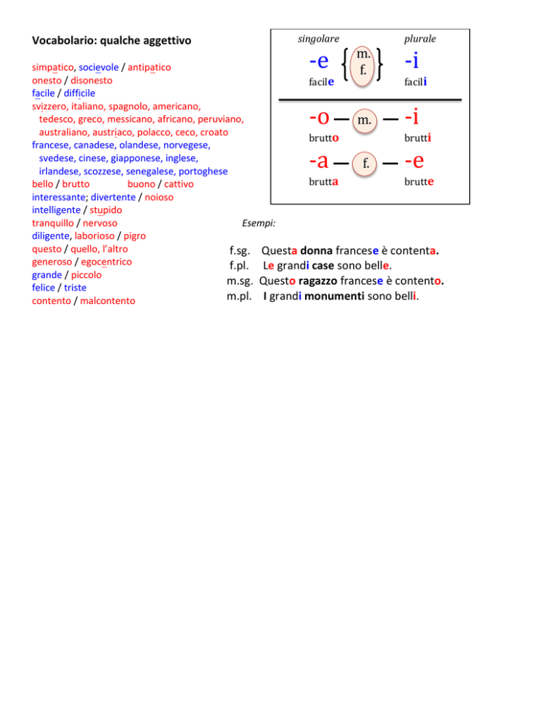 Vocabolario:qualcheaggettivo singolare plurale m. simpatico,socievole/antipatico f. onesto/disonesto facile facili facile/difficile svizzero,italiano,spagnolo,americano, tedesco,greco,messicano,africano,peruviano, m. australiano,austriaco,polacco,ceco,croato brutto brutti francese,canadese,olandese,norvegese, svedese,cinese,giapponese,inglese, f. irlandese,scozzese,senegalese,portoghese brutta brutte bello/brutto buono/cattivo interessante;divertente/noioso intelligente/stupido tranquillo/nervoso Esempi: diligente,laborioso/pigro questo/quello,l’altro f.sg.Questadonnafranceseècontenta. generoso/egocentrico f.pl.Legrandicasesonobelle. grande/piccolo m.sg.Questoragazzofranceseècontento. felice/triste m.pl.Igrandimonumentisonobelli. contento/malcontento -e -o -a -i -i -e