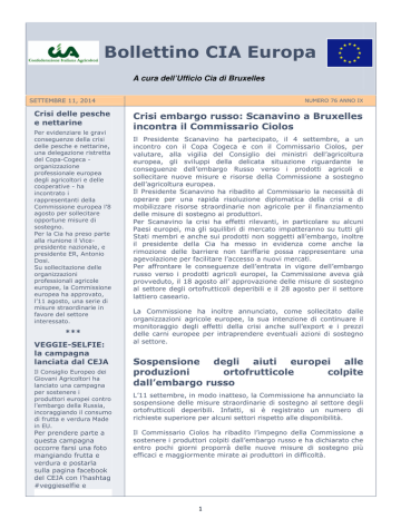 Bollettino CIA Europa A cura dell’Ufficio Cia di Bruxelles SETTEMBRE 11, 2014 Crisi delle pesche e nettarine Per evidenziare le gravi conseguenze della crisi delle pesche e nettarine, una delegazione ristretta del Copa-Cogeca organizzazione professionale europea degli agricoltori e delle cooperative - ha incontrato i rappresentanti della Commissione europea l’8 agosto per sollecitare opportune misure di sostegno. Per la Cia ha preso parte alla riunione il Vicepresidente nazionale, e presidente ER, Antonio Dosi. Su sollecitazione delle organizzazioni professionali agricole europee, la Commissione europea ha approvato, l’11 agosto, una serie di misure straordinarie in favore del settore interessato. *** VEGGIE-SELFIE: la campagna lanciata dal CEJA Il Consiglio Europeo dei Giovani Agricoltori ha lanciato una campagna per sostenere i produttori europei contro l’embargo della Russia, incoraggiando il consumo di frutta e verdura Made in EU. Per prendere parte a questa campagna occorre farsi una foto mangiando frutta e verdura e postarla sulla pagina facebook del CEJA con l’hashtag #veggieselfie e NUMERO 76 ANNO IX Crisi embargo russo: Scanavino a Bruxelles incontra il Commissario Ciolos Il Presidente Scanavino ha partecipato, il 4 settembre, a un incontro con il Copa Cogeca e con il Commissario Ciolos, per valutare, alla vigilia del Consiglio dei ministri dell’agricoltura europea, gli sviluppi della delicata situazione riguardante le conseguenze dell’embargo Russo verso i prodotti agricoli e sollecitare nuove misure e risorse della Commissione a sostegno dell’agricoltura europea. Il Presidente Scanavino ha ribadito al Commissario la necessità di operare per una rapida risoluzione diplomatica della crisi e di mobilizzare risorse straordinarie non agricole per il finanziamento delle misure di sostegno ai produttori. Per Scanavino la crisi ha effetti rilevanti, in particolare su alcuni Paesi europei, ma gli squilibri di mercato impatteranno su tutti gli Stati membri e anche sui prodotti non soggetti all’embargo, inoltre il presidente della Cia ha messo in evidenza come anche la rimozione delle barriere non tariffarie possa rappresentare una agevolazione per facilitare l’accesso a nuovi mercati. Per affrontare le conseguenze dell’entrata in vigore dell’embargo russo verso i prodotti agricoli europei, la Commissione aveva già provveduto, il 18 agosto all’ approvazione delle misure di sostegno al settore degli ortofrutticoli deperibili e il 28 agosto per il settore lattiero caseario. La Commissione ha inoltre annunciato, come sollecitato dalle organizzazioni agricole europee, la sua intenzione di continuare il monitoraggio degli effetti della crisi anche sull’export e i prezzi delle carni europee per intraprendere eventuali azioni di sostegno al settore. Sospensione degli aiuti europei alle produzioni ortofrutticole colpite dall’embargo russo L’11 settembre, in modo inatteso, la Commissione ha annunciato la sospensione delle misure straordinarie di sostegno al settore degli ortofrutticoli deperibili. Infatti, si è registrato un numero di richieste superiore per alcuni settori rispetto alle disponibilità. Il Commissario Ciolos ha ribadito l’impegno della Commissione a sostenere i produttori colpiti dall’embargo russo e ha dichiarato che entro pochi giorni proporrà delle nuove misure di sostegno più efficaci e maggiormente mirate ai produttori in difficoltà. 1 nominare altri candidati. Anche il nostro Presidente Scanavino ha partecipato alla campagna del CEJA e molti esponenti delle istituzioni europee e dell’organizzazione di agricoltori stanno facendo altrettanto. *** Ulteriori fondi per la promozione dei prodotti agricoli UE La Commissione, il 3 Settembre, ha confermato l’intenzione di stanziare altri 30 milioni di euro di cofinanziamento UE per i programmi di promozione che inizieranno nel 2015, in aggiunta ai 60 milioni annuali già previsti dal bilancio della PAC. Tale aumento della dotazione finanziaria dei programmi di promozione sarebbe finalizzato ad alleviare l’impatto del divieto di importazione adottato dalla Russia verso determinati prodotti agricoli europei. Questo annuncio si aggiunge alle misure eccezionali già adottate per supportare il mercato delle pesche e delle pesce noci (33 milioni di euro), e per altre tipologie di prodotti ortofrutticoli deperibili (125 milioni di euro ma sospese oggi 11 Risultati della riunione del CONSIGLIO AGRICOLTURA sull’embargo russo Lo scorso 5 Settembre i ministri agricoli dell'UE hanno discusso l'impatto del divieto russo sulle esportazioni agricole e hanno accolto con favore l'azione adottata della Commissione finora. I ministri hanno sottolineato la necessità di: • Continuare a monitorare i mercati; • Rafforzare le misure di promozione delle esportazioni e trovare nuovi sbocchi di mercato. • Avere un approccio coordinato in materia di aiuti di Stato. • in linea con quanto sostenuto dal Copa-Cogeca, hanno evidenziato che la crisi non è responsabilità del settore agricolo e quindi dovrà essere valutata anche l’utilizzazione di fondi aggiuntivi al di fuori del bilancio della PAC. • La Presidenza italiana ha anche detto che esamineranno le misure per indennizzare il settore della pesca, anch’esso duramente colpito. Il Commissario Ciolos ha riferito che la Commissione cercherà nei prossimi giorni di valutare quali sono i margini che hanno a loro disposizione. Una task force è stata istituita presso la DG Agri e con il compito di valutare decisioni più mirate con misure incentrate sugli Stati membri e sui paesi maggiormente colpiti. Il Commissario Ciolos ha annunciato che nuove misure per i settori europei di frutta, legumi e latticini saranno presentate nelle prossime della settimane. Il Commissario ha inviato ai Ministri un documento sul divieto russo che delinea i temi chiave: 1) misure di gestione del mercato 2) aumento dei fondi di promozione 3) discussione delle misure mirate 