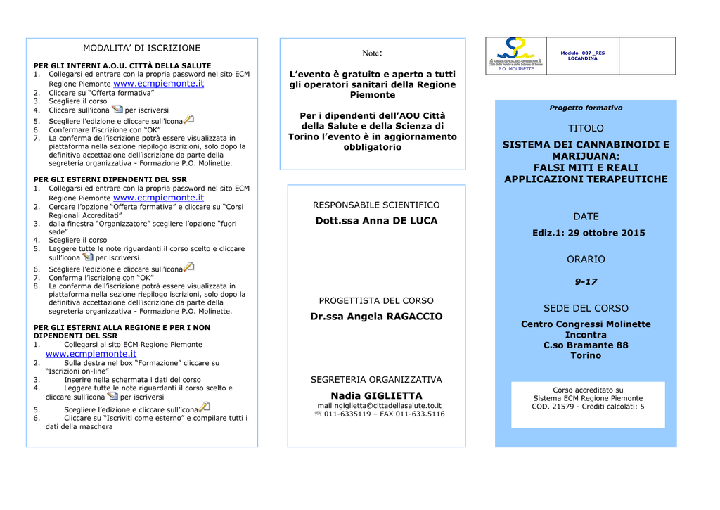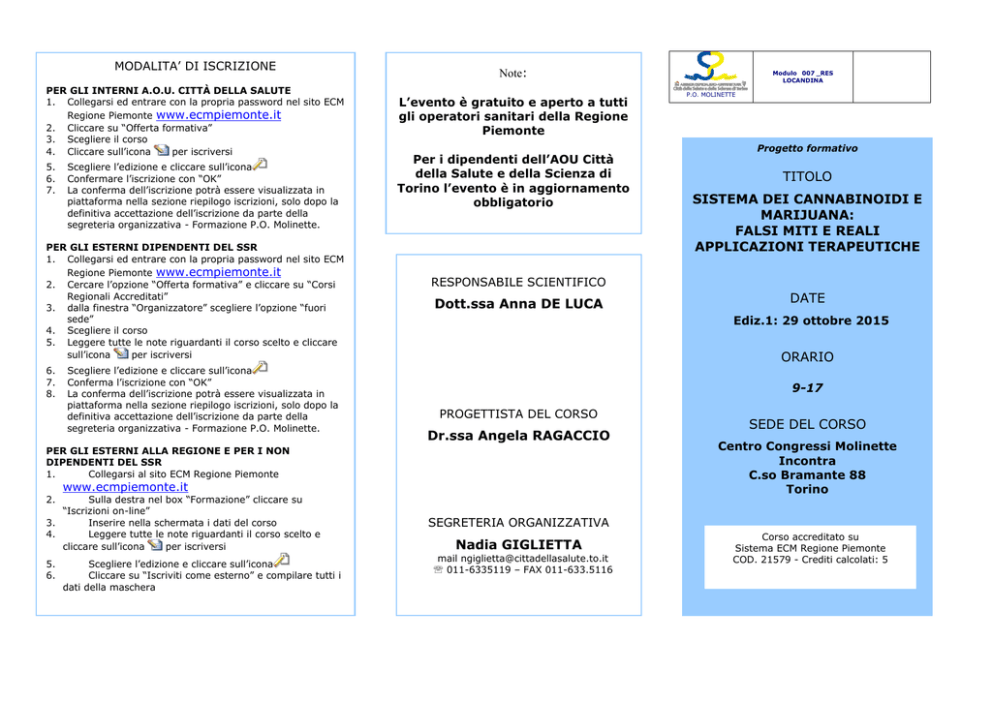 MODALITA’ DI ISCRIZIONE PER GLI INTERNI A.O.U. CITTÀ DELLA SALUTE 1. Collegarsi ed entrare con la propria password nel sito ECM Regione Piemonte www.ecmpiemonte.it 2. Cliccare su “Offerta formativa” 3. Scegliere il corso 4. Cliccare sull’icona per iscriversi 5. 6. 7. Scegliere l’edizione e cliccare sull’icona Confermare l’iscrizione con “OK” La conferma dell’iscrizione potrà essere visualizzata in piattaforma nella sezione riepilogo iscrizioni, solo dopo la definitiva accettazione dell’iscrizione da parte della segreteria organizzativa - Formazione P.O. Molinette. PER GLI ESTERNI DIPENDENTI DEL SSR 1. Collegarsi ed entrare con la propria password nel sito ECM Regione Piemonte www.ecmpiemonte.it 2. Cercare l’opzione “Offerta formativa” e cliccare su “Corsi Regionali Accreditati” 3. dalla finestra “Organizzatore” scegliere l’opzione “fuori sede” 4. Scegliere il corso 5. Leggere tutte le note riguardanti il corso scelto e cliccare sull’icona per iscriversi 6. 7. 8. Scegliere l’edizione e cliccare sull’icona Conferma l’iscrizione con “OK” La conferma dell’iscrizione potrà essere visualizzata in piattaforma nella sezione riepilogo iscrizioni, solo dopo la definitiva accettazione dell’iscrizione da parte della segreteria organizzativa - Formazione P.O. Molinette. Note: L’evento è gratuito e aperto a tutti gli operatori sanitari della Regione Piemonte Per i dipendenti dell’AOU Città della Salute e della Scienza di Torino l’evento è in aggiornamento obbligatorio Dott.ssa Anna DE LUCA TITOLO SISTEMA DEI CANNABINOIDI E MARIJUANA: FALSI MITI E REALI APPLICAZIONI TERAPEUTICHE DATE ORARIO 9-17 PROGETTISTA DEL CORSO Dr.ssa Angela RAGACCIO www.ecmpiemonte.it Scegliere l’edizione e cliccare sull’icona Cliccare su “Iscriviti come esterno” e compilare tutti i dati della maschera Progetto formativo Ediz.1: 29 ottobre 2015 2. 5. 6. P.O. MOLINETTE RESPONSABILE SCIENTIFICO PER GLI ESTERNI ALLA REGIONE E PER I NON DIPENDENTI DEL SSR 1. Collegarsi al sito ECM Regione Piemonte Sulla destra nel box “Formazione” cliccare su “Iscrizioni on-line” 3. Inserire nella schermata i dati del corso 4. Leggere tutte le note riguardanti il corso scelto e cliccare sull’icona per iscriversi Modulo 007 _RES LOCANDINA SEDE DEL CORSO Centro Congressi Molinette Incontra C.so Bramante 88 Torino SEGRETERIA ORGANIZZATIVA Nadia GIGLIETTA mail [email protected] 011-6335119 – FAX 011-633.5116 Corso accreditato su Sistema ECM Regione Piemonte COD. 21579 - Crediti calcolati: 5 AREA TEMATICA Specialità mediche FINALITA’ Sviluppare le competenze sulla gestione globale e integrata del dolore secondo le indicazioni scientifiche e normative più aggiornate OBIETTIVO Sebbene l’uso medicinale della Cannabis sia conosciuto fin dal 1800, solo recentemente la comunità scientifica ha riconosciuto l’apporto di tali sostanza nel trattamento di alcune patologie. L’obiettivo del convegno è quello di valutare, alla luce delle evidenze scientifiche, il reale ruolo di queste sostanze nella pratica clinica e di fare luce su miti e credenze alimentati dall’associazione tra cannabinoidi e marijuana ARTICOLAZIONE Il corso si articola in una giornata di studio per un totale di 7 ore DESTINATARI PROGRAMMA 199 operatori del ruolo sanitario 9.00-9.15 Saluto della Direzione 9.15-9.30 Introduzione alle tematiche della giornata (A. De Luca, S. Stecca) 9.30-10.00 Aspetti normativi: la legge Regionale 15 giugno 2015, n. 11 (V. Demicheli) 10.00-10.45 Il sistema dei cannabinoidi: forme farmaceutiche e dispensazione nelle farmacie (P. Brusa, M. Giaccone, D. Cestino) 10.45-11.30 Il meccanismo d’azione: razionale d’uso nella terapia del dolore (R. Torta) 11.30-12.00 Dolore e cannabinoidi: le motivazioni dei pazienti e il punto di vista degli operatori (G. Macchi) 12.00-13.00 Profili di responsabilità (G. Di Vella DOCENTI L’ Vittorio DEMICHELI Responsabile Settore Assistenza sanitaria e socio sanitaria territoriale Regione Piemonte Silvana STECCA Direttore SC Farmacia AOU Città della Salute e della Scienza Torino Paola BRUSA Professore associato Tecnologia e Legislazione Farmaceutica – Dipartimento Scienza e Tecnologia del Farmaco- università degli Studi di Torino Mario GIACCONE Presidente dell’Ordine dei Farmacisti di Torino Daniela CESTINO Farmacista SC Farmacia AOU Città della Salute e della Scienza Torino Riccardo TORTA Professore Associato Psicologia Clinica Direttore Psicologia clinica e oncologia AOU Città della Salute e della Scienza Torino Giorgia MACCHI Psicologa psicoterapeuta SC Terapia del dolore e cure palliative AOU Città della Salute e della Scienza Torino Giancarlo DI VELLA Professore Associato Medicina legale Università di Torino Antonio BERTOLOTTO Direttore Centro Sclerosi Multipla AOU S. Luigi Gonzaga Orbassano Paola CAVALLA Responsabile Centro Sclerosi Multipla AOU Città della Salute e della Scienza Torino Enrico FUSARO 13.00-14.00 Pausa pranzo 14.00-16.00 Esperienze ed evidenze nell’uso dei cannabinoidi nella pratica clinica (A. De Luca, F. Napoletano) in neurologia (A. Bertolotto, P. Cavalla) in reumatologia (E. Fusaro) nella terapia del dolore (A. De Luca) in urologia (P. Gontero) 16.00-16.45 Discussione e conclusioni 16.45-17.00 Verifica dell’apprendimento Direttore f.f. Reumatologia AOU Città della Salute e della Scienza Torino Anna DE LUCA Direttore SC Terapia del dolore e cure palliative AOU Città della Salute e della Scienza Torino Paolo GONTERO Professore Associato Urologia Università degli studi di Torino MODERATORI o o Anna DE LUCA Franco NAPOLETANO Partecipano i rappresentanti delle Associazioni di Volontariato