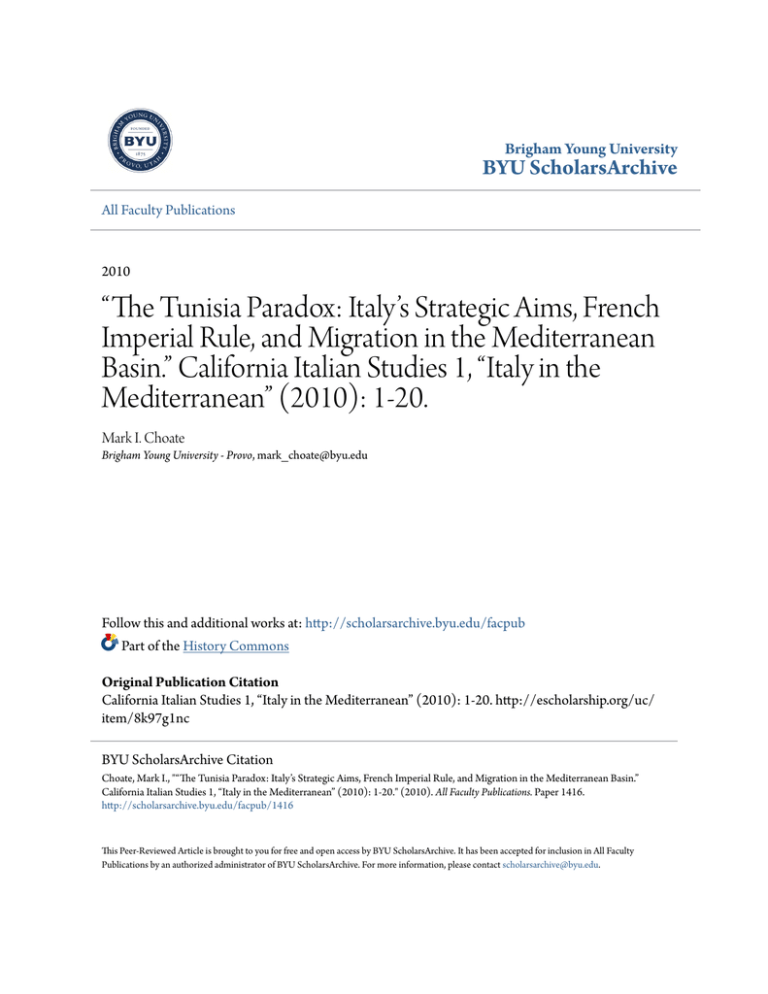 Brigham Young University BYU ScholarsArchive All Faculty Publications 2010 “The Tunisia Paradox: Italy’s Strategic Aims, French Imperial Rule, and Migration in the Mediterranean Basin.” California Italian Studies 1, “Italy in the Mediterranean” (2010): 1-20. Mark I. Choate Brigham Young University - Provo, [email protected] Follow this and additional works at: http://scholarsarchive.byu.edu/facpub Part of the History Commons Original Publication Citation California Italian Studies 1, “Italy in the Mediterranean” (2010): 1-20. http://escholarship.org/uc/ item/8k97g1nc BYU ScholarsArchive Citation Choate, Mark I., "“The Tunisia Paradox: Italy’s Strategic Aims, French Imperial Rule, and Migration in the Mediterranean Basin.” California Italian Studies 1, “Italy in the Mediterranean” (2010): 1-20." (2010). All Faculty Publications. Paper 1416. http://scholarsarchive.byu.edu/facpub/1416 This Peer-Reviewed Article is brought to you for free and open access by BYU ScholarsArchive. It has been accepted for inclusion in All Faculty Publications by an authorized administrator of BYU ScholarsArchive. For more information, please contact [email protected]. Peer Reviewed Title: The Tunisia Paradox: Italian Aims, French Imperial Rule, and Migration in the Mediterranean Basin Journal Issue: California Italian Studies Journal, 1(1) Author: Choate, Mark I, Brigham Young University - Utah Publication Date: 2010 Publication Info: California Italian Studies Journal, Italian Studies Multicampus Research Group, UC Office of the President Permalink: http://escholarship.org/uc/item/8k97g1nc Acknowledgements: I would like to thank Robert Aldrich, John Merriman, William Keylor, and Nicola Labanca for their comments on this project, which is still under development. Author Bio: Mark I. Choate (Ph.D., Yale, 2002) is a history professor at Brigham Young University, teaching Italian history, modern Europe, fascism, colonialism, migration, and world history. He has published articles in International Migration Review, French Colonial History, Modern Italy, and Forum Italicum. His book Emigrant Nation: The Making of Italy Abroad (Harvard University Press, 2008) will be published in Italy by Oscar Mondadori in 2010. Abstract: This article explores the contradictions in Italy’s relationship with the Mediterranean basin, taking Tunisia as a focal point. Tunisia was a paradoxical case at the intersection of Italy’s foreign policy: it was a former Roman imperial colony with a strategic location, but it also possessed a large and vibrant Italian emigrant settlement, like the Italian “colonies” of Buenos Aires, Sao Paolo, New York, and San Francisco. This situation caused much confusion in debates over how Italy should develop its international influence. Faced with a choice of priorities, the Italians of Tunisia called for Italy to concentrate on establishing territorial colonies in the Mediterranean, rather than cultivating Italian emigration worldwide. In 1881, France surprised Italy by seizing control of Tunisia, skewing Italian policy and fomenting a sense of weakness and insecurity. Italy’s “loss” of Tunisia encouraged the belief that Italian imperial motives were more deserving and more sincere, and Nationalists used the wealthy and successful Italian community of Tunisia as eScholarship provides open access, scholarly publishing services to the University of California and delivers a dynamic research platform to scholars worldwide. a model of what Italians would be able to achieve in neighboring Libya. Fascist representations of Italians in Tunisia, however, finally discredited the Italian expatriates’ claims to rights and representation under French colonial rule. This case study thus illustrates how Mediterranean Europe and North Africa became enmeshed in multiple layers of competition and integration through trends in colonialism, migration, and the formation of transnational communities. eScholarship provides open access, scholarly publishing services to the University of California and delivers a dynamic research platform to scholars worldwide. Tunisia, Contested: Italian Nationalism, French Imperial Rule, and Migration in the Mediterranean Basin Mark I. Choate How does mass migration interact with nationalism and imperialism? Scholars have recently viewed “diasporas” as non-national, global movements that undermine the structures of nationstates. Arjun Appadurai, for example, writes: The nation-state, as a complex modern political form, is on its last legs . . . This system (even when seen as a system of differences) appears poorly equipped to deal with the interlinked diasporas of people and images that mark the here and now. Nation-states, as units in a complex interactive system, are not very likely to be the long-term arbiters of the relationship between globality and modernity . . . Diasporic public spheres, diverse among themselves, are the crucibles of a postnational political order.1 Appadurai takes the perspective of immigration states in North America, which in theory could be culturally unraveled as each immigrant group links itself to a global diasporic community. But the United States has never been a nation-state. On the contrary, nation-states that sent out large emigration populations stand to benefit from transnational cultural and economic ties to expatriates worldwide. Italy a century ago was a newly created nation-state, keen to build an international reputation based upon colonial expansion and also international emigration. Unlike the Irish, Jews, Poles, and other groups who emigrated from multinational empires under British, Russian, and Austrian rule, Italians departed from an Italian state that identified strongly with its “Italians abroad.”2 This category included all Italian expatriates, emigrants, and exiles, glossing over the very different economic conditions and motivations of individual emigrants and their families and their location