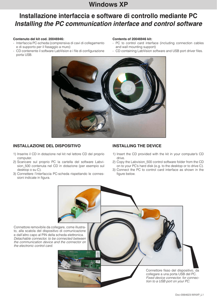 Windows XP Installazione interfaccia e software di controllo mediante PC Installing the PC communication interface and control software Contenuto del kit cod. 20046946: - Interfaccia PC-scheda (comprensiva di cavi di collegamento e di supporto per il fissaggio a muro) - CD contenente il software LabVision e i file di configurazione porta USB. Contents of 20046946 kit: - PC to control card interface (including connection cables and wall mounting support) - CD containing LabVision software and USB port driver files. INSTALLAZIONE DEL DISPOSITIVO INSTALLING THE DEVICE 1)Inserire il CD in dotazione nel kit nel lettore CD del proprio computer. 2)Scaricare sul proprio PC la cartella del software Labvision_500 contenuta nel CD in dotazione (per esempio sul desktop o su C). 3)Connettere l’interfaccia PC-scheda rispettando le connessioni indicate in figura. 1)Insert the CD provided with the kit in your computer’s CD drive. 2) Copy the Labvision_500 control software folder from the CD on to your PC’s hard disk (e.g. to the desktop or to drive C). 3)Connect the PC to control card interface as shown in the figure below. Connettore removibile da collegare, come illustrato, alla scatola del dispositivo di comunicazione e dall’altro capo al PIN della scheda elettronica. Detachable connector, to be connected between the communication device and the connector on the electronic control card. Connettore fisso del dispositivo, da collegare a una porta USB del PC. Fixed device connector, for connection to a USB port on your PC. Doc-0064623-WINXP_L1 4)Configurare la porta USB utilizzata per la connessione all’interfaccia di comunicazione PC-scheda. Per questo è necessario caricare il file del driver contenuto nel CD nella cartella USB_driver seguendo la procedura illustrata qui sotto: 4)Configure the USB port you intend to use for the PC to control card communications interface. To do so, you need to load the driver from the CD into the USB_driver folder. Proceed as follows: - Appena dopo il collegamento dell’interfaccia di comunicazione PC-scheda, ad una qualsiasi delle porte USB libere del proprio PC, appare la schermata riportata di fianco. - As soon as you connect the PC to control card interface to any free USB port on your PC, the dialog box shown alongside appears. - Alcuni secondi dopo apparirà l’immagine “Installazione guidata Nuovo hardware”; premere “Avanti>”. - In another few seconds, the “Found New Hardware Wizard” dialog box appears. Click “Next>”. - Apparirà la nuova schermata dell’Installazione guidata; selezionare il punto “Cerca il miglior driver per la periferica (scelta consigliata)” e poi premere di nuovo “Avanti>”. - The next dialog box appears. Check the “Search for the best driver for this hardware (recommended)” radio button and click “Next>”. - Apparirà la schermata “Aggiornamento guidato driver di periferica”. Selezionare il percorso opzionale di ricerca “Unità CD ROM”. Premere di nuovo “Avanti>”. - The “Hardware Update Wizard” dialog box appears. Check the “CD-ROM” checkbox. Click “Next>”. - Apparirà la nuova schermata “Aggiornamento guidato driver di periferica” che comunica l’individuazione del file del driver ftd2xx.inf nel CD ROM. Premere di nuovo “Avanti>”. - The next “Hardware Update Wizard” dialog box appears, showing that the ftd2xx.inf driver file has been found on the CD ROM. Click “Next>”. - In ultimo appare la schermata di fianco riportata, che comunica il completamento dell’Aggiornamento guidato del driver di configurazione della porta USB. Premere “Fine”. - The dialog box shown alongside appears, announcing that the USB hardware driver has been installed successfully. Click “Finish”.