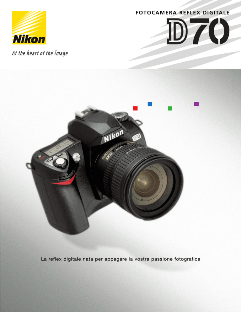 F O T O C A M E R A R E F L E X D I G I TA L E La reflex digitale nata per appagare la vostra passione fotografica Total Imaging System Nikon Risposta Rapida Nuovi Vari-Program Digitali Colori fedeli e vivaci Slitta flash Regolazione diottrie Modo di scatto/Formattazione AE-L/AF-L Selettore dei modi Multi-selettore I comandi, pratici e intuitivi, includono un Selettore di Modalità per l’accesso diretto ai Vari-Program Digitali Bracketing Visione play Ghiera principale Menu Sportello feritoia card Miniature/Sensibilità Protezione file Bil. bianco/Aiuti Blocco area messa a fuoco Invio/Qualità Immagine Monitor LCD da 1.8" Cancellazione Caratteristiche avanzate, alte prestazioni e superba qualità: la nuova reflex digitale Nikon D70 vi offre tutto. Insieme alla potenza Nikon! Sensore CCD formato Nikon DX da 6.1 megapixel, avanzate procedure di elaborazione dell’immagine digitale, ottiche Nikkor: gli ingredienti base per foto vivaci e piene di dettagli. Il perfetto abbinamento tra la tecnologia fotografica e quella digitale offre la prontezza di risposta per catturare ogni azione. Risultati straordinari grazie al bilanciamento del bianco accurato, alla misurazione esposimetrica di precisione e ai controlli di colore e contrasto che riproducono ogni sfumatura e dettaglio. Gli obiettivi Nikkor, il flash incorporato i-TTL, il software Nikon Capture contribuiscono ad assicurare versatilità d’uso e libertà creativa. Comodità e praticità d’uso tutte da godere Al cuore delle grandi foto Design ergonomico significa in primo luogo che il corpo camera compatto e leggero della D70 “cade” bene in mano, con i comandi accuratamente posizionati per un facile accesso e un impiego intuitivo. Il mirino reflex a proiezione arretrata offre un elevato ingrandimento per rendere sempre piacevole la composizione dell’inquadratura. L’ampio e luminoso monitor LCD visualizza i menu con caratteri e simboli più grandi, e durante il playback le foto riprese in formato verticale vengono ruotate automaticamente. L’efficiente batteria ricaricabile agli ioni di Litio offre tutta l’energia che serve per eseguire, con una singola carica, centinaia e centinaia di riprese. La D70 è equipaggiata con un sensore CCD formato Nikon DX, capace di catturare immagini con una risoluzione pari a 6.1 megapixel effettivi, per una ricchezza di dettagli inimmaginabile. Un chip LSI allo stato dell’arte, programmato con gli algoritmi di ultimissima generazione, è il cuore del sistema di elaborazione dell’immagine digitale e insieme di ottimizzazione della qualità e delle prestazioni. Ad esso è anche demandato il controllo del bilanciamento del bianco automatico, delle regolazioni automatiche di contrasto e colore, e della funzione di contenimento del “rumore di fondo” digitale che può manifestarsi nelle esposizioni prolungate. L’abilità di fornire risultati sempre prevedibili La D70 offre un riuscitissimo mix tra controllo personale e funzionamento automatizzato, che vi aiuta ad ottenere risultati di alto livello anche nelle condizioni di ripresa più complesse. I sette nuovi Vari-Program Digitali sono l’ultima parola per quanto concerne l’ottimizzazione automatica di tutti i parametri di ripresa - bilanciamento del bianco, nitidezza, contrasto, colore, saturazione, tonalità - in funzione di una resa brillante e vivace. Ad esempio, il programma Ritratto riproduce i più delicati toni dell’incarnato con un controllo selettivo della sfocatura dello sfondo, per assicurare il miglior risalto al soggetto. Gli altri programmi tematici sono: Auto, Paesaggio, Primo piano, Sport, Paesaggio in notturna e Ritratto Notturno. Una qualità d’immagine fuori del comune inizia da una perfetta esposizione, con il determinante contribuito dei controlli automatici di bilanciamento del bianco e Prestazioni top: il piacere di fotografare ai massimi livelli Non appena accesa, la D70 è subito pronta alla ripresa. Azionate il pulsante di scatto, e vi risponderà senza la minima esitazione. L’elaborazione delle immagini e la loro registrazione sulla scheda di memoria CompactFlash sono altrettanto rapide, anche se si fa uso del formato file NEF(RAW) compresso che permette di immagazzinare un maggior numero di foto di alta qualità. In un attimo, l’immagine viene visualizzata sul luminoso monitor LCD della D70. Qualunque sia la situazione di luminosità, l’autofocus Nikon Multi-CAM900 su 5 aree assicura una messa a fuoco velocissima e precisa. E inoltre, grazie ad un buffer di memoria temporanea particolarmente capace, la D70 è in grado di catturare fino a 12 foto (JPEG Normale-L) alla cadenza di 3 fotogrammi al secondo. Nessun vincolo al talento espressivo contrasto. La D70 offre tre modalità di misurazione TTL, compreso l’affermato sistema Nikon Color Matrix 3D con sensore RGB da 1005 pixel. Ad esso si aggiungono la misurazione Semi-spot (ponderata centrale) e quella Spot selettiva. La selezione della sensibilità copre le equivalenze ISO comprese tra i valori 200 e 1600: come dire ogni opportunità di adattamento alle variazioni di luminosità. I tempi di posa, che spaziano da 30 interi secondi a 1/8000, assicurano un pieno controllo creativo, mentre la funzione auto-bracketing contribuisce a “centrare” il risultato prefissato. Il lampeggiatore incorporato con funzionamento in Fill-Flash a bilanciamento automatico i-TTL, è in grado di sincronizzare l’emissione fino a 1/500 sec., assicurando così risultati squisitamente professionali nell’impiego del lampo di schiarita in luce diurna. Ogni fotografia inizia da un obiettivo, e in questi termini nessuno eguaglia le prestazioni degli AF Nikkor. Dal Fisheye 10.5mm f/2.8 con un campo di 180° fino al super-tele da 600mm, l’intera ed esclusiva gamma degli zoom e delle focali fisse Nikkor è realizzata per abbinarsi in modo ideale al bagaglio funzionale della D70. Per riprese flash di straordinaria efficacia, la D70 mette a disposizione del fotografo un