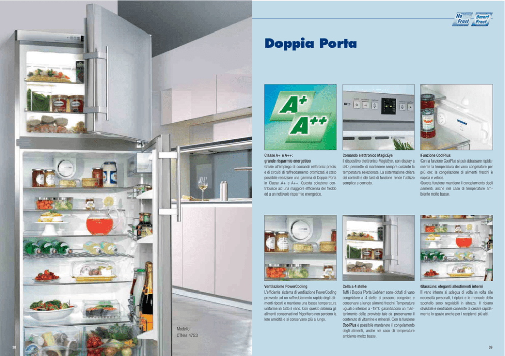 Doppia Porta Modello: CTNes 4753 38 Classe A+ e A++: grande risparmio energetico Grazie all’impiego di comandi elettronici precisi e di circuiti di raffreddamento ottimizzati, è stato possibile realizzare una gamma di Doppia Porta in Classe A+ e A++. Questa soluzione contribuisce ad una maggiore efficienza del freddo ed a un notevole risparmio energetico. Comando elettronico MagicEye Il dispositivo elettronico MagicEye, con display a LED, permette di mantenere sempre costante la temperatura selezionata. La sistemazione chiara dei controlli e dei tasti di funzione rende l’utilizzo semplice e comodo. Funzione CoolPlus Con la funzione CoolPlus si può abbassare rapidamente la temperatura del vano congelatore per più ore: la congelazione di alimenti freschi è rapida e veloce. Questa funzione mantiene il congelamento degli alimenti, anche nel caso di temperature ambiente molto basse. Ventilazione PowerCooling L’efficiente sistema di ventilazione PowerCooling provvede ad un raffreddamento rapido degli alimenti riposti e mantiene una bassa temperatura uniforme in tutto il vano. Con questo sistema gli alimenti conservati nel frigorifero non perdono la loro umidità e si conservano più a lungo. Cella a 4 stelle Tutti i Doppia Porta Liebherr sono dotati di vano congelatore a 4 stelle: si possono congelare e conservare a lungo alimenti freschi. Temperature uguali o inferiori a -18°C garantiscono un mantenimento delle provviste tale da preservarne il contenuto di vitamine e minerali. Con la funzione CoolPlus è possibile mantenere il congelamento degli alimenti, anche nel caso di temperature ambiente molto basse. GlassLine: eleganti allestimenti interni Il vano interno si adegua di volta in volta alle necessità personali, i ripiani e le mensole dello sportello sono regolabili in altezza. Il ripiano divisibile e rientrabile consente di creare rapidamente lo spazio anche per i recipienti più alti. 39 Doppia porta – larghezza 75 e 60 cm Classe A+ e A++: grande risparmio energetico Grazie all’impiego di comandi elettronici precisi e di circuiti di raffreddamento ottimizzati, è stato possibile realizzare una gamma di Doppia Porta in Classe A+ e A++. Questa soluzione contribuisce ad una maggiore efficienza del freddo ed a un notevole risparmio energetico. Comando elettronico · MagicEye con doppio display a LED della temperatura per il vano frigorifero ed il vano congelatore NoFrost (CTNes 4753) · MagicEye con display a LED della temperatura per il vano frigorifero (eccetto CTNes 4753) · Regolazione della temperatura per il vano frigorifero e per il vano congelatore NoFrost (CTNes 4753) · Regolazione della temperatura per il vano frigorifero (eccetto CTNes 4753) · Funzione di congelamento rapido SuperFrost, temporizzata (65 ore) · Allarme ottico ed acustico in caso di innalzamento indesiderato della temperatura (CTNes 4753 e CTN(esf) 3113) · Allarme acustico porta aperta (CTNes 4753 e CTN(esf) 3113) · Spie luminose di controllo per funzionamento, allarme e SuperFrost Comando elettronico MagicEye Il dispositivo elettronico MagicEye, con display a LED, permette di mantenere sempre costante la temperatura selezionata. La sistemazione chiara dei controlli e dei tasti di funzione rende l’utilizzo semplice e comodo. Mensole Comfort GlassLine Le porte dei frigoriferi Liebherr della gamma Comfort sono dotate di eleganti mensole Comfort GlassLine. In vetro satinato e con barra di supporto in acciaio, queste nuove mensole sono facilmente riposizionabili all’interno della porta e garantiscono la massima comodità di utilizzo. Vano frigorifero · Sbrinamento automatico · Ventilazione PowerCooling per una distribuzione uniforme della temperatura · Ripiani GlassLine - 1 divisibile e rientrabile · Controporta GlassLine con portabottiglie e portavasetti (CTNes 4753) · Controporta Comfort GlassLine con mensole in vetro (eccetto CTNes 4753) · Mensola portabottiglie (CTNes 4753) · Vano interno con angoli arrotondati e colonne laterali per riposizionare i ripiani · Illuminazione interna · Cassetti per frutta e verdura Vano congelatore · NoFrost: Sbrinamento automatico (CTNes 4753 e CTN(esf) 3113) · SmartFrost: Sbrinamento facilitato grazie al vano interno liscio e semplice da pulire · Scomparto per il ghiaccio con vassoio per cubetti di ghiaccio Dotazioni di serie · SwingLine · Maniglia tubolare con meccanismo di apertura integrato · Allineabile alla parete · Piedini anteriori regolabili in altezza, rotelle e maniglie posteriori integrate per il trasporto · Incernieratura porte reversibile Doppia porta – larghezza 75 e 60 cm CTNes 4753 Premium CTNesf 3113 Comfort CTPesf 3223 Comfort CTP 3223 Comfort CTPesf 2913 Comfort CTP 2913 Comfort Volume lordo/utile Vano frigorifero Vano congelatore Classe di efficienza energetica (kWh in 365 giorni) Classe climatica Dimensioni esterne in cm (A/L/P) Circuiti raffreddanti regolabili individualmente Esecuzione 335/329 l 118/84 l m (339,5 kWh) SN-T 186/75/63 2 - DuoCooling Porte SmartSteel in acciaio antimpronta Fianchi in acciaio satinato 242/236 l 62/60 l m (266 kWh) SN-ST 172/60/63 1 Porte SmartSteel in acciaio antimpronta Fianchi color acciaio 242/236 l 72/71 l n (197 kWh) SN-T 169/60/63 1 Porte SmartSteel in acciaio antimpronta Fianchi color acciaio 242/236 l 72/71 l n (197 kWh) SN-T 169/60/63 1 Bianco 223/217 l 60/59 l m (248 kWh) SN-ST 155/60/63 1 Porte SmartSteel in acciaio antimpronta Fianchi color acciaio 223/217 l 60/59 l m (248 kWh) SN-ST 155/60/63 1 Bianco Disponibile anche in bianco: 40 CTN 3113 41 Doppia Porta – larghezza 55 cm Mensole Comfort GlassLine Le porte dei frigoriferi Liebherr della gamma Comfort sono dotate di eleganti mensole Comfort GlassLine. In vetro satinato e con barra di supporto in acciaio, queste nuove mensole sono facilmente riposizionabili all’interno della porta e garantiscono la massima comodità di utilizzo. Comando elettromeccanico · Regolazione della temperatura per il vano frigorifero · Funzione