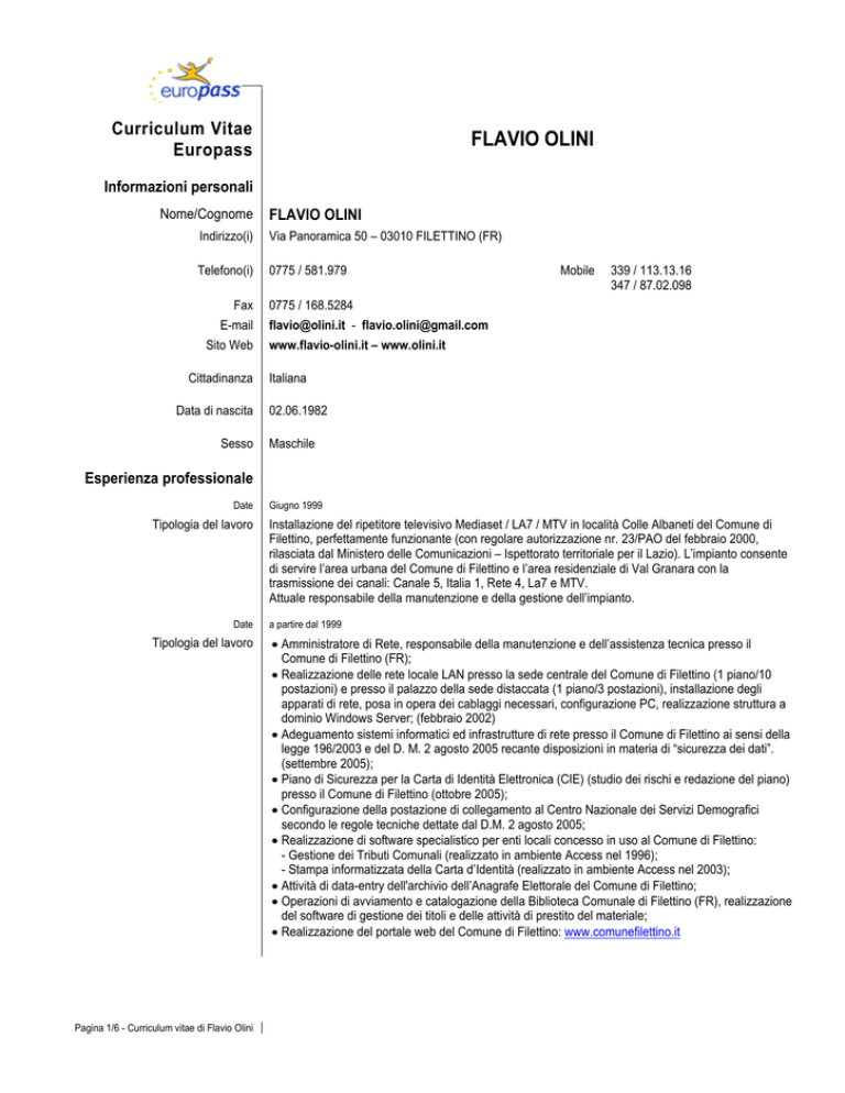 Curriculum Vitae Europass FLAVIO OLINI Informazioni personali Nome/Cognome FLAVIO OLINI Indirizzo(i) Via Panoramica 50 – 03010 FILETTINO (FR) Telefono(i) 0775 / 581.979 Fax E-mail Sito Web Cittadinanza Data di nascita Sesso Mobile 339 / 113.13.16 347 / 87.02.098 0775 / 168.5284 [email protected] - [email protected] www.flavio-olini.it – www.olini.it Italiana 02.06.1982 Maschile Esperienza professionale Date Tipologia del lavoro Date Tipologia del lavoro Pagina 1/6 - Curriculum vitae di Flavio Olini Giugno 1999 Installazione del ripetitore televisivo Mediaset / LA7 / MTV in località Colle Albaneti del Comune di Filettino, perfettamente funzionante (con regolare autorizzazione nr. 23/PAO del febbraio 2000, rilasciata dal Ministero delle Comunicazioni – Ispettorato territoriale per il Lazio). L’impianto consente di servire l’area urbana del Comune di Filettino e l’area residenziale di Val Granara con la trasmissione dei canali: Canale 5, Italia 1, Rete 4, La7 e MTV. Attuale responsabile della manutenzione e della gestione dell’impianto. a partire dal 1999 Amministratore di Rete, responsabile della manutenzione e dell’assistenza tecnica presso il Comune di Filettino (FR); Realizzazione delle rete locale LAN presso la sede centrale del Comune di Filettino (1 piano/10 postazioni) e presso il palazzo della sede distaccata (1 piano/3 postazioni), installazione degli apparati di rete, posa in opera dei cablaggi necessari, configurazione PC, realizzazione struttura a dominio Windows Server; (febbraio 2002) Adeguamento sistemi informatici ed infrastrutture di rete presso il Comune di Filettino ai sensi della legge 196/2003 e del D. M. 2 agosto 2005 recante disposizioni in materia di “sicurezza dei dati”. (settembre 2005); Piano di Sicurezza per la Carta di Identità Elettronica (CIE) (studio dei rischi e redazione del piano) presso il Comune di Filettino (ottobre 2005); Configurazione della postazione di collegamento al Centro Nazionale dei Servizi Demografici secondo le regole tecniche dettate dal D.M. 2 agosto 2005; Realizzazione di software specialistico per enti locali concesso in uso al Comune di Filettino: - Gestione dei Tributi Comunali (realizzato in ambiente Access nel 1996); - Stampa informatizzata della Carta d’Identità (realizzato in ambiente Access nel 2003); Attività di data-entry dell'archivio dell’Anagrafe Elettorale del Comune di Filettino; Operazioni di avviamento e catalogazione della Biblioteca Comunale di Filettino (FR), realizzazione del software di gestione dei titoli e delle attività di prestito del materiale; Realizzazione del portale web del Comune di Filettino: www.comunefilettino.it Date Tipologia del lavoro Date Tipologia del lavoro Data Tipologia del lavoro Date Tipologia del lavoro Date Tipologia del lavoro Data Tipologia del lavoro Data Tipologia del lavoro Data Tipologia del lavoro Data Tipologia del lavoro Data Settembre 2001 Realizzazione del sistema informatico presso la ditta Quattrociocchi Pelli srl di Guarcino (FR): Assemblaggio e installazione dei PC presso la sede e realizzazione ad-hoc del software di gestione aziendale, in ambiente Access, per il trattamento di particolari situazioni relative all’attività svolta dall’azienda. Realizzazione del software di contabilità, magazzino e fatturazione. Settembre 2001 Realizzazione del software di contabilità, magazzino e fatturazione ad-hoc (in ambiente Access) presso l’ingrosso alimentare Olini snc di Roma. a partire dal 1998 Responsabile dell’impaginazione e della realizzazione grafica del periodico quadrimestrale “Flash da Filettino” e realizzazione del sito internet www.flashdafilettino.3000.it Gennaio 2002 Attività di informatizzazione delle attività della ditta Autoriparazioni Consalvi Tommaso di Filettino (FR): installazione personal computer in sede, implementazione software di gestione aziendale e software specialistico relativo all’attività svolta dall’azienda. Dal gennaio 2002 responsabile della manutenzione e dell’assistenza tecnica. Realizzazione del sito internet dell’azienda: www.consalvitommaso.it Maggio 2003 Installazione dell’impianto di televisione satellitare presso la Scuola Primaria di Filettino (FR) nell’ambito dell’adeguamento tecnologico per la realizzazione del programma Divertinglese promosso dal Ministero dell’Istruzione. Giugno 2004 Realizzazione del sito internet dello Snowboard Club “Giacomains” di Campo Staffi – Filettino (FR) Collaborazione continuativa con il club per le attività di promozione degli eventi e realizzazione grafica delle brochure e dei manifesti pubblicitari: www.snowclubcampostaffi.it dal 1999 al 2004 Attività di consulenza tecnica/elettronica riguardante i sistemi ski-pass e i sistemi informatici presso la società I.T.I.F. di Campo Staffi / Filettino (FR). Successiva realizzazione di software applicativo per la gestione di particolari situazioni tecniche relative alla tipologia dell’azienda. Realizzazione del sito ufficiale della stazione sciistica: www.campostaffi.it Maggio 2005 Realizzazione del sito internet dell’Ostello “Il girasole” di Filettino (FR); Attività di promozione dell’albergo tramite web: www.ostellogirasole.it Giugno 2005 Realizzazione dell’impianto TV centralizzato (satellitare + terrestre) presso il Condominio Residence “Daniela” di Filettino (FR) – 4 piani / 64 appartamenti ca; Realizzazione dell’impianto TV centralizzato (satellitare + terrestre) presso il Condominio Residence “Milena” di Filettino (FR) – 4 piani / 64 appartamenti ca; Realizzazione dell’impianto TV centralizzato terrestre presso il Condominio Belvedere di Filettino (FR), 4 piani / 32 appartamenti ca; Rifacimento dell’impianto TV centralizzato misto SAT/Terrestre presso il Condominio “Poggio Verde” – Loc. Curva Femia – Filettino (FR) a partire dal 2004 Responsabile addetto all’Ufficio Direzione Impianti di Risalita di Campo Staffi. Collaborazione tecnica con la societ