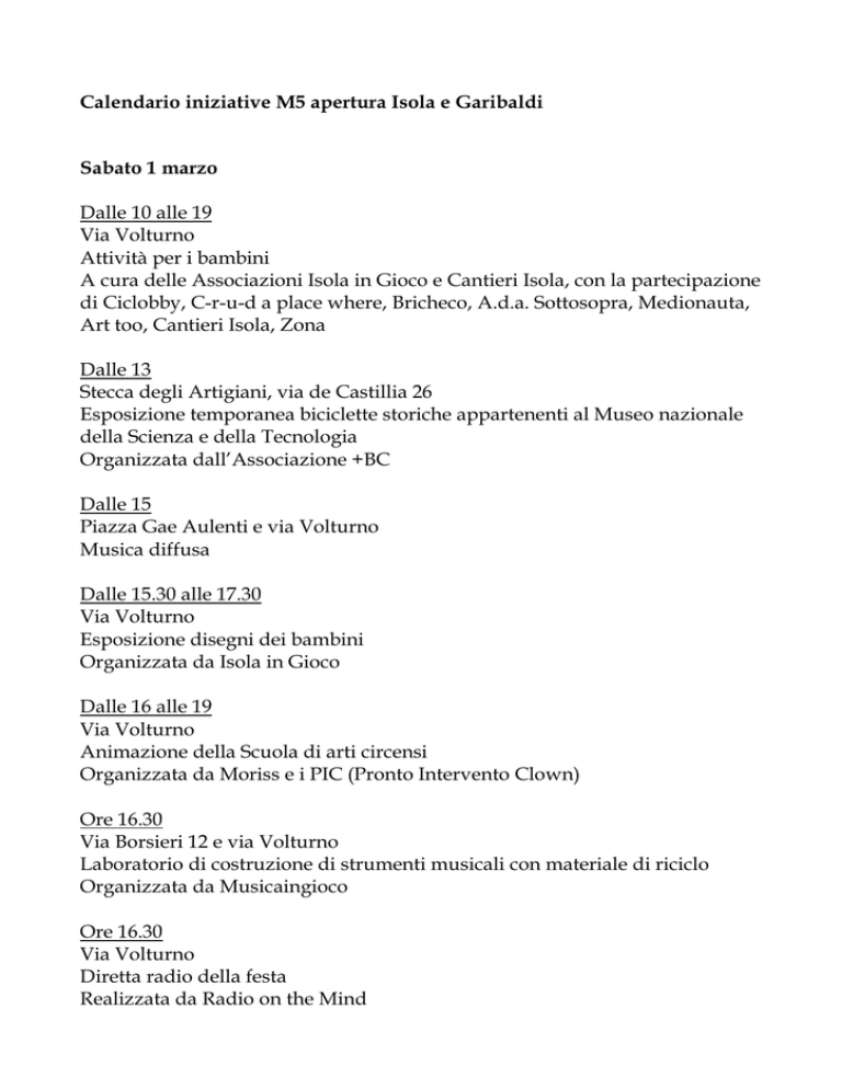 Calendario iniziative M5 apertura Isola e Garibaldi Sabato 1 marzo Dalle 10 alle 19 Via Volturno Attività per i bambini A cura delle Associazioni Isola in Gioco e Cantieri Isola, con la partecipazione di Ciclobby, C-r-u-d a place where, Bricheco, A.d.a. Sottosopra, Medionauta, Art too, Cantieri Isola, Zona Dalle 13 Stecca degli Artigiani, via de Castillia 26 Esposizione temporanea biciclette storiche appartenenti al Museo nazionale della Scienza e della Tecnologia Organizzata dall’Associazione +BC Dalle 15 Piazza Gae Aulenti e via Volturno Musica diffusa Dalle 15.30 alle 17.30 Via Volturno Esposizione disegni dei bambini Organizzata da Isola in Gioco Dalle 16 alle 19 Via Volturno Animazione della Scuola di arti circensi Organizzata da Moriss e i PIC (Pronto Intervento Clown) Ore 16.30 Via Borsieri 12 e via Volturno Laboratorio di costruzione di strumenti musicali con materiale di riciclo Organizzata da Musicaingioco Ore 16.30 Via Volturno Diretta radio della festa Realizzata da Radio on the Mind Dalle 17 alle 21 Museo Interattivo del Cinema Tre film cult con protagonista la metropolitana: ore 17 ‘Zazie nel metro’ (Malle), ore 19 ‘I guerrieri della notte’ (Hill) ore 21 ‘L’ultimo metrò’ (Truffaut). Con biglietto Atm le proiezioni saranno accessibili al costo di 4 euro. Ore 17.30 Via Volturno Il Consiglio di Zona premia i quattro bambini vincitori del concorso di scrittura sulla mobilità sostenibile Ore 17.30 Via Volturno Merenda all’aperto Organizzata dall’Associazione Aiab Dalle 17.30 alle 18 Via De Castillia Animazione musicale Organizzata da Arci Metissage Dalle 17.30 alle 18 Via Volturno Spettacolo di Capoeira e percussioni Organizzato dall’Associazione Italiana di Capoeira da Angola di mestre Baixinho Dalle 19 alle 21 Via De Castilla angolo Borsieri Video installazioni, immagini dedicate alla mobilità sostenibile e al verde urbano Organizzate da aMAZElab e Green island Ore 21 Piazza Gae Aulenti Spettacolo di danze acrobatiche dei Kataklò Tutto il giorno sabato e domenica Teatro del Buratto “Il viola non porta sfortuna ….ma porta a teatro”: gli spettatori che presenteranno un biglietto Atm vidimato per la giornata alla fermata Isola, avranno diritto a un ingresso a prezzo ridotto (10 euro, anziché 20) per lo spettacolo in programmazione al Teatro Verdi (1-2 marzo “Il contrabbasso “ di P. Suskind, produzione Teatro del Buratto). Pomeriggio di sabato e domenica Teatro Verdi Aperto per visite del pubblico. Informali visite guidate, per grandi e bambini, alla scoperta, tra aneddoti e citazioni, del ‘dietro le quinte’ negli angoli più segreti del teatro, che racconta la sua lunga e illustre storia: il centenario è stato celebrato nel 2013. Domenica 2 marzo Dalle 14 alle 18 Cavalcavia Bussa Campetto di calcio Videoinstallazioni (organizzato da Green Island e aMAZElab) Spettacoli musicali (organizzato da Teatro Verdi / Teatro del Buratto) Attività circensi (organizzato da Moriss e i PIC-Pronto Intervento Clown), Circuito gimkana ciclabile (organizzato da Ciclobby) Presentazione elaborati degli studenti sul lavoro svolto in quartiere (organizzato da IUAV) Costruzione pista di biglie con sponde in legno (organizzato da Bricheco) Ore 14 Cavalcavia Bussa Presentazione del lavoro del Percorso Partecipato sui progetti “Cavalcavia Bussa” e “Centro Civico” Organizzato dai cittadini del Percorso Partecipato Cavalcavia Bussa Ore 15 Via Boltraffio angolo via Volturno Spettacolo di Clown ‘Circo Oblack’ Organizzato dalla Scuola di arti circensi e teatrali Ore 16.30 Via Boltraffio ‘Arriva la Lilla e l’Isola balla’, swing italiano dal vivo con i Lady Dillinger Organizzato da DUC Isola Tutto il giorno Via Borsieri “Fiera della creatività locale” con mercatino dell’artigianato Organizzato da DUC Isola Tutto il giorno Stecca degli Artigiani, via de Castillia 26 Esposizione temporanea biciclette storiche appartenenti al Museo nazionale della Scienza e della Tecnologia organizzata dall’Associazione +BC In caso di pioggia alcune iniziative saranno spostate nel tendone di Piazza Gae Aulenti, dietro la pista di pattinaggio.