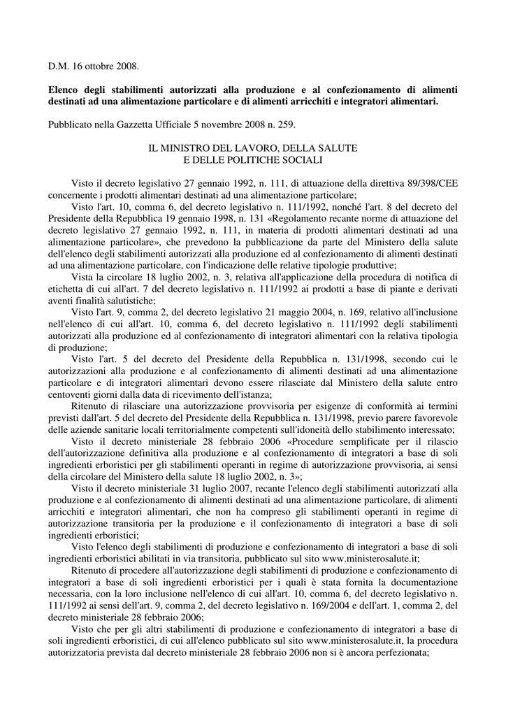 D.M. 16 ottobre 2008. Elenco degli stabilimenti autorizzati alla produzione e al confezionamento di alimenti destinati ad una alimentazione particolare e di alimenti arricchiti e integratori alimentari. Pubblicato nella Gazzetta Ufficiale 5 novembre 2008 n. 259. IL MINISTRO DEL LAVORO, DELLA SALUTE E DELLE POLITICHE SOCIALI Visto il decreto legislativo 27 gennaio 1992, n. 111, di attuazione della direttiva 89/398/CEE concernente i prodotti alimentari destinati ad una alimentazione particolare; Visto l'art. 10, comma 6, del decreto legislativo n. 111/1992, nonché l'art. 8 del decreto del Presidente della Repubblica 19 gennaio 1998, n. 131 «Regolamento recante norme di attuazione del decreto legislativo 27 gennaio 1992, n. 111, in materia di prodotti alimentari destinati ad una alimentazione particolare», che prevedono la pubblicazione da parte del Ministero della salute dell'elenco degli stabilimenti autorizzati alla produzione ed al confezionamento di alimenti destinati ad una alimentazione particolare, con l'indicazione delle relative tipologie produttive; Vista la circolare 18 luglio 2002, n. 3, relativa all'applicazione della procedura di notifica di etichetta di cui all'art. 7 del decreto legislativo n. 111/1992 ai prodotti a base di piante e derivati aventi finalità salutistiche; Visto l'art. 9, comma 2, del decreto legislativo 21 maggio 2004, n. 169, relativo all'inclusione nell'elenco di cui all'art. 10, comma 6, del decreto legislativo n. 111/1992 degli stabilimenti autorizzati alla produzione ed al confezionamento di integratori alimentari con la relativa tipologia di produzione; Visto l'art. 5 del decreto del Presidente della Repubblica n. 131/1998, secondo cui le autorizzazioni alla produzione e al confezionamento di alimenti destinati ad una alimentazione particolare e di integratori alimentari devono essere rilasciate dal Ministero della salute entro centoventi giorni dalla data di ricevimento dell'istanza; Ritenuto di rilasciare una autorizzazione provvisoria per esigenze di conformità ai termini previsti dall'art. 5 del decreto del Presidente della Repubblica n. 131/1998, previo parere favorevole delle aziende sanitarie locali territorialmente competenti sull'idoneità dello stabilimento interessato; Visto il decreto ministeriale 28 febbraio 2006 «Procedure semplificate per il rilascio dell'autorizzazione definitiva alla produzione e al confezionamento di integratori a base di soli ingredienti erboristici per gli stabilimenti operanti in regime di autorizzazione provvisoria, ai sensi della circolare del Ministero della salute 18 luglio 2002, n. 3»; Visto il decreto ministeriale 31 luglio 2007, recante l'elenco degli stabilimenti autorizzati alla produzione e al confezionamento di alimenti destinati ad una alimentazione particolare, di alimenti arricchiti e integratori alimentari, che non ha compreso gli stabilimenti operanti in regime di autorizzazione transitoria per la produzione e il confezionamento di integratori a base di soli ingredienti erboristici; Visto l'elenco degli stabilimenti di produzione e confezionamento di integratori a base di soli ingredienti erboristici abilitati in via transitoria, pubblicato sul sito www.ministerosalute.it; Ritenuto di procedere all'autorizzazione degli stabilimenti di produzione e confezionamento di integratori a base di soli ingredienti erboristici per i quali è stata fornita la documentazione necessaria, con la loro inclusione nell'elenco di cui all'art. 10, comma 6, del decreto legislativo n. 111/1992 ai sensi dell'art. 9, comma 2, del decreto legislativo n. 169/2004 e dell'art. 1, comma 2, del decreto ministeriale 28 febbraio 2006; Visto che per gli altri stabilimenti di produzione e confezionamento di integratori a base di soli ingredienti erboristici, di cui all'elenco pubblicato sul sito www.ministerosalute.it, la procedura autorizzatoria prevista dal decreto ministeriale 28 febbraio 2006 non si è ancora perfezionata; Vista la circolare 6 marzo 2008, n. 4075-P, per quanto concerne l'inclusione nell'elenco di cui all'art. 10, comma 6, del decreto legislativo n. 111/1992 degli stabilimenti di produzione e confezionamento di alimenti arricchiti con vitamine e minerali ricadenti nel campo di applicazione del regolamento (CE) 1925/2006; Visto il decreto 23 maggio 2008 relativo alla «Delega di attribuzioni del Ministro del lavoro, della salute e delle politiche sociali, per taluni atti di competenza dell'Amministrazione, al Sottosegretario di Stato on. Francesca Martini»; DECRETA: Art. 1. 1. In attuazione delle norme citate in premessa: a) l'allegato I del presente decreto contiene l'elenco degli stabilimenti autorizzati, alla data del 30 giugno 2008, alla produzione ed al confezionamento di alimenti destinati ad una alimentazione particolare, di alimenti arricchiti con vitamine e minerali ricadenti nel campo di applicazione del regolamento (CE) 1925/2006 e di integratori alimentari; b) l'allegato II del presente decreto contiene l'elenco degli stabilimenti autorizzati alla produzione di integratori alimentari a base di soli ingredienti erboristici. Art. 2. 1. Gli stabilimenti per i quali la procedura autorizzatoria prevista dal decreto ministeriale 28 febbraio 2006 non si è ancora perfezionata provvedono a trasmettere al Ministero del lavoro, della salute e delle politiche sociali, per il tramite delle ASL territorialmente competenti, la documentazione indicata in allegato al decreto ministeriale medesimo entro il 31 dicembre 2008. 2. Per evidenziare l'andamento della situazione fino al termine di cui al comma 1, il Ministero del lavoro, della salute e delle politiche sociali, a seguito della pubblicazione del presente decreto, aggiorna mensilmente l'elenco degli stabilimenti di produzione e confezionamento di integratori a base di soli ingredienti erboristici pubblicato sul sito www.ministerosalute.it, trasferendo in una distinta sezione quelli per i quali viene acquisita la documentazione necessaria per l'inclusione 