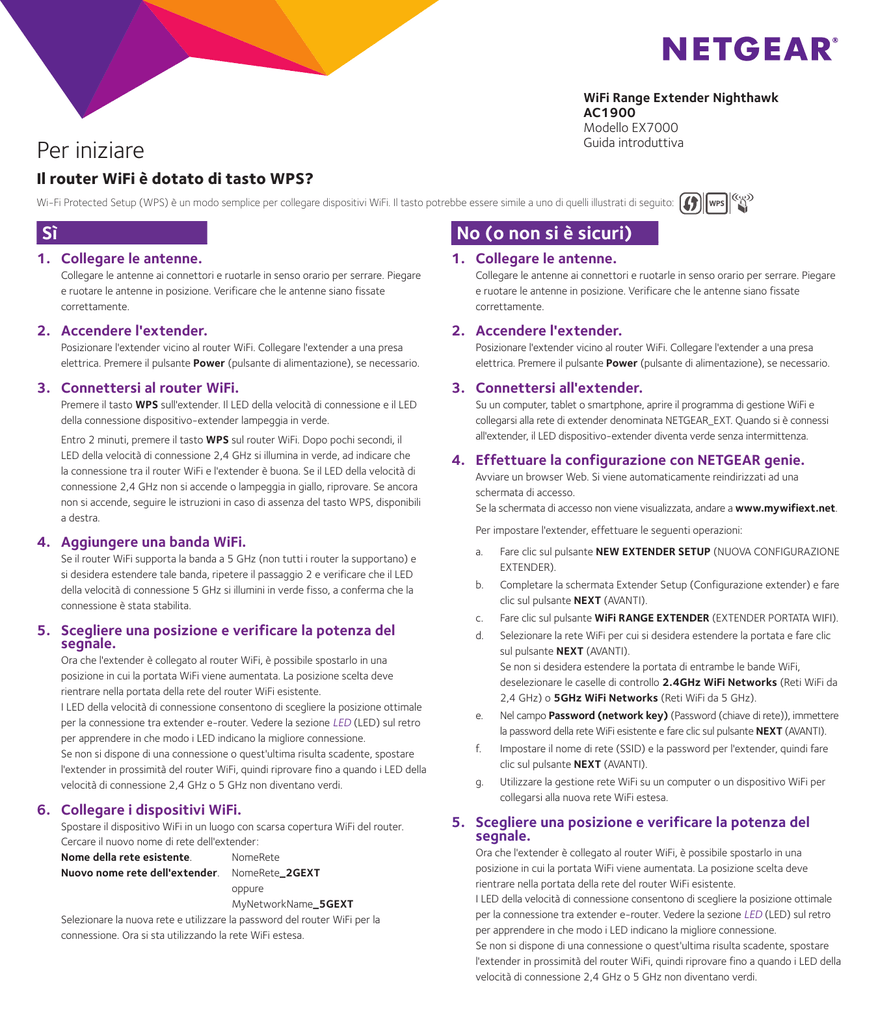 WiFi Range Extender Nighthawk AC1900 Modello EX7000 Guida introduttiva Per iniziare Il router WiFi è dotato di tasto WPS? Wi-Fi Protected Setup (WPS) è un modo semplice per collegare dispositivi WiFi. Il tasto potrebbe essere simile a uno di quelli illustrati di seguito: Sì No (o non si è sicuri) 1. Collegare le antenne. Collegare le antenne ai connettori e ruotarle in senso orario per serrare. Piegare e ruotare le antenne in posizione. Verificare che le antenne siano fissate correttamente. 2. Accendere l'extender. Posizionare l'extender vicino al router WiFi. Collegare l'extender a una presa elettrica. Premere il pulsante Power (pulsante di alimentazione), se necessario. 3. Connettersi al router WiFi. Premere il tasto WPS sull'extender. Il LED della velocità di connessione e il LED della connessione dispositivo-extender lampeggia in verde. Entro 2 minuti, premere il tasto WPS sul router WiFi. Dopo pochi secondi, il LED della velocità di connessione 2,4 GHz si illumina in verde, ad indicare che la connessione tra il router WiFi e l'extender è buona. Se il LED della velocità di connessione 2,4 GHz non si accende o lampeggia in giallo, riprovare. Se ancora non si accende, seguire le istruzioni in caso di assenza del tasto WPS, disponibili a destra. 4. Aggiungere una banda WiFi. Se il router WiFi supporta la banda a 5 GHz (non tutti i router la supportano) e si desidera estendere tale banda, ripetere il passaggio 2 e verificare che il LED della velocità di connessione 5 GHz si illumini in verde fisso, a conferma che la connessione è stata stabilita. 5. Scegliere una posizione e verificare la potenza del segnale. Ora che l'extender è collegato al router WiFi, è possibile spostarlo in una posizione in cui la portata WiFi viene aumentata. La posizione scelta deve rientrare nella portata della rete del router WiFi esistente. I LED della velocità di connessione consentono di scegliere la posizione ottimale per la connessione tra extender e‑router. Vedere la sezione LED (LED) sul retro per apprendere in che modo i LED indicano la migliore connessione. Se non si dispone di una connessione o quest'ultima risulta scadente, spostare l'extender in prossimità del router WiFi, quindi riprovare fino a quando i LED della velocità di connessione 2,4 GHz o 5 GHz non diventano verdi. 6. Collegare i dispositivi WiFi. Spostare il dispositivo WiFi in un luogo con scarsa copertura WiFi del router. Cercare il nuovo nome di rete dell'extender: Nome della rete esistente.NomeRete Nuovo nome rete dell'extender. NomeRete_2GEXT oppure MyNetworkName_5GEXT Selezionare la nuova rete e utilizzare la password del router WiFi per la connessione. Ora si sta utilizzando la rete WiFi estesa. 1. Collegare le antenne. Collegare le antenne ai connettori e ruotarle in senso orario per serrare. Piegare e ruotare le antenne in posizione. Verificare che le antenne siano fissate correttamente. 2. Accendere l'extender. Posizionare l'extender vicino al router WiFi. Collegare l'extender a una presa elettrica. Premere il pulsante Power (pulsante di alimentazione), se necessario. 3. Connettersi all'extender. Su un computer, tablet o smartphone, aprire il programma di gestione WiFi e collegarsi alla rete di extender denominata NETGEAR_EXT. Quando si è connessi all'extender, il LED dispositivo-extender diventa verde senza intermittenza. 4. Effettuare la configurazione con NETGEAR genie. Avviare un browser Web. Si viene automaticamente reindirizzati ad una schermata di accesso. Se la schermata di accesso non viene visualizzata, andare a www.mywifiext.net. Per impostare l'extender, effettuare le seguenti operazioni: a. Fare clic sul pulsante NEW EXTENDER SETUP (NUOVA CONFIGURAZIONE EXTENDER). b. Completare la schermata Extender Setup (Configurazione extender) e fare clic sul pulsante NEXT (AVANTI). c. Fare clic sul pulsante WiFi RANGE EXTENDER (EXTENDER PORTATA WIFI). d. Selezionare la rete WiFi per cui si desidera estendere la portata e fare clic sul pulsante NEXT (AVANTI). Se non si desidera estendere la portata di entrambe le bande WiFi, deselezionare le caselle di controllo 2.4GHz WiFi Networks (Reti WiFi da 2,4 GHz) o 5GHz WiFi Networks (Reti WiFi da 5 GHz). e. Nel campo Password (network key) (Password (chiave di rete)), immettere la password della rete WiFi esistente e fare clic sul pulsante NEXT (AVANTI). f. Impostare il nome di rete (SSID) e la password per l'extender, quindi fare clic sul pulsante NEXT (AVANTI). g. Utilizzare la gestione rete WiFi su un computer o un dispositivo WiFi per collegarsi alla nuova rete WiFi estesa. 5. Scegliere una posizione e verificare la potenza del segnale. Ora che l'extender è collegato al router WiFi, è possibile spostarlo in una posizione in cui la portata WiFi viene aumentata. La posizione scelta deve rientrare nella portata della rete del router WiFi esistente. I LED della velocità di connessione consentono di scegliere la posizione ottimale per la connessione tra extender e‑router. Vedere la sezione LED (LED) sul retro per apprendere in che modo i LED indicano la migliore connessione. Se non si dispone di una connessione o quest'ultima risulta scadente, spostare l'extender in prossimità del router WiFi, quindi riprovare fino a quando i LED della velocità di connessione 2,4 GHz o 5 GHz non diventano verdi. WiFi Range Extender Nighthawk AC1900 Modello EX7000 Guida introduttiva Hardware Pannello anteriore e laterale Pannello posteriore LED velocità di connessione a 2,4 GHz LED velocità di connessione a 5 GHz LED dispositivoextender LED porte Ethernet 1-5 LED USB Pulsante di ripristino Tasto WPS Connettore Porte Pulsante di dell'alimentazione Ethernet 1-5 alimentazione LED LED velocità di connessione a 2,4 GHz LED velocità di connessione a 5 GHz Porta USB 3.0 LED dispositivoextender LED porte Ethernet 1-5 LED USB Questo LED indica una connessione WiFi a 2,4 GHz tra l'extender e il router. Verde senza intermittenza. Segnale ottimo Giallo senza intermittenza. Segnale buono 