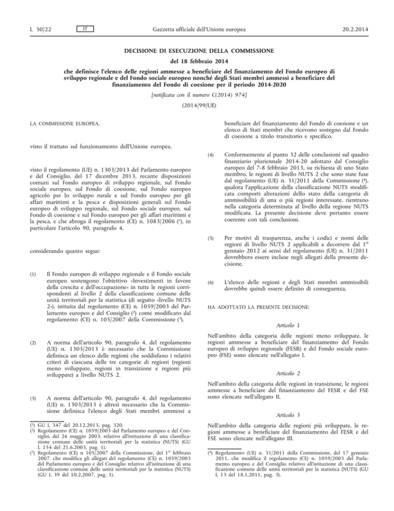 L 50/22 IT Gazzetta ufficiale dell’Unione europea 20.2.2014 DECISIONE DI ESECUZIONE DELLA COMMISSIONE del 18 febbraio 2014 che definisce l’elenco delle regioni ammesse a beneficiare del finanziamento del Fondo europeo di sviluppo regionale e del Fondo sociale europeo nonché degli Stati membri ammessi a beneficiare del finanziamento del Fondo di coesione per il periodo 2014-2020 [notificata con il numero C(2014) 974] (2014/99/UE) beneficiare del finanziamento del Fondo di coesione e un elenco di Stati membri che ricevono sostegno dal Fondo di coesione a titolo transitorio e specifico. LA COMMISSIONE EUROPEA, visto il trattato sul funzionamento dell’Unione europea, (4) Conformemente al punto 32 delle conclusioni sul quadro finanziario pluriennale 2014-20 adottato dal Consiglio europeo del 7-8 febbraio 2013, su richiesta di uno Stato membro, le regioni di livello NUTS 2 che sono state fuse dal regolamento (UE) n. 31/2011 della Commissione (4), qualora l’applicazione della classificazione NUTS modifi cata comporti alterazioni dello stato della categoria di ammissibilità di una o più regioni interessate, rientrano nella categoria determinata al livello della regione NUTS modificata. La presente decisione deve pertanto essere coerente con tali conclusioni. (5) Per motivi di trasparenza, anche i codici e nomi delle regioni di livello NUTS 2 applicabili a decorrere dal 1o gennaio 2012 ai sensi del regolamento (UE) n. 31/2011 dovrebbero essere incluse negli allegati della presente de cisione. (6) L’elenco delle regioni e degli Stati membri ammissibili dovrebbe quindi essere definito di conseguenza, visto il regolamento (UE) n. 1303/2013 del Parlamento europeo e del Consiglio, del 17 dicembre 2013, recante disposizioni comuni sul Fondo europeo di sviluppo regionale, sul Fondo sociale europeo, sul Fondo di coesione, sul Fondo europeo agricolo per lo sviluppo rurale e sul Fondo europeo per gli affari marittimi e la pesca e disposizioni generali sul Fondo europeo di sviluppo regionale, sul Fondo sociale europeo, sul Fondo di coesione e sul Fondo europeo per gli affari marittimi e la pesca, e che abroga il regolamento (CE) n. 1083/2006 (1), in particolare l’articolo 90, paragrafo 4, considerando quanto segue: (1) (2) (3) Il Fondo europeo di sviluppo regionale e il Fondo sociale europeo sostengono l’obiettivo «Investimenti in favore della crescita e dell’occupazione» in tutte le regioni corri spondenti al livello 2 della classificazione comune delle unità territoriali per la statistica (di seguito «livello NUTS 2»), istituita dal regolamento (CE) n. 1059/2003 del Par lamento europeo e del Consiglio (2) come modificato dal regolamento (CE) n. 105/2007 della Commissione (3). A norma dell’articolo 90, paragrafo 4, del regolamento (UE) n. 1303/2013 è necessario che la Commissione definisca un elenco delle regioni che soddisfano i relativi criteri di ciascuna delle tre categorie di regioni (regioni meno sviluppate, regioni in transizione e regioni più sviluppate) a livello NUTS 2. A norma dell’articolo 90, paragrafo 4, del regolamento (UE) n. 1303/2013 è altresì necessario che la Commis sione definisca l’elenco degli Stati membri ammessi a (1) GU L 347 del 20.12.2013, pag. 320. (2) Regolamento (CE) n. 1059/2003 del Parlamento europeo e del Con siglio, del 26 maggio 2003, relativo all’istituzione di una classifica zione comune delle unità territoriali per la statistica (NUTS) (GU L 154 del 21.6.2003, pag. 1). (3) Regolamento (CE) n 105/2007 della Commissione, del 1o febbraio 2007, che modifica gli allegati del regolamento (CE) n. 1059/2003 del Parlamento europeo e del Consiglio relativo all’istituzione di una classificazione comune delle unità territoriali per la statistica (NUTS) (GU L 39 del 10.2.2007, pag. 1). HA ADOTTATO LA PRESENTE DECISIONE: Articolo 1 Nell’ambito della categoria delle regioni meno sviluppate, le regioni ammesse a beneficiare del finanziamento del Fondo europeo di sviluppo regionale (FESR) e del Fondo sociale euro peo (FSE) sono elencate nell’allegato I. Articolo 2 Nell’ambito della categoria delle regioni in transizione, le regioni ammesse a beneficiare del finanziamento del FESR e del FSE sono elencate nell’allegato II. Articolo 3 Nell’ambito della categoria delle regioni più sviluppate, le re gioni ammesse a beneficiare del finanziamento del FESR e del FSE sono elencate nell’allegato III. (4) Regolamento (UE) n. 31/2011 della Commissione, del 17 gennaio 2011, che modifica il regolamento (CE) n. 1059/2003 del Parla mento europeo e del Consiglio relativo all’istituzione di una classi ficazione comune delle unità territoriali per la statistica (NUTS) (GU L 13 del 18.1.2011, pag. 3). 20.2.2014 IT Gazzetta ufficiale dell’Unione europea Articolo 4 Gli Stati membri ammessi a beneficiare del finanziamento del Fondo di coesione sono elencati nell’allegato IV. Articolo 5 Gli Stati membri ammessi a beneficiare del finanziamento del Fondo di coesione a titolo transitorio e specifico sono elencati nell’allegato V. Articolo 6 Gli Stati membri sono destinatari della presente decisione. Fatto a Bruxelles, il 18 febbraio 2014 Per la Commissione Johannes HAHN Membro della Commissione L 50/23 IT L 50/24 Gazzetta ufficiale dell’Unione europea 20.2.2014 ALLEGATO I Elenco delle regioni meno sviluppate a norma dell’articolo 1 NUTS 2010 (1) BG31 Северозападен (Severozapaden) BG32 Северен централен (Severen tsentralen) BG33 Североизточен (Severoiztochen) BG34 Югоизточен (Yugoiztochen) BG41 Югозападен (Yugozapaden) BG42 Южен централен (Yuzhen tsentralen) CZ02 Střední Čechy CZ03 Jihozápad CZ04 Severozápad CZ05 Severovýchod CZ06 Jihovýchod CZ07 Střední Morava CZ08 Moravskoslezsko EE00 Estonia GR11 Ανατολική Μακεδονία, Θράκη (Anatoliki Makedonia, Thraki) (nuovo codice EL11) GR12 Κεντρική Μακεδονία (Kentriki Makedonia) (nuovo