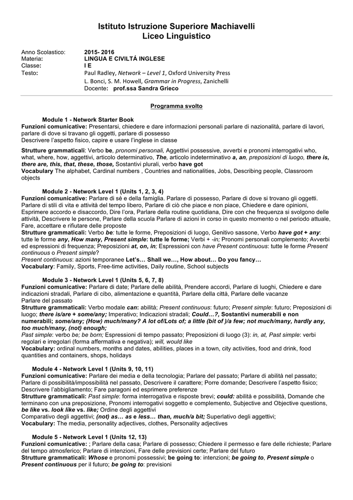 Istituto Istruzione Superiore Machiavelli Liceo Linguistico Anno Scolastico: Materia: Classe: Testo: 2015- 2016 LINGUA E CIVILTÁ INGLESE IE Paul Radley, Network – Level 1, Oxford University Press L. Bonci, S. M. Howell, Grammar in Progress, Zanichelli Docente: prof.ssa Sandra Grieco Programma svolto Module 1 - Network Starter Book Funzioni comunicative: Presentarsi, chiedere e dare informazioni personali parlare di nazionalità, parlare di lavori, parlare di dove si travano gli oggetti, parlare di possesso Descrivere l’aspetto fisico, capire e usare l’inglese in classe Strutture grammaticali: Verbo be, pronomi personali, Aggettivi possessive, avverbi e pronomi interrogativi who, what, where, how, aggettivi, articolo determinativo, The, articolo indeterminativo a, an, preposizioni di luogo, there is, there are, this, that, these, those, Sostantivi plurali, verbo have got Vocabulary The alphabet, Cardinal numbers , Countries and nationalities, Jobs, Describing people, Classroom objects Module 2 - Network Level 1 (Units 1, 2, 3, 4) Funzioni comunicative: Parlare di sé e della famiglia. Parlare di possesso, Parlare di dove si trovano gli oggetti. Parlare di stili di vita e attività del tempo libero, Parlare di ciò che piace e non piace, Chiedere e dare opinioni, Esprimere accordo e disaccordo, Dire l’ora, Parlare della routine quotidiana, Dire con che frequenza si svolgono delle attività, Descrivere le persone, Parlare della scuola Parlare di azioni in corso in questo momento o nel periodo attuale, Fare, accettare e rifiutare delle proposte Strutture grammaticali: Verbo be: tutte le forme, Preposizioni di luogo, Genitivo sassone, Verbo have got + any: tutte le forme any, How many, Present simple: tutte le forme; Verbi + -in; Pronomi personali complemento; Avverbi ed espressioni di frequenza; Preposizioni at, on, in; Espressioni con have Present continuous: tutte le forme Present continuous o Present simple? Present continuous: azioni temporanee Let’s… Shall we…, How about… Do you fancy… Vocabulary: Family, Sports, Free-time activities, Daily routine, School subjects Module 3 - Network Level 1 (Units 5, 6, 7, 8) Funzioni comunicative: Parlare di date; Parlare delle abilità, Prendere accordi, Parlare di luoghi, Chiedere e dare indicazioni stradali, Parlare di cibo, alimentazione e quantità, Parlare della città, Parlare delle vacanze Parlare del passato Strutture grammaticali: Verbo modale can: abilità; Present continuous: futuro; Present simple: futuro; Preposizioni di luogo; there is/are + some/any; Imperativo; Indicazioni stradali; Could…?, Sostantivi numerabili e non numerabili; some/any; (How) much/many? A lot of/Lots of; a little (bit of )/a few; not much/many, hardly any, too much/many, (not) enough; Past simple: verbo be; be born; Espressioni di tempo passato; Preposizioni di luogo (3): in, at, Past simple: verbi regolari e irregolari (forma affermativa e negativa); will, would like Vocabulary: ordinal numbers, months and dates, abilities, places in a town, city activities, food and drink, food quantities and containers, shops, holidays Module 4 - Network Level 1 (Units 9, 10, 11) Funzioni comunicative: Parlare dei media e della tecnologia; Parlare del passato; Parlare di abilità nel passato; Parlare di possibilità/impossibilità nel passato, Descrivere il carattere; Porre domande; Descrivere l’aspetto fisico; Descrivere l’abbigliamento; Fare paragoni ed esprimere preferenze Strutture grammaticali: Past simple: forma interrogativa e risposte brevi; could: abilità e possibilità, Domande che terminano con una preposizione, Pronomi interrogativi soggetto e complemento, Subjective and Objective questions, be like vs. look like vs. like; Ordine degli aggettivi Comparativo degli aggettivi; (not) as… as e less… than, much/a bit; Superlativo degli aggettivi; Vocabulary: The media, personality adjectives, clothes, Personality adjectives Module 5 - Network Level 1 (Units 12, 13) Funzioni comunicative: ; Parlare della casa; Parlare di possesso; Chiedere il permesso e fare delle richieste; Parlare del tempo atmosferico; Parlare di intenzioni, Fare delle previsioni certe; Parlare del futuro Strutture grammaticali: Whose e pronomi possessivi; be going to: intenzioni; be going to, Present simple o Present continuous per il futuro; be going to: previsioni Grammar in Progress Units 1, 2, 3, 4, 5, 6, 7, 8, 9, 10, 11 (solo simple past), 15 • • • Quando possibile le lezioni di Listening Comprehension si sono tenute nel laboratorio linguistico. Una volta a settimana gli studenti hanno seguito in copresenza lezioni di conversazione inglese a cura della Prof.ssa Francesca Galli, che ha anche proposto la visione in lingua originale con sottotitoli in inglese del film Stuart Little 2, di Rob Minkoff. In accordo con il modulo interdisciplinare So studiare? Imparare ad imparare, sono state proposte indicazioni su Study strategies at home, organizzazione del tempo, del quaderno, dei libri e sono state svolte lezioni introduttive all’uso del dizionario. • Roma, 08. 06. 2016 Prof.ssa Sandra Grieco