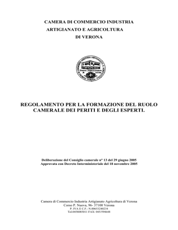 CAMERA DI COMMERCIO INDUSTRIA ARTIGIANATO E AGRICOLTURA DI VERONA REGOLAMENTO PER LA FORMAZIONE DEL RUOLO CAMERALE DEI PERITI E DEGLI ESPERTI. Deliberazione del Consiglio camerale n° 13 del 29 giugno 2005 Approvata con Decreto Interministeriale del 18 novembre 2005 Camera di Commercio Industria Artigianato Agricoltura di Verona Corso P. Nuova, 96- 37100 Verona P. IVA E C.F.: N.00653240234 Tel.0458085011 FAX: 045/594648 Regolamento per il ruolo dei periti e degli esperti presso la Camera di Commercio, Industria, Artigianato e Agricoltura di Verona. Articolo 1 La Camera di Commercio, Industria, Artigianato e Agricoltura di Verona forma il ruolo dei periti e degli esperti della provincia, ai sensi dell'art. 32 del testo unico, approvato con R.D. 20 settembre 1934, n° 2011, come modificato dal D.Lgs. Luog. 21 settembre 1944 n° 315, con l'osservanza delle norme seguenti. Articolo 2 Il ruolo è distinto in categorie e sub categorie comprendenti funzioni, merci e manufatti, in relazione alle singole attività economiche di produzione e di servizi che si svolgono nella provincia. La Camera di Commercio, Industria, Artigianato e Agricoltura forma un elenco delle categorie e sub categorie, di cui all’allegato al presente Regolamento, in base all'elenco-tipo allegato al Regolamento di cui al D.M. 04/01/1954 e successive modifiche ed integrazioni. I periti e gli esperti iscritti nel ruolo, esplicano funzioni di carattere prevalentemente pratico, con esclusione, ai sensi dell'art. 32, n. 3, del testo unico approvato con R. D. 20 settembre 1934, n° 2011, di quelle attività professionali per le quali sussistono albi regolati da apposite disposizioni. L'iscrizione può essere richiesta soltanto per le categorie e sub categorie comprese nell'elenco indicato nel presente articolo; tuttavia, nell’ambito della singola subcategoria è possibile richiedere l’iscrizione limitatamente ad uno o più oggetti o attività. Articolo 3 La Camera di Commercio Industria, Artigianato e Agricoltura, pubblica mediante affissione nel proprio Albo, il Regolamento per la formazione del ruolo dei periti e degli esperti, invitando coloro che aspirano ad essere iscritti a presentare domanda corredata dei documenti indicati nell'art. 5. Dell’avvenuta pubblicazione è dato avviso mediante comunicato, pubblicato con mezzi idonei. Articolo 4 L'iscrizione nel ruolo è disposta con determinazione del Segretario Generale della Camera di Commercio, Industria, Artigianato e Agricoltura o del Dirigente da lui delegato, previa istruttoria svolta dal competente Ufficio. La domanda di iscrizione s’intende accolta qualora non sia comunicato il diniego di iscrizione decorsi 60 giorni dalla presentazione della domanda. Articolo 5 L'aspirante all'iscrizione deve presentare domanda in bollo, alla Camera di Commercio Industria, Artigianato e Agricoltura, corredata dei documenti comprovanti che: a) ha compiuto 21 anni di età; b) è cittadino italiano, o di uno degli Stati membri dell'Unione europea ovvero è cittadino extracomunitario residente nel territorio della Repubblica italiana; c) è residente, ovvero ha eletto il proprio domicilio professionale, nella circoscrizione della Camera di Commercio, Industria, Artigianato e Agricoltura cui è diretta la domanda; d) ha assolto gli obblighi derivanti dalle norme relative alla scuola dell'obbligo vigenti al momento dell'età scolare dell'interessato, conseguendo il relativo titolo. Se cittadino di uno degli Stati membri della Comunità Europea ovvero cittadino extracomunitario, l’aspirante deve allegare alla domanda l’originale o una copia autenticata e relativa traduzione giurata, del titolo di studio che l’Autorità Diplomatica o Consolare italiana, competente per territorio, per il tramite del Ministero degli Affari Esteri abbia riconosciuto corrispondente per tipo e durata degli studi – a quello previsto per i cittadini italiani. e) gode dell'esercizio di diritti civili. L'aspirante deve inoltre dichiarare di non essere stato dichiarato fallito e di non aver subito condanne per delitti contro la pubblica amministrazione, l'amministrazione della giustizia, l'ordine pubblico, la fede pubblica, l'economia pubblica, l'industria e il commercio ovvero per delitto di omicidio volontario, furto, rapina, estorsione, truffa, appropriazione indebita, ricettazione e per ogni altro delitto non colposo per il quale la legge commini la pena della reclusione non inferiore, nel minimo, a due anni o, nel massimo, a cinque anni, salvo che non sia intervenuta la riabilitazione. Ai fini della documentazione relativa al comma precedente, la Camera di commercio, industria, artigianato e agricoltura osserva le norme di cui al D.P.R. 28 dicembre 2000, n° 445. L'aspirante deve esibire, altresì, tutti gli altri titoli e documenti validi a comprovare la propria idoneità all'esercizio di perito o di esperto nelle categorie e sub categorie per le quali richiede l'iscrizione. Nella domanda devono essere indicate le categorie e sub categorie per le quali l'aspirante intenda esercitare le funzioni di perito o di esperto. L'iscrizione non può avere luogo per più di tre categorie e sempre che tali categorie siano affini tra loro. La Camera di Commercio, ai fini di completezza dell’istruttoria, qualora ritenga a suo insindacabile giudizio, che i titoli ed i documenti prodotti non siano sufficienti a comprovare l’idoneità dell’aspirante, e comunque in ogni caso in cui lo ritenga opportuno, ha facoltà di acquisire un parere tecnico in ordine alla documentazione prodotta ed alla materia di interesse, nonché di sottoporre l’aspirante ad un colloquio. A tali fini, l’Organo competente potrà avvalersi di uno o più esperti di riconosciuta competenza in materia. L'aspirante deve corrispondere la tassa di concessione governativa, i diritti di segreteria e l’imposta di bollo come disposto dalle vigenti disposizioni. Gli iscritti in albi professionali sono tenuti a presentare solo i documenti ind