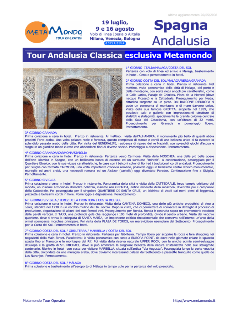 ultimo aggiornamento 26/05/2008 19 luglio, 9 e 16 agosto Volo di linea Iberia o Alitalia Milano, Venezia, Bologna Spagna Andalusia Tour Andalusia Classica esclusiva Metamondo 1° GIORNO ITALIA/MALAGA/COSTA DEL SOL Partenza con volo di linea ed arrivo a Malaga, trasferimento in hotel . Cena e pernottamento in hotel. 2° GIORNO COSTA DEL SOL/MALAGA/NERJA/GRANADA Prima colazione e cena in hotel. Pranzo in ristorante. Nel mattino, visita panoramica della città di Malaga, del porto e delle montagne, con sosta negli angoli più caratteristici, come la Calle Larios, Pasaje de Chinitas, Plaza de la Merced (dove nacque Picasso) e la Cattedrale. Preseguimento per Nerja, cittadina sorgente su un picco. Dal BALCONE D’EUROPA si gode un panorama di montagne e di mare davvero unico. Visita della sua famosa GROTTA, scoperta nel 1959, che possiede sale e gallerie con impressionanti strutture di stalattiti e stalagmiti, specialmente la grande colonna centrale della Sala del Cataclisma, con un’altezza di 32 metri. Proseguimento per Granada e pomeriggio libero. Pernottamento. 3° GIORNO GRANADA Prima colazione e cena in hotel. Pranzo in ristorante. Al mattino, visita dell’ALHAMBRA, il monumento più bello di quanti abbia prodotti l’arte araba. Una volta palazzo reale e fortezza, questo complesso di stanze e cortili di una bellezza unica ci fa evocare lo splendido passato arabo della città. Poi visita del GENERALIFE, residenza di riposo dei re Naziridi, con splendidi giochi d’acqua e stagni in un giardino molto curato con abbondanti fiori di diverse specie. Pomeriggio a disposizione. Pernottamento. 4° GIORNO GRANADA/CARMONA/SIVIGLIA Prima colazione e cena in hotel. Pranzo in ristorante. Partenza verso Carmona. Visita della MOSCHEA, una delle più belle opere dell'arte islamica in Spagna, con un bellissimo bosco di colonne ed un suntuoso "mihrab". A continuazione, passeggiata per il Quartiere Ebraico, con le sue viuzze caratteristiche, le case con i balconi colmi di fiori ed i tradizionali cortili andalusi. Proseguimento per Siviglia con fermata CARMONA, una volta importante crocevia romano, possiede oggi un bellissimo centro storico monumentale, muraglie ed archi arabi, una necropoli romana ed un Alcázar (castello) oggi diventato Parador. Continuazione fino a Siviglia. Pernottamento. 5° GIORNO SIVIGLIA Prima colazione e cena in hotel. Pranzo in ristorante. Panoramica della città e visita della CATTEDRALE, terzo tempio cristiano del mondo, un insieme armonioso d’insolita bellezza, insieme alla GIRALDA, antico minareto della moschea, diventata poi il campanile della Cattedrale. Poi passeggiata per il singolare QUARTIERE DI SANTA CRUZ, un labirinto di vicoli dai nomi pieni di leggenda, piazzette e bellissimi cortili in fiore. Pomeriggio a disposizione. Pernottamento. 6º GIORNO SIVIGLIA / JEREZ DE LA FRONTERA / COSTA DEL SOL Prima colazione e cena in hotel. Pranzo in ristorante. Visita della CANTINA DOMECQ, una delle più antiche produttrici di vino a Jerez, stabilita nel 1730 in un vecchio mulino del 16. secolo. Dopo la visita, che ci permetterà di conoscere in dettaglio il processo di produzione, degustazione di alcuni dei suoi famosi vini. Proseguimento per Ronda. Ronda è costruita sopra un promontorio roccioso dalle pareti verticali. Il TAJO, una profonda gola che raggiunge i 100 metri di profondità, divide il centro urbano. Visita del vecchio quartiere, dove si trova la collegiata di SANTA MARÍA, un importante edificio rinascimentale che conserva nell’interno un’arco della ormai scomparsa moschea principale. Poi visita della PLAZA DE TOROS, un meraviglioso esemplare del Settecento. Proseguimento per la Costa del Sol. Pernottamento in hotel. 7º GIORNO COSTA DEL SOL / GIBILTERRA / MARBELLA / COSTA DEL SOL Prima colazione e cena in hotel. Pranzo in ristorante. Partenza per Gibilterra. Tempo libero per scoprire la rocca e fare shopping nei negozietti della Main Street. Facoltativa: la visita panoramica con sosta a EUROPA POINT, da dove nelle giornate chiare lo sguardo spazia fino al Marocco e le montagne del Rif. Poi visita della riserva naturale UPPER ROCK, con le uniche scimie semi-selvaggie d'Europa e la grotta di ST. MICHAEL, dove si può ammirare la singolare bellezza della natura cristallizzata nelle sue stalagmite centenarie. Rientro in hotel con sosta per visitare MARBELLA, situata sull’antica “Via Augusta”. Passeggiata lungo la parte vecchia della città, circondata da una muraglia araba, dove troviamo interessanti palazzi dal Settecento e piazzette tranquille come quella de Los Naranjos. Pernottamento. 8º GIORNO COSTA DEL SOL / MÁLAGA Prima colazione e trasferimento all'aeroporto di Málaga in tempo utile per la partenza del volo prenotato. Metamondo Tour Operator http://www.metamondo.it ultimo aggiornamento 26/05/2008 HOTELS IN TOUR (o similari) MALAGA - Curro 3* oppure TORREMOLINOS - Adriano 3* GRANADA - Los Angeles 4* SIVIGLIA - Don Paco 3* MALAGA - Curro 3* oppure TORREMOLINOS - Adriano 3* SERVIZI COMPRESI Voli di linea Iberia e Alitalia da Venezia, Bologna, Milano Malpensa. Assistenza negli aeroporti italiani quando indicato nella convocazione Assistenza di personale locale dall’arrivo in aeroporto all’hotel il giorno di arrivo e dall’hotel all’aeroporto per il giorno di partenza. Trasferimenti privati dall’aeroporto all’hotel e viceversa il primo e l’ultimo giorno del tour Sistemazione in camera a due letti negli alberghi selezionati 7 pernottamenti in alberghi di categoria 3* in camere doppie con servizi privati Metamondo Tour Operator Trattamento di pensione completa: dalla cena del giorno d’arrivo alla prima colazione del giorno di partenza (cene in hotels e pranzi in ristorante). Pullman Gran Turismo per tutta la durata del Tour Visite e ingressi ai siti come da programma: Granada:Alhambra e Generalife, Cordoba Moschea., Siviglia:Cattedrale. Jerez:Cantina;Ronda: Santa María, l’arena e Don Bosco. Guida accompagnatore parlante italiano per