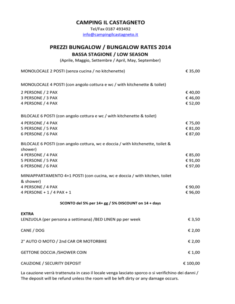 CAMPING IL CASTAGNETO Tel/Fax 0187 493492 [email protected] PREZZI BUNGALOW / BUNGALOW RATES 2014 BASSA STAGIONE / LOW SEASON (Aprile, Maggio, Settembre / April, May, September) MONOLOCALE 2 POSTI (senza cucina / no kitchenette) € 35,00 MONOLOCALE 4 POSTI (con angolo cottura e wc / with kitchenette & toilet) 2 PERSONE / 2 PAX 3 PERSONE / 3 PAX 4 PERSONE / 4 PAX € 40,00 € 46,00 € 52,00 BILOCALE 6 POSTI (con angolo cottura e wc / with kitchenette & toilet) 4 PERSONE / 4 PAX 5 PERSONE / 5 PAX 6 PERSONE / 6 PAX € 75,00 € 81,00 € 87,00 BILOCALE 6 POSTI (con angolo cottura, wc e doccia / with kitchenette, toilet & shower) 4 PERSONE / 4 PAX 5 PERSONE / 5 PAX 6 PERSONE / 6 PAX € 85,00 € 91,00 € 97,00 MINIAPPARTAMENTO 4+1 POSTI (con cucina, wc e doccia / with kitchen, toilet & shower) 4 PERSONE / 4 PAX 4 PERSONE + 1 / 4 PAX + 1 € 90,00 € 96,00 SCONTO del 5% per 14+ gg / 5% DISCOUNT on 14 + days EXTRA LENZUOLA (per persona a settimana) /BED LINEN pp per week € 3,50 CANE / DOG € 2,00 2° AUTO O MOTO / 2nd CAR OR MOTORBIKE € 2,00 GETTONE DOCCIA /SHOWER COIN € 1,00 CAUZIONE / SECURITY DEPOSIT € 100,00 La cauzione verrà trattenuta in caso il locale venga lasciato sporco o si verifichino dei danni / The deposit will be refund unless the room will be left dirty or any damage occurs. CAMPING IL CASTAGNETO Tel/Fax 0187 493492 [email protected] PREZZI BUNGALOW / BUNGALOW RATES 2014 MEDIA STAGIONE / MIDDLE SEASON (01 Giugno - 15 Luglio / 1st June - 15th July) MONOLOCALE 2 POSTI (senza cucina / no kitchenette) € 45,00 MONOLOCALE 4 POSTI (con angolo cottura e wc / with kitchenette & toilet) 2 PERSONE / 2 PAX 3 PERSONE / 3 PAX 4 PERSONE / 4 PAX € 50,00 € 57,00 € 64,00 BILOCALE 6 POSTI (con angolo cottura e wc / with kitchenette & toilet) 4 PERSONE / 4 PAX 5 PERSONE / 5 PAX 6 PERSONE / 6 PAX € 86,00 € 93,00 € 100,00 BILOCALE 6 POSTI (con angolo cottura, wc e doccia / with kitchenette, toilet & shower) 4 PERSONE / 4 PAX 5 PERSONE / 5 PAX 6 PERSONE / 6 PAX € 96,00 € 103,00 € 110,00 MINIAPPARTAMENTO 4+1 POSTI (con cucina, wc e doccia / with kitchen, toilet & shower) 4 PERSONE / 4 PAX 4 PERSONE + 1 / 4 PAX + 1 € 113,00 € 120,00 SCONTO del 5% per 14+ gg / 5% DISCOUNT on 14 + days EXTRA LENZUOLA (per persona a settimana) /BED LINEN pp per week € 3,50 CANE / DOG € 2,00 2° AUTO O MOTO / 2nd CAR OR MOTORBIKE € 2,00 GETTONE DOCCIA /SHOWER COIN € 1,00 CAUZIONE / SECURITY DEPOSIT € 100,00 La cauzione verrà trattenuta in caso il locale venga lasciato sporco o si verifichino dei danni / The deposit will be refund unless the room will be left dirty or any damage occurs. CAMPING IL CASTAGNETO Tel/Fax 0187 493492 [email protected] PREZZI BUNGALOW / BUNGALOW RATES 2014 ALTA STAGIONE / HIGH SEASON (16 Luglio - 31 Agosto / 16th July - 31st August) MONOLOCALE 2 POSTI (senza cucina / no kitchenette) € 52,00 MONOLOCALE 4 POSTI (con angolo cottura e wc / with kitchenette & toilet) 2 PERSONE / 2 PAX 3 PERSONE / 3 PAX 4 PERSONE / 4 PAX € 58,00 € 66,00 € 74,00 BILOCALE 6 POSTI (con angolo cottura e wc / with kitchenette & toilet) 4 PERSONE / 4 PAX 5 PERSONE / 5 PAX 6 PERSONE / 6 PAX € 94,00 € 102,00 € 110,00 BILOCALE 6 POSTI (con angolo cottura, wc e doccia / with kitchenette, toilet & shower) 4 PERSONE / 4 PAX 5 PERSONE / 5 PAX 6 PERSONE / 6 PAX € 111,00 € 117,00 € 125,00 MINIAPPARTAMENTO 4+1 POSTI (con cucina, wc e doccia / with kitchen, toilet & shower) 4 PERSONE / 4 PAX 4 PERSONE + 1 / 4 PAX + 1 € 127,00 € 135,00 SCONTO del 5% per 14+ gg / 5% DISCOUNT on 14 + days EXTRA LENZUOLA (per persona a settimana) /BED LINEN pp per week € 3,50 CANE / DOG € 2,00 2° AUTO O MOTO / 2nd CAR OR MOTORBIKE € 2,00 GETTONE DOCCIA /SHOWER COIN € 1,00 CAUZIONE / SECURITY DEPOSIT € 100,00 La cauzione verrà trattenuta in caso il locale venga lasciato sporco o si verifichino dei danni / The deposit will be refund unless the room will be left dirty or any damage occurs.