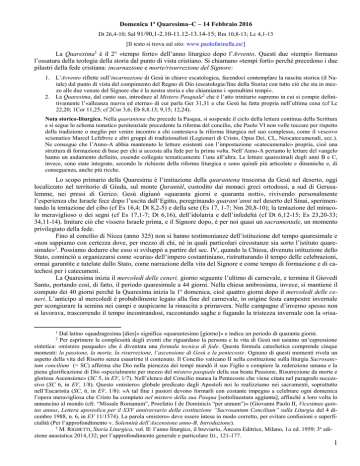 Domenica 1a Quaresima–C – 14 Febbraio 2016 Dt 26,4-10; Sal 91/90,1-2.10-11.12-13.14-15; Rm 10,8-13; Lc 4,1-13 [Il testo si trova sul sito: www.paolofarinella.eu/] La Quaresima1 è il 2° «tempo forte» dell’anno liturgico dopo l’Avvento. Questi due «tempi» formano l’ossatura della teologia della storia dal punto di vista cristiano. Si chiamano «tempi forti» perché precedono i due pilastri della fede cristiana: incarnazione e morte/risurrezione del Signore: 1. L’Avvento riflette sull’incarnazione di Gesù in chiave escatologica, facendoci contemplare la nascita storica (il Natale) dal punto di vista del compimento del Regno di Dio (escatologia/fine della Storia) con tutto ciò che sta in mezzo alle due venute del Signore che è la nostra storia e che chiamiamo i «penultimi tempi». 2. La Quaresima, dal canto suo, introduce al Mistero Pasquale2 che è l’atto trinitario supremo in cui si compie definitivamente l’«alleanza nuova ed eterna» di cui parla Ger 31,31 e che Gesù ha fatta propria nell’ultima cena (cf Lc 22,20; 1Cor 11,25; cf 2Cor 3,6; Eb 8,8.13; 9,15; 12,24). Nota storico-liturgica. Nella quarantena che precede la Pasqua, si sospende il ciclo della lettura continua della Scrittura e si segue lo schema tematico penitenziale precedente la riforma del concilio, che Paolo VI non volle toccare per rispetto della tradizione o meglio per venire incontro a chi contestava la riforma liturgica nel suo complesso, come il vescovo scismatico Marcel Lefebvre e altri gruppi di tradizionalisti (Legionari di Cristo, Opus Dei, CL, Neocatecumenali, ecc.). Ne consegue che l’Anno-A abbia mantenuto le letture esistenti con l’impostazione «catecumenale» propria, cioè una struttura di formazione di base per chi si accosta alla fede per la prima volta. Nell’Anno-A pertanto le letture del vangelo hanno un andamento definito, essendo collegate tematicamente l’una all’altra. Le letture quaresimali degli anni B e C, invece, sono state integrate, secondo le richieste della riforma liturgica e sono quindi più articolate e dinamiche e, di conseguenza, anche più ricche. Lo scopo primario della Quaresima è l’imitazione della quarantena trascorsa da Gesù nel deserto, oggi localizzato nel territorio di Giuda, sul monte Qarantàl, custodito dai monaci greci ortodossi, a sud di Gerusalemme, nei pressi di Gerico. Gesù digiunò «quaranta giorni e quaranta notti», rivivendo personalmente l’esperienza che Israele fece dopo l’uscita dall’Egitto, peregrinando quarant’anni nel deserto del Sinai, sperimentando la tentazione del cibo (cf Es 16,4; Dt 8,2-5) e della sete (Es 17, 1-7; Nm 20,8-10); la tentazione del miracolo meraviglioso o dei segni (cf Es 17,1-7; Dt 6,16), dell’idolatria e dell’infedeltà (cf Dt 6,12-15; Es 23,20-33; 34,11-14). Imitare ciò che vissero Israele prima, e il Signore dopo, è per noi quasi un sacramentale, un momento privilegiato della fede. Fino al concilio di Nicea (anno 325) non si hanno testimonianze dell’istituzione del tempo quaresimale e «non sappiamo con certezza dove, per mezzo di chi, né in quali particolari circostanze sia sorto l’istituto quaresimale»3. Possiamo dedurre che esso si sviluppò a partire del sec. IV, quando la Chiesa, divenuta istituzione dello Stato, cominciò a organizzarsi come «curia» dell’impero costantiniano, ristrutturando il tempo delle celebrazioni, ormai garantite e tutelate dallo Stato, come narrazione della vita del Signore e come tempo di formazione e di catechesi per i catecumeni. La Quaresima inizia il mercoledì delle ceneri, giorno seguente l’ultimo di carnevale, e termina il Giovedì Santo, portando così, di fatto, il periodo quaresimale a 44 giorni. Nella chiesa ambrosiana, invece, si mantiene il computo dei 40 giorni perché la Quaresima inizia la 1a domenica, cioè quattro giorni dopo il mercoledì delle ceneri. L’anticipo al mercoledì è probabilmente legato alla fine del carnevale, in origine festa campestre invernale per scongiurare la semina nei campi e auspicarne la rinascita a primavera. Nelle campagne d’inverno spesso non si lavorava, trascorrendo il tempo incontrandosi, raccontando saghe e fugando la tristezza invernale con la «risa1 Dal latino «quadragesima [dies]» significa «quarantesimo [giorno]» e indica un periodo di quaranta giorni. Per esprimere la complessità degli eventi che riguardano la persona e la vita di Gesù noi usiamo un’espressione sintetica: «mistero pasquale» che è diventata una formula tecnica di fede. Questa formula catechetica comprende cinque momenti: la passione, la morte, la risurrezione, l’ascensione di Gesù e la pentecoste. Ognuno di questi momenti rivela un aspetto della vita del Risorto senza esaurirne il contenuto. Il Concilio vaticano II nella costituzione sulla liturgia Sacrosanctum concilium (= SC) afferma che Dio nella pienezza dei tempi mandò il suo Figlio a compiere la redenzione umana e la piena glorificazione di Dio «specialmente per mezzo del mistero pasquale della sua beata Passione, Risurrezione da morte e gloriosa Ascensione» (SC 5, in EV, 1/7). Nell’elenco del Concilio manca la Pentecoste che viene citata nel paragrafo successivo (SC 6, in EV, 1/8). Questo «mistero» globale predicato dagli Apostoli noi lo realizziamo nei sacramenti, soprattutto nell’Eucaristia (SC, 6, in EV, 1/8): «A tal fine i pastori devono formarli con costante impegno a celebrare ogni domenica l’opera meravigliosa che Cristo ha compiuto nel mistero della sua Pasqua [sottolineatura aggiunta], affinché a loro volta lo annuncino al mondo (cfr. “Missale Romanum”, Proefatio I de Dominicis “per annum”)» (Giovanni Paolo II, Vicesimus quintus annus, Lettera apostolica per il XXV anniversario della costituzione “Sacrosantum Concilium” sulla Liturgia del 4 dicembre 1988, n. 6, in EV 11/1574). La parola «mistero» deve essere intesa in modo corretto, per evitare confusioni e superficialità (Per l’approfondimento v. Sole