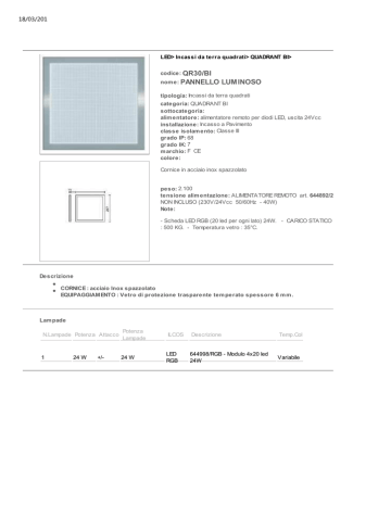 18/03/201 LED> Incassi da terra quadrati> QUADRANT BI> codice: QR30/BI nom e: PANNELLO LUMINOSO tipologia: Incassi da terra quadrati categoria: QUADRANT BI sottocategoria: alim entatore: alimentatore remoto per diodi LED, uscita 24Vcc installazione: Incasso a Pavimento classe isolam ento: Classe III grado IP: 68 grado IK: 7 m archio: F CE colore: Cornice in acciaio inox spazzolato peso: 2.100 tensione alim entazione: ALIMENTATORE REMOTO art. 644892/2 NON INCLUSO (230V/24Vcc 50/60Hz - 40W) Note: - Scheda LED RGB (20 led per ogni lato) 24W. - CARICO STATICO : 500 KG. - Temperatura vetro : 35°C. Descrizione CORNICE : acciaio Inox spazzolato EQUIPAGGIAMENTO : Vetro di protezione trasparente tem perato spessore 6 m m . Lam pade N.Lampade Potenza Attacco Potenza Lampade ILCOS Descrizione Temp.Col 1 24 W LED RGB 644998/RGB - Modulo 4x20 led 24W Variabile 24 W +/-