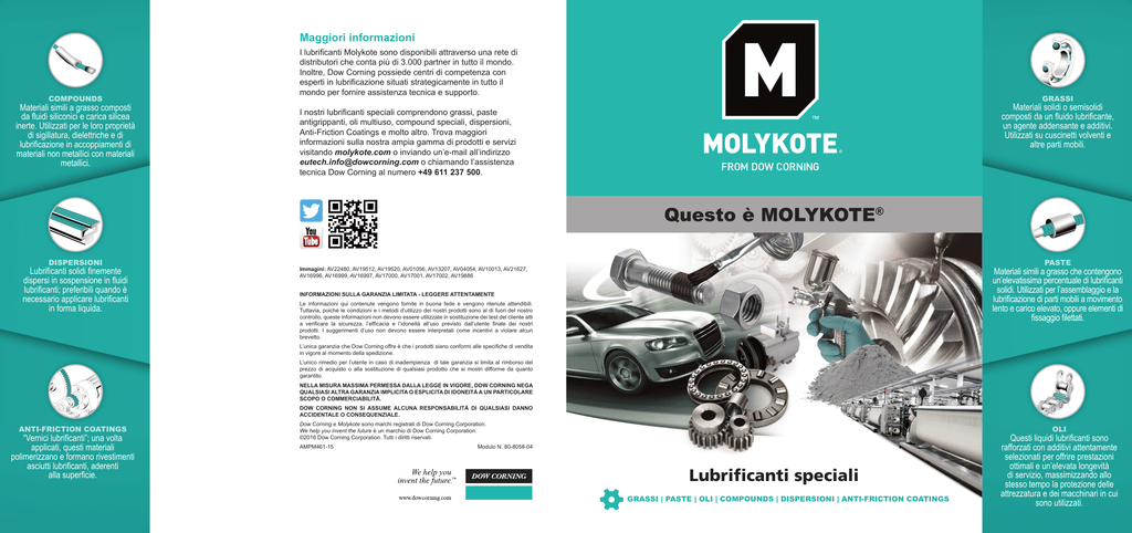 Maggiori informazioni COMPOUNDS Materiali simili a grasso composti da fluidi siliconici e carica silicea inerte. Utilizzati per le loro proprietà di sigillatura, dielettriche e di lubrificazione in accoppiamenti di materiali non metallici con materiali metallici. I lubrificanti Molykote sono disponibili attraverso una rete di distributori che conta più di 3.000 partner in tutto il mondo. Inoltre, Dow Corning possiede centri di competenza con esperti in lubrificazione situati strategicamente in tutto il mondo per fornire assistenza tecnica e supporto. GRASSI Materiali solidi o semisolidi composti da un fluido lubrificante, un agente addensante e additivi. Utilizzati su cuscinetti volventi e altre parti mobili. I nostri lubrificanti speciali comprendono grassi, paste antigrippanti, oli multiuso, compound speciali, dispersioni, Anti-Friction Coatings e molto altro. Trova maggiori informazioni sulla nostra ampia gamma di prodotti e servizi visitando molykote.com o inviando un’e-mail all’indirizzo [email protected] o chiamando l’assistenza tecnica Dow Corning al numero +49 611 237 500. Questo è MOLYKOTE® DISPERSIONI Lubrificanti solidi finemente dispersi in sospensione in fluidi lubrificanti; preferibili quando è necessario applicare lubrificanti in forma liquida. PASTE Materiali simili a grasso che contengono un’elevatissima percentuale di lubrificanti solidi. Utilizzati per l’assemblaggio e la lubrificazione di parti mobili a movimento lento e carico elevato, oppure elementi di fissaggio filettati. Immagini: AV22480, AV19512, AV19520, AV01056, AV13207, AV04054, AV10013, AV21627, AV16996, AV16999, AV16997, AV17000, AV17001, AV17002, AV19886 INFORMAZIONI SULLA GARANZIA LIMITATA - LEGGERE ATTENTAMENTE Le informazioni qui contenute vengono fornite in buona fede e vengono ritenute attendibili. Tuttavia, poiché le condizioni e i metodi d’utilizzo dei nostri prodotti sono al di fuori del nostro controllo, queste informazioni non devono essere utilizzate in sostituzione dei test del cliente atti a verificare la sicurezza, l’efficacia e l’idoneità all’uso previsto dall’utente finale dei nostri prodotti. I suggerimenti d’uso non devono essere interpretati come incentivi a violare alcun brevetto. L’unica garanzia che Dow Corning offre è che i prodotti siano conformi alle specifiche di vendita in vigore al momento della spedizione. L’unico rimedio per l’utente in caso di inadempienza di tale garanzia si limita al rimborso del prezzo di acquisto o alla sostituzione di qualsiasi prodotto che si mostri difforme da quanto garantito. NELLA MISURA MASSIMA PERMESSA DALLA LEGGE IN VIGORE, DOW CORNING NEGA QUALSIASI ALTRA GARANZIA IMPLICITA O ESPLICITA DI IDONEITÀ A UN PARTICOLARE SCOPO O COMMERCIABILITÀ. DOW CORNING NON SI ASSUME ALCUNA RESPONSABILITÀ DI QUALSIASI DANNO ACCIDENTALE O CONSEQUENZIALE. ANTI-FRICTION COATINGS “Vernici lubrificanti”; una volta applicati, questi materiali polimerizzano e formano rivestimenti asciutti lubrificanti, aderenti alla superficie. Dow Corning e Molykote sono marchi registrati di Dow Corning Corporation. We help you invent the future è un marchio di Dow Corning Corporation. ©2016 Dow Corning Corporation. Tutti i diritti riservati. AMPM461-15 OLI Modulo N. 80-8058-04 Lubrificanti speciali GRASSI | PASTE | OLI | COMPOUNDS | DISPERSIONI | ANTI-FRICTION COATINGS Questi liquidi lubrificanti sono rafforzati con additivi attentamente selezionati per offrire prestazioni ottimali e un’elevata longevità di servizio, massimizzando allo stesso tempo la protezione delle attrezzatura e dei macchinari in cui sono utilizzati. PRODOTTI PER APPLICAZIONI ORDINARIE BR2 Plus Grasso nero per servizio severo con MoS2 e altri lubrificanti solidi per applicazioni generiche G-4700 Grasso nero sintetico a lunga durata con MoS2 e altri lubrificanti solidi per carichi più elevati, pressioni estreme e gamma termica delle applicazioni più ampia rispetto a BR2 Plus G-4500 Grasso bianco per applicazioni alimentari NSF H-1, sintetico, a lunga durata con lubrificanti solidi per applicazioni generiche con carichi moderati e velocità elevate G-1502FM Grasso bianco altamente adesivo per applicazioni alimentari NSF H-1 a lungo termine, sintetico, con una percentuale più elevata di lubrificanti solidi, per applicazioni gravose e carichi elevati BG-20 Grasso per cuscinetti ad alta velocità 33 Medium Grasso al silicone per basse temperature Temperature alte/ 44 Medium Grasso al silicone per temperature elevate 3451 Grasso resistente agli agenti chimici basse, cuscinetti, 1292 Grasso resistente agli agenti chimici particolarmente chassis, agenti indicato per la lubrificazione a lungo termine E RI NI NA IO DI AZ OR PLIC AP Temperatura elevata, carico elevato, resistenza all’acqua, velocità elevata, macchinari per industria alimentare, basso rumore e bassa temperatura PRODOTTI PER APPLICAZIONI ORDINARIE chimici per uso alimentare, acqua, mandrini e motori Prevenzione di: (tensocorrosione, fragilità delle saldature, fatica e pitting), offre resistenza all’acqua e un coefficiente di attrito costante. Pasta 1000 Collegamenti filettati, uso generico Pasta P-37 Collegamenti filettati, temperature elevate, alte leghe G-N Plus Assemblaggio e rodaggio Pasta DX Fretting (vibrazione ad alta frequenza) tra parti in accoppiamento e in interferenza, non macchia P-1900 Collegamenti filettati e parti meccaniche nel settore dei macchinari per prodotti alimentari P-40 Pasta priva di metalli per componenti meccanici e collegamenti filettati in ambiente offshore Filettature, lubrificante solido, temperature elevate/ leghe, assemblaggio/ rodaggio e antifretting Soluzioni Smart Lubrication™ Refrigerazione, viscosità, stabilità dell’ossidazione, oli per gas di processo, fluidi di lavaggio, fluidi per giunti idraulici, fluidi per giunti barriera e stabilità alla temperatura ** Contatta il distributore o il rappresentante vendite Dow Corning per esplorare la linea di prodotti M
