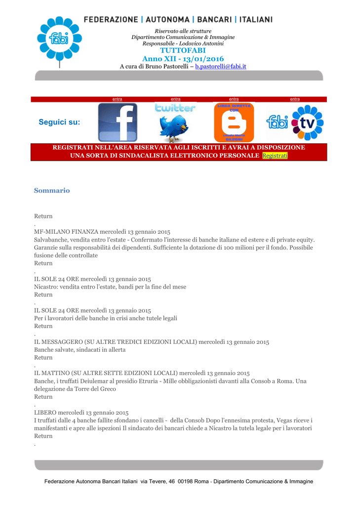 Riservato alle strutture Dipartimento Comunicazione & Immagine Responsabile - Lodovico Antonini TUTTOFABI Anno XII - 13/01/2016 A cura di Bruno Pastorelli – [email protected] entra entra entra entra Seguici su: REGISTRATI NELL'AREA RISERVATA AGLI ISCRITTI E AVRAI A DISPOSIZIONE UNA SORTA DI SINDACALISTA ELETTRONICO PERSONALE Registrati Sommario Return . MF-MILANO FINANZA mercoledì 13 gennaio 2015 Salvabanche, vendita entro l'estate - Confermato l'interesse di banche italiane ed estere e di private equity. Garanzie sulla responsabilità dei dipendenti. Sufficiente la dotazione di 100 milioni per il fondo. Possibile fusione delle controllate Return . IL SOLE 24 ORE mercoledì 13 gennaio 2015 Nicastro: vendita entro l’estate, bandi per la fine del mese Return . IL SOLE 24 ORE mercoledì 13 gennaio 2015 Per i lavoratori delle banche in crisi anche tutele legali Return . IL MESSAGGERO (SU ALTRE TREDICI EDIZIONI LOCALI) mercoledì 13 gennaio 2015 Banche salvate, sindacati in allerta Return . IL MATTINO (SU ALTRE SETTE EDIZIONI LOCALI) mercoledì 13 gennaio 2015 Banche, i truffati Deiulemar al presidio Etruria - Mille obbligazionisti davanti alla Consob a Roma. Una delegazione da Torre del Greco Return . LIBERO mercoledì 13 gennaio 2015 I truffati dalle 4 banche fallite sfondano i cancelli - della Consob Dopo l'ennesima protesta, Vegas riceve i manifestanti e apre alle ispezioni Il sindacato dei bancari chiede a Nicastro la tutela legale per i lavoratori Return . Federazione Autonoma Bancari Italiani via Tevere, 46 00198 Roma - Dipartimento Comunicazione & Immagine Riservato alle strutture Dipartimento Comunicazione & Immagine Responsabile - Lodovico Antonini TUTTOFABI Anno XII - 13/01/2016 A cura di Bruno Pastorelli – [email protected] AVVENIRE mercoledì 13 gennaio 2015 «Banche vendute entro giugno» - Nicastro conferma la cessione dei quattro istituti salvati Return . LA REPUBBLICA/FIRENZE mercoledì 13 gennaio 2015 Presidio delle vittime Nicastro vede i sindacati Return . L'ECO DI BERGAMO - LA PROVINCIA DI LECCO - LA PROVINCIA DI SONDRIO mercoledì 13 gennaio 2015 Nicastro: le 4 banche salvate saranno vendute prima dell'estate - Resta caldo il fronte degli istituti di credito salvati con l'intervento del governo Return . CORRIERE DI AREZZO mercoledì 13 gennaio 2015 Richiesta dei sindacati, Nicastro si impegna e garantisce le tutele occupazionali - Banche, no alle cause ai dipendenti Return . CORRIERE DELLA SERA mercoledì 13 gennaio 2016 Dopo i salvataggi – I sindacati bancari vedono Nicastro Return . RILEVAZIONI AUDIOVISIVE Data Pubblicazione: 12-GEN-2016 TRASMISSIONI DOVE E' STATO NOMINATO IL SINDACATO FABI Return . LA REPUBBLICA.it 12/01/2016 16.41.59 Faccia a faccia tra Nicastro ed i sindacati delle banche salvate Return . IL SOLE 24 ORE .com 12 gennaio 2016 16:40 Nicastro ai sindacati: vendita istituti prima dell’estate Return . CORRIERE DELLA SERA NEWS 12-01-16 15:45:54 Banche ponte: Sileoni (Fabi), ai dipendenti piena tutela legale e patrimoniale Return . LA REPUBBLICA.it 12/01/2016 16.24.33 Banche, la vendita entro l'estate. Vegas si impegna col Codacons: "Via a ispezioni" Return . IL GHIRLANDAIO.com 12-01-16 15:56:56 Banche:Sileoni,no speculazioni crediti Federazione Autonoma Bancari Italiani via Tevere, 46 00198 Roma - Dipartimento Comunicazione & Immagine Riservato alle strutture Dipartimento Comunicazione & Immagine Responsabile - Lodovico Antonini TUTTOFABI Anno XII - 13/01/2016 A cura di Bruno Pastorelli – [email protected] Return . BRESCIA OGGI - IL GIORNALE DI VICENZA 12/01/2016 Banche:Sileoni,no speculazioni crediti Return . IL DIARIO DEL LAVORO 12/01/2016 BANCHE - Vendita good bank prima dell'estate. Sindacati: necessarie garanzie occupazionali Return . MILANO FINANZA.it 12/01/2016 13:48 Banche: Nicastro a sindacati, confermata vendita prima di estate Return . MILANO FINANZA NEWS.it 12/01/2016 13:49 ROMA (MF-DJ)--Roberto Nicastro, presidente delle 4 good bank nate dal - salvataggio di Banca Marche, CariChieti, CariFe, e BancaEtruria si sarebbe - recato al Ministero dell'Economia per un incontro tecnico. Return . da ANSA via L'ARENA DI VERONA.it 12/01/2016 Nicastro,vendita banche prima estate Return . ASKANEWS.it 12/gen/2016 14:31 Banche, Nicastro a sindacati: vendita prima di inizio estate - "I quattro istituti saranno ceduti tutti insieme o a spezzatino" Return . ASKANEWS.it 12/gen/2016 16:19 Banche, Fabi: bene Nicastro su impegno per livelli occupazionali - "Ma da alcuni ex-commissari posizioni vecchie, ottuse e stantie" Return . FIRSTONLINE.info 12/01/2016 14:31 Banche, Nicastro a sindacati: vendita prima di inizio estate Return . GENEWS.it 12 gennaio 2016 16:40 Banca Etruria, Nicastro ai sindacati: “La vendita prima dell’estate” Return . da ASKANEWS via TENDENZE ON LINE.info 12/01/2016 Banche, Nicastro a sindacati: vendita prima di inizio estate Return . Federazione Autonoma Bancari Italiani via Tevere, 46 00198 Roma - Dipartimento Comunicazione & Immagine Riservato alle strutture Dipartimento Comunicazione & Immagine Responsabile - Lodovico Antonini TUTTOFABI Anno XII - 13/01/2016 A cura di Bruno Pastorelli – [email protected] LA NAZIONE.it 12-01-16 15:45:54 Nicastro incontra i sindacati: "No ai licenziamenti" - Stamattina una rappresentanza dei risparmiatori ricevuta dal presidente della Consob Return . QUOTIDIANO.net 12/01/2016 Nicastro,vendita banche prima estate Return . IL MESSAGGERO.it 2016-01-12 17:15:05 Faccia a faccia tra Nicastro ed i sindacati delle banche salvate Return . da RADIOCOR via BORSA ITALIANA 12-01-16 15:56:56 Banche ponte: sindacati, dotazione 100 milioni per Fondo non sufficiente Return . da ANSA via BRESCIA OGGI.it via BORSA ITALIANA 12-01-16 15:56:56 Banche: incontro Nicastro-sindacati Return . da RADIOCOR via BORSA ITALIANA 12-01-16 15:45:54 Banche ponte: Sileoni (Fabi), ai dipendenti piena tutela legale e patrimoniale Return . da RADIOCOR via BORSA ITALIANA 12-01-16 15:56:56 Banche ponte: sindacati, dotazione 100 mil