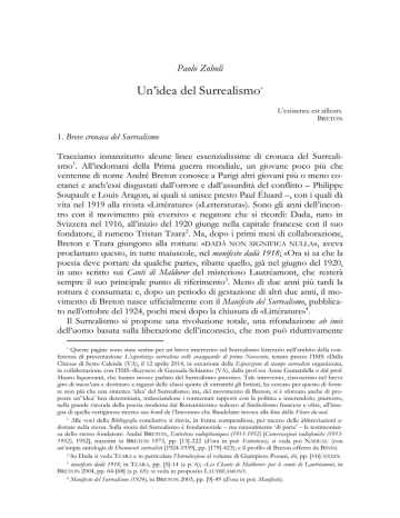 Paolo Zoboli Un’idea del Surrealismo* L’existence est ailleurs. BRETON 1. Breve cronaca del Surrealismo Tracciamo innanzitutto alcune linee essenzialissime di cronaca del Surrealismo1. All’indomani della Prima guerra mondiale, un giovane poco più che ventenne di nome André Breton conosce a Parigi altri giovani più o meno coetanei e anch’essi disgustati dall’orrore e dall’assurdità del conflitto – Philippe Soupault e Louis Aragon, ai quali si unisce presto Paul Éluard –, con i quali dà vita nel 1919 alla rivista «Littérature» («Letteratura»). Sono gli anni dell’incontro con il movimento più eversivo e negatore che si ricordi: Dada, nato in Svizzera nel 1916, all’inizio del 1920 giunge nella capitale francese con il suo fondatore, il rumeno Tristan Tzara2. Ma, dopo i primi mesi di collaborazione, Breton e Tzara giungono alla rottura: «DADÀ NON SIGNIFICA NULLA», aveva proclamato questo, in tutte maiuscole, nel manifesto dadà 1918; «Ora si sa che la poesia deve portare da qualche parte», ribatte quello, già nel giugno del 1920, in uno scritto sui Canti di Maldoror del misterioso Lautréamont, che resterà sempre il suo principale punto di riferimento3. Meno di due anni più tardi la rottura è consumata: e, dopo un periodo di gestazione di altri due anni, il movimento di Breton nasce ufficialmente con il Manifesto del Surrealismo, pubblicato nell’ottobre del 1924, pochi mesi dopo la chiusura di «Littérature»4. Il Surrealismo si propone una rivoluzione totale, una rifondazione ab imis dell’uomo basata sulla liberazione dell’inconscio, che non può riduttivamente * Queste pagine sono state scritte per un breve intervento sul Surrealismo letterario nell’ambito della conferenza di presentazione L’esperienza surrealista nelle avanguardie di primo Novecento, tenuta presso l’ISIS «Dalla Chiesa» di Sesto Calende (VA), il 12 aprile 2014, in occasione della Esposizione di stampe surrealiste organizzata, in collaborazione con l’ISIS «Keynes» di Gazzada-Schianno (VA), dalla prof.ssa Anna Gamardella e dal prof. Mauro Squarzanti, che hanno invece parlato del Surrealismo pittorico. Tale intervento, circoscritto nel breve giro di mezz’ora e destinato a ragazzi delle classi quinte di entrambi gli Istituti, ha cercato per questo di fornire non più che una sintetica ‘idea’ del Surrealismo; ma, del movimento di Breton, si è sforzato anche di proporre un’‘idea’ ben determinata, tralasciandone i tormentati rapporti con la politica e inserendolo, piuttosto, nella grande vicenda della poesia moderna dal Romanticismo tedesco al Simbolismo francese e oltre, all’insegna di quella vertiginosa ricerca «au fond de l’Inconnu» che Baudelaire invoca alla fine delle Fleurs du mal. 1 Alle voci della Bibliografia conclusiva si rinvia, in forma compendiosa, per mezzo delle abbreviazioni adottate nella stessa. Sulla storia del Surrealismo è fondamentale – ma naturalmente ‘di parte’ – la testimonianza dello stesso fondatore: André BRETON, Entretiens radiophoniques (1913-1952) [Conversazioni radiofoniche (19131952), 1952], trascritti in BRETON 1973, pp. [13]-222 (d’ora in poi: Entretiens); si veda poi NADEAU (con un’ampia antologia di Documenti surrealisti [1924-1939], pp. [179]-423); e il profilo di Breton offerto da BINNI. 2 Su Dada si veda TZARA e in particolare l’Introduzione al volume di Giampiero Posani, ibi, pp. [VII]-XXXIX. 3 manifesto dadà 1918, in TZARA, pp. [5]-14 (a p. 6); «Les Chants de Maldoror» par le comte de Lautréamont, in BRETON 2004, pp. 64-[68] (a p. 65): si veda in proposito LAUTRÉAMONT. 4 Manifesto del Surrealismo (1924), in BRETON 2003, pp. [9]-49 (d’ora in poi: Manifesto). 2 PAOLO ZOBOLI identificarsi con un semplice movimento artistico: per Breton l’arte è un mezzo, non un fine. E subito il nuovo movimento si dota di un suo organo, la rivista dal titolo emblematico «La Révolution surrealiste» («La rivoluzione surrealista»). Per qualche tempo Antonin Artaud, unitosi al gruppo, tenta di portare alle logiche conseguenze le premesse del Manifesto, ma Breton, dopo un periodo di relativa assenza, riprende in mano il movimento, del quale diventa una sorta di dittatore che giunge a espellere compagni di strada vecchi (perfino Soupault) e nuovi (lo stesso Artaud). Da lui propiziata, la svolta inattesa verso la politica avviene nell’estate del 1925, con un avvicinamento non privo di equivoci e di contrasti ai redattori della rivista «Clarté», vicini a Trockij e critici verso il Partito Comunista Francese (PCF), al quale peraltro Breton, Éluard e Aragon qualche tempo dopo si iscrivono. L’intento è quello di unire rivoluzione spirituale surrealista e rivoluzione materiale marxista: ma già allora un marxista ex surrealista come Pierre Naville afferma che esse sono inconciliabili5. Per Breton, comunque, quello dei comunisti è solo un «programma minimo» e sia lui che gli altri che si sono iscritti al Partito rifiutano l’impegno diretto, restando sempre ai margini dell’attività rivoluzionaria6. Intanto, come ricorderà Breton nel 1952, quegli stessi anni (1926-1929) vedono «una fioritura di opere surrealiste che è spesso considerata come la più splendida»: e cita, fra gli altri, i suoi Nadja e Le Surréalisme et la Peinture (Il Surrealismo e la pittura), di Aragon Le Paysan de Paris (Il paesano di Parigi) e Traité du style (Trattato dello stile), di Éluard Capitale de la douleur (Capitale del dolore) e L’Amour la Poésie (L’amore la poesia)7. Nel dicembre del 1929 l’ultimo numero della «Révolution surréaliste» accoglie il Second Manifeste du Surréalisme, edito in volume l’anno dopo;8 e, annunciata al termine del Manifesto, nel luglio del 1930 esce la rivista «Le Surréalisme au service de la Révolution» («Il Surrealismo al servizio della rivoluzione»). Quell’anno si aggiungono alle file del Surrealismo Salvator Dalì e René Char, che sono a fianco di Breton quando, fr