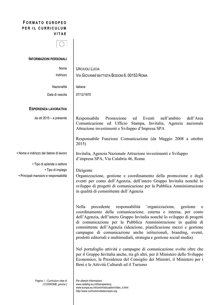FORMATO EUROPEO PER IL CURRICULUM VITAE INFORMAZIONI PERSONALI Nome Indirizzo Nazionalità Data di nascita URCIUOLI LUCIA VIA GIOVANNI BATTISTA BODONI 6, 00153 ROMA italiana 07/12/1970 ESPERIENZA LAVORATIVA da ott 2015 – a presente Responsabile Promozione ed Eventi nell’ambito dell’Area Comunicazione ed Ufficio Stampa, Invitalia, Agenzia nazionale Attrazione investimenti e Sviluppo d’Impresa SPA Responsabile Funzione Comunicazione (da Maggio 2008 a ottobre 2015) • Nome e indirizzo del datore di lavoro Invitalia, Agenzia Nazionale Attrazione investimenti e Sviluppo d’impresa SPA, Via Calabria 46, Roma • Tipo di azienda o settore • Tipo di impiego • Principali mansioni e responsabilità Dirigente Organizzazione, gestione e coordinamento della promozione e degli eventi per conto dell’Agenzia, dell’intero Gruppo Invitalia nonché lo sviluppo di progetti di comunicazione per la Pubblica Amministrazione in qualità di committente dell’Agenzia Nella precedente responsabilità ’organizzazione, gestione e coordinamento della comunicazione, esterna e interna, per conto dell’Agenzia, dell’intero Gruppo Invitalia nonché lo sviluppo di progetti di comunicazione per la Pubblica Amministrazione in qualità di committente dell’Agenzia (ideazione, pianificazione mezzi e gestione campagne di comunicazione anche istituzionali, branding, eventi, prodotti editoriali e multimediali, strategia e gestione social media). Nel portafoglio attività e campagne di comunicazione svolte oltre che per il Gruppo Invitalia anche, tra gli altri, per il Ministero dello Sviluppo Economico, la Presidenza del Consiglio dei Ministri, il Ministero per i Beni e le Attività Culturali ed il Turismo Pagina 1 - Curriculum vitae di [ COGNOME, gnome ] Per ulteriori informazioni: www.cedefop.eu.int/transparency www.europa.eu.int/comm/education/index_it.html http://www.curriculumvitaeeuropeo.org ISTRUZIONE E FORMAZIONE • 1989-1994 Libera Università Internazionale degli Studi Sociali Guido Carli Laurea in Giurisprudenza cum laude, Laurea in Giurisprudenza con tesi in Diritto Comunitario dei mezzi di comunicazione di massa • 1992-1993 Université Robert Schuman (Strasbourg III) Diploma Erasmus in Diritto comunitario della concorrenza, 1992 – 1993 19851989 Pagina 2 - Curriculum vitae di [ COGNOME, gnome ] Liceo classico Eugenio Montale (Roma) Diploma di maturità, liceo classico, Per ulteriori informazioni: www.cedefop.eu.int/transparency www.europa.eu.int/comm/education/index_it.html http://www.curriculumvitaeeuropeo.org CAPACITÀ E COMPETENZE PERSONALI . MADRELINGUA Italiana] ALTRE LINGUA • Capacità di lettura • Capacità di scrittura • Capacità di espressione orale Francese Eccellente Buono Eccellente Inglese (Buono, buono, Buono) Spagnolo (buono, elementare, buono) CAPACITÀ E COMPETENZE RELAZIONALI E ORGANIZZATIVE . Capacità, personale e sviluppata nel corso delle esperienze lavorative) di stabilire proficue relazioni all’interno del ambiente di lavoro attraverso l’alimentazione e la condivisione di un costante flusso di opinioni ed informazioni allo scopo di arricchire la qualità dei risultati realizzati; tensione verso un risultato collettivo in grado di avere un valore aggiunto rispetto ai contributi individuali; capacità di raggiungere gli obiettivi attraverso il coinvolgimento, l’ascolto, il rispetto reciproco e la valorizzazione delle specificità individuali e professionali di ciascun membro del team e la creazione di un clima positivo e di collaborazione. . CAPACITÀ E COMPETENZE TECNICHE . ALTRE CAPACITÀ E COMPETENZE . Pagina 3 - Curriculum vitae di [ COGNOME, gnome ] supporto alla gestione strategica ed amministrativa di organizzazioni complesse (società pubbliche, ministeri); relazioni istituzionali e pubbliche, nazionali ed internazionali; comunicazione istituzionale e comunicazione d’impresa (esterna ed interna) con particolare competenza in social media marketing and strategy; comunicazione istituzionale e politica; diritto pubblico (comunitario, costituzionale, amministrativo, diritto dei media e della comunicazione); marketing conoscenza dei principali e più usati pacchetti informatici (word, excel, power point, outlook/internet); attitudine alla definizione di strategie e modalità di gestione della comunicazione attraverso i più diffusi social network (Facebook, Twitter, Instagram, Visually, Linkedin), acquisita con l’esperienza professionale e seguendo specifici corsi di formazione in Social media marketing avanzato (marzo 2013. gennaio 2014, giugno 2015 e gennaio 2016) e scrittura efficace per siti web, social e contact center (gennaio 2014). Allo stesso modo, in qualità di amministratore del sito Internet aziendale, ho seguito un corso di formazione (ottobre 2014) avente ad oggetto la “Pubblicazione dei dati sui siti web PA tra obblighi di trasparenza e tutela della privacy”. Per ulteriori informazioni: www.cedefop.eu.int/transparency www.europa.eu.int/comm/education/index_it.html http://www.curriculumvitaeeuropeo.org