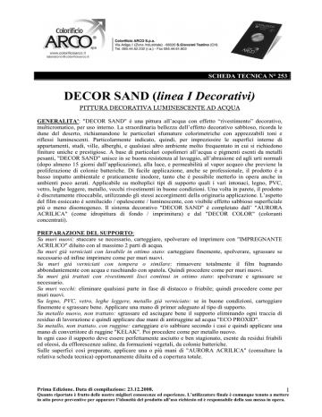 SCHEDA TECNICA N° 253 DECOR SAND (linea I Decorativi) PITTURA DECORATIVA LUMINESCENTE AD ACQUA GENERALITA': "DECOR SAND" é una pittura all’acqua con effetto “rivestimento” decorativo, multicromatico, per uso interno. La straordinaria bellezza dell’effetto decorativo sabbioso, ricorda le dune del deserto, richiamandone le particolari sfumature colorimetriche con apprezzabili toni e riflessi luminescenti. Particolarmente indicato, quindi, per impreziosire le superfici interne di appartamenti, studi, ville, alberghi, e qualsiasi altro ambiente molto frequentato in cui si richiedono finiture uniche e prestigiose. A base di particolari copolimeri all’acqua e pigmenti esenti da metalli pesanti, "DECOR SAND" unisce in se buona resistenza al lavaggio, all’abrasione ed agli urti normali (dopo almeno 15 giorni dall’applicazione), alla luce, e permeabilità al vapor acqueo che previene la proliferazione di colonie batteriche. Di facile applicazione, anche se professionale, il prodotto è a basso impatto ambientale e praticamente inodore, tanto che è possibile metterlo in opera anche in ambienti poco aerati. Applicabile su molteplici tipi di supporto quali i vari intonaci, legno, PVC, vetro, leghe leggere, metallo, vecchi rivestimenti in buone condizioni. Una volta in parete, il prodotto è discretamente ritoccabile, utilizzando gli stessi accorgimenti della originaria applicazione. L’aspetto del film essiccato è semilucido / opalescente / luminescente, con visibile effetto sabbioso superficiale più o meno disomogeneo. Il sistema decorativo "DECOR SAND" è completato dall’ "AURORA ACRILICA" (come idropittura di fondo / imprimitura) e dal "DECOR COLOR" (coloranti concentrati). PREPARAZIONE DEL SUPPORTO: Su muri nuovi: stuccare se necessario, carteggiare, spolverare ed imprimere con "IMPREGNANTE ACRILICO" diluito con al massimo 2 parti di acqua. Su muri già verniciati con lavabile in ottimo stato: carteggiare finemente, spolverare, sgrassare se necessario ed infine imprimere come per muri nuovi. Su muri già verniciati con tempera o similare: rimuovere totalmente il film bagnando abbondantemente con acqua e raschiando con spatola. Quindi procedere come per muri nuovi. Su muri già trattati con rivestimenti lisci continui in ottimo stato: spolverare e sgrassare se necessario. Su muri vecchi: eliminare qualsiasi parte in fase di distacco o friabile; quindi procedere come per muri nuovi. Su legno, PVC, vetro, leghe leggere, metallo già verniciato: se in buone condizioni, carteggiare finemente e sgrassare bene. Applicare una mano di primer adeguato al tipo di supporto. Su metallo nuovo, non trattato: sgrassare ed asciugare bene il supporto eliminando ogni traccia di residuo di lavorazione e quindi applicare due mani di antiruggine ad acqua "ECO PROXID". Su metallo, non trattato, con ruggine: carteggiare e/o sabbiare secondo i casi e quindi applicare una mano di convertitore di ruggine "KELAK". Poi procedere come per metallo nuovo. In ogni caso il supporto deve essere perfettamente asciutto e ben stagionato, esente da residui friabili ed oleosi, da efflorescenze saline, da formazioni vegetali, da colonie batteriche. Sulle superfici così preparate, applicare una o più mani di "AURORA ACRILICA" (consultare la relativa scheda tecnica) opportunamente diluita ed a copertura totale. Prima Edizione. Data di compilazione: 23.12.2008. 1 Quanto riportato è frutto delle nostre migliori conoscenze ed esperienze. L’utilizzatore finale è comunque tenuto a mettere in atto prove preventive per appurare l’idoneità del prodotto all’uso richiesto ed è responsabile della sua messa in opera. APPLICAZIONE: pennello a costa stretta. Rimescolare manualmente, con una spatola d’acciaio inox, il contenuto della latta (non usare agitatori elettrici a forte velocità), e nel contempo additivare con il relativo quantitativo di "DECOR COLOR" per ottenere il tono di colore desiderato in base ai suggerimenti della cartella colori o alla propria fantasia. È sufficiente una unica mano applicativa per ottenere gli effetti sotto descritti, ma è possibile applicarne una seconda nel caso si voglia ottenere una finitura più “carica”. Applicare con temperature comprese tra + 8°C. e + 30°C. Non applicare su superfici calde o gelide, in presenza di forte ventilazione, in ambienti con elevata umidità relativa. Prima dell’applicazione, proteggere e coprire adeguatamente tutte le parti che non devono essere verniciate come porte, finestre, vetrerie, mobili, suppellettili, pavimenti. Applicare il "DECOR SAND" solo quando la o le mani di fondo apportate con "AURORA ACRILICA" sono perfettamente asciutte (almeno 4 ore a 23 ± 2°C.). Generalmente la pittura di fondo "AURORA ACRILICA" si applica nel suo colore bianco (i colori di cartella sono tutti applicati su fondo bianco), ma è possibile personalizzare la combinazione colorimetrica tra fondo e finitura, soddisfando la propria fantasia. E’ possibile ottenere due effetti di finitura: EFFETTO SABBIA e EFFETTO STRIATO. EFFETTO SABBIA: su supporti lisci e preparati come già descritto, applicare "DECOR SAND" con l’apposito pennello su una superficie di 1 – 2 mq. stendendolo in tutte le direzioni, alternando le pennellate da destra verso sinistra e viceversa, e dal basso verso l’alto e viceversa. La stesura deve avvenire con piccole quantità di prodotto, facendo in modo di ottenere una stesura il meno uniforme possibile. Dopo 5 – 10 minuti (se a temperatura ambiente di + 18 / + 22°C.), ripassare la parte trattata con lo stesso attrezzo, ma scarico di prodotto, cercando di lisciare e spostare la componente granulosa, alfine di ottenere l’effetto delle dune sabbiose del deserto. Sfumare leggermente il perimetro di applicazione in maniera tale da non accavallare troppo quando si effettua la ripresa di una successiva ed adiacente area di stesura. Nel contempo, con calibrati e leggeri colpi di pennello scarico di prodotto, eliminare le eventuali sb