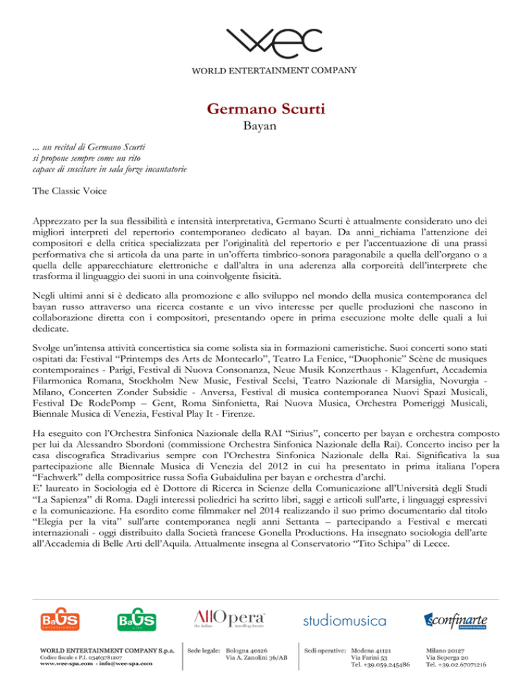 Germano Scurti Bayan ... un recital di Germano Scurti si propone sempre come un rito capace di suscitare in sala forze incantatorie The Classic Voice Apprezzato per la sua flessibilità e intensità interpretativa, Germano Scurti è attualmente considerato uno dei migliori interpreti del repertorio contemporaneo dedicato al bayan. Da anni richiama l’attenzione dei compositori e della critica specializzata per l’originalità del repertorio e per l’accentuazione di una prassi performativa che si articola da una parte in un’offerta timbrico-sonora paragonabile a quella dell’organo o a quella delle apparecchiature elettroniche e dall’altra in una aderenza alla corporeità dell’interprete che trasforma il linguaggio dei suoni in una coinvolgente fisicità. Negli ultimi anni si è dedicato alla promozione e allo sviluppo nel mondo della musica contemporanea del bayan russo attraverso una ricerca costante e un vivo interesse per quelle produzioni che nascono in collaborazione diretta con i compositori, presentando opere in prima esecuzione molte delle quali a lui dedicate. Svolge un’intensa attività concertistica sia come solista sia in formazioni cameristiche. Suoi concerti sono stati ospitati da: Festival “Printemps des Arts de Montecarlo”, Teatro La Fenice, “Duophonie” Scène de musiques contemporaines - Parigi, Festival di Nuova Consonanza, Neue Musik Konzerthaus - Klagenfurt, Accademia Filarmonica Romana, Stockholm New Music, Festival Scelsi, Teatro Nazionale di Marsiglia, Novurgìa Milano, Concerten Zonder Subsidie - Anversa, Festival di musica contemporanea Nuovi Spazi Musicali, Festival De RodePomp – Gent, Roma Sinfonietta, Rai Nuova Musica, Orchestra Pomeriggi Musicali, Biennale Musica di Venezia, Festival Play It - Firenze. Ha eseguito con l’Orchestra Sinfonica Nazionale della RAI “Sirius”, concerto per bayan e orchestra composto per lui da Alessandro Sbordoni (commissione Orchestra Sinfonica Nazionale della Rai). Concerto inciso per la casa discografica Stradivarius sempre con l’Orchestra Sinfonica Nazionale della Rai. Significativa la sua partecipazione alle Biennale Musica di Venezia del 2012 in cui ha presentato in prima italiana l’opera “Fachwerk” della compositrice russa Sofia Gubaidulina per bayan e orchestra d’archi. E’ laureato in Sociologia ed è Dottore di Ricerca in Scienze della Comunicazione all’Università degli Studi “La Sapienza” di Roma. Dagli interessi poliedrici ha scritto libri, saggi e articoli sull'arte, i linguaggi espressivi e la comunicazione. Ha esordito come filmmaker nel 2014 realizzando il suo primo documentario dal titolo “Elegia per la vita” sull'arte contemporanea negli anni Settanta – partecipando a Festival e mercati internazionali - oggi distribuito dalla Società francese Gonella Productions. Ha insegnato sociologia dell’arte all’Accademia di Belle Arti dell’Aquila. Attualmente insegna al Conservatorio “Tito Schipa” di Lecce.