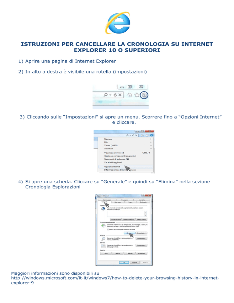 ISTRUZIONI PER CANCELLARE LA CRONOLOGIA SU INTERNET EXPLORER 10 O SUPERIORI 1) Aprire una pagina di Internet Explorer 2) In alto a destra è visibile una rotella (impostazioni) 3) Cliccando sulle “Impostazioni” si apre un menu. Scorrere fino a “Opzioni Internet” e cliccare. 4) Si apre una scheda. Cliccare su “Generale” e quindi su “Elimina” nella sezione Cronologia Esplorazioni Maggiori informazioni sono disponibili su http://windows.microsoft.com/it-it/windows7/how-to-delete-your-browsing-history-in-internetexplorer-9