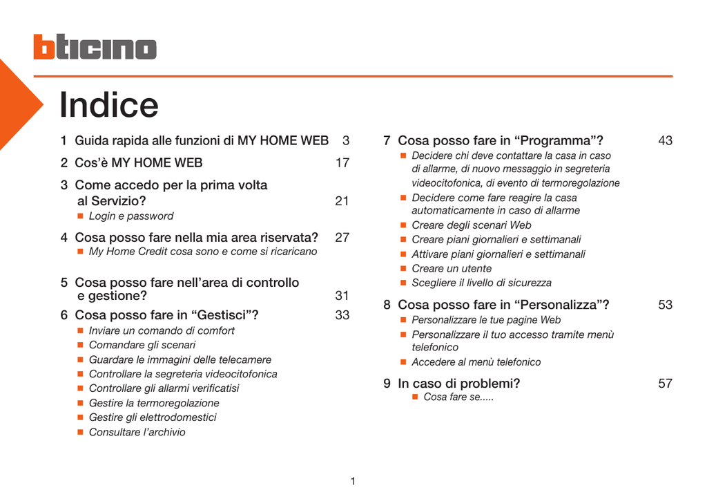 Indice 1 Guida rapida alle funzioni di MY HOME WEB 3 2 Cos’è MY HOME WEB 17 3 Come accedo per la prima volta al Servizio? 21 7 Cosa posso fare in “Programma”? Login e password 4 Cosa posso fare nella mia area riservata? 27 5 Cosa posso fare nell’area di controllo e gestione? 6 Cosa posso fare in “Gestisci”? 31 33 My Home Credit cosa sono e come si ricaricano 43 Decidere chi deve contattare la casa in caso di allarme, di nuovo messaggio in segreteria videocitofonica, di evento di termoregolazione Decidere come fare reagire la casa automaticamente in caso di allarme Creare degli scenari Web Creare piani giornalieri e settimanali Attivare piani giornalieri e settimanali Creare un utente Scegliere il livello di sicurezza 8 Cosa posso fare in “Personalizza”? 53 Personalizzare le tue pagine Web Personalizzare il tuo accesso tramite menù telefonico Accedere al menù telefonico Inviare un comando di comfort Comandare gli scenari Guardare le immagini delle telecamere Controllare la segreteria videocitofonica Controllare gli allarmi verificatisi Gestire la termoregolazione Gestire gli elettrodomestici Consultare l’archivio 9 In caso di problemi? Cosa fare se..... 1 57 2 2 Guida rapida alle funzioni di MY HOME WEB 1 1 Guida rapida alle funzioni di MY HOME WEB ■ Prima connessione al Servizio ■ Utilizzo del Servizio MY HOME WEB 1. Connettiti al Portale www.myhome-bticino.it 1. Connettiti al Portale www.myhome-bticino.it 2. Inserisci la tua login e come password bticino 2. Inserisci la tua login e la tua password personale 3. Completa la registrazione dei tuoi dati personali 3. Clicca sul link Entra in casa 4. Scegli la tua password personale 4. Inserisci la password di casa 5. Accetta il contratto on line e autorizza il trattamento dei dati. 5. Entri così nell’area a te riservata del Portale MY HOME ORA SEI PRONTO PER CONTROLLARE E GESTIRE LA TUA CASA MY HOME OVUNQUE TU SIA UTILIZZANDO UN PC COLLEGATO AD INTERNET. Ecco cosa puoi fare in ogni menù: MY HOME WEB via PC HELP 4 Per avere suggerimenti durante la navigazione nella tua area riservata del Portale MY HOME. Guida rapida alle funzioni di MY HOME WEB 1 ■ Area in cui puoi controllare e gestire la tua casa MY HOME In dettaglio da pag. 33 GESTISCI ILLUMINAZIONE COMFORT ON Accendi una luce. OFF Spegni una luce. RICHIESTA STATO Verifica lo stato delle luci. DIMMER Regola l’intensità di una luce dotata di dimmer. TEMPORIZZAZIONE Accendi una luce per l’intervallo di tempo programmato. GIU’ Abbassa una tapparella. SU Alza una tapparella. AZIONA Aziona uno scenario nella tua casa MY HOME. AUTOMAZIONE SCENARI segue 5 1 Guida rapida alle funzioni di MY HOME WEB GESTISCI TELECAMERE COMUNICAZIONE SEGRETERIA VIDEOCITOFONICA segue TELECAMERA Scegli una telecamera. ATTIVA Attiva la telecamera scelta. DISATTIVA Disattiva la telecamera scelta. INQUADRATURA Cambia l’inquadratura dell’immagine. IMMAGINE IN PRIMO PIANO Apri il pop up dell’immagine. LUMINOSITA’ Regola la luminosità dell’immagine. CONTRASTO Regola il contrasto dell’immagine. COLORE Regola il colore dell’immagine ZOOM Ingrandisci/riduci l’immagine. QUALITÀ Regola la qualità dell’immagine. ATTIVA Attiva la segreteria videocitofonica. DISATTIVA Disattiva la segreteria videocitofonica. MESSAGGI Elenco dei messaggi in memoria. ALLEGATO Visualizza e ascolta il messaggio selezionato. ELIMINA Elimina il messaggio selezionato. STAMPA Stampa l’elenco dei messaggi. 6 Guida rapida alle funzioni di MY HOME WEB 1 GESTISCI RICHIESTA STATO Verifica se hai inserito l’antifurto. ALLARMI RECENTI Elenco degli allarmi verificatisi nell’ultimo periodo. ALLARMI Elenco di tutti gli allarmi verificatisi. ALLEGATO Visualizza l’allegato video dell’allarme selezionato, se presente. ELIMINA Elimina l’allarme selezionato. STAMPA Stampa l’elenco di tutti gli allarmi. INSERIMENTO Utilizzando come dispositivo di controllo l’art. 3500/N/GSM, permette di inserire l’impianto antintrusione. DISINSERIMENTO Utilizzando come dispositivo di controllo l’art. 3500/N/GSM, permette di disinserire l’impianto antintrusione. RICHIESTA STATO Verifica lo stato dell’impianto ZONE Permette di attivare/disattivare le zone, di interrogare, attivare/disattivare i sensori di una determinata zona. ALLARMI ATTIVI SICUREZZA MEMORIA CON ART. 3500, 3500N o 3500GSM ALLARMI ATTIVI segue segue 7 1 Guida rapida alle funzioni di MY HOME WEB GESTISCI ALLARMI Elenco di tutti gli allarmi verificatisi. ALLEGATO Visualizza l’allegato video dell’allarme selezionato, se presente. ELIMINA Elimina l’allarme selezionato. STAMPA Stampa l’elenco di tutti gli allarmi. TAMP TEST Abilità/disabilita il Tamp Test e permette di chiederne lo stato. MEMORIA EVENTI Elenco della memoria degli eventi verificatisi. STAMPA Stampa l’elenco degli eventi contenuti nella memoria. FORZATURA Attiva forzandolo un elettrodomestico che ha priorità minore. RICHIESTA STATO Verifica lo stato degli elettrodomestici cui hai assegnato una priorità. MEMORIA DIAGNOSTICA RISPARMIO ENERGIA segue 8 Guida rapida alle funzioni di MY HOME WEB GESTISCI CENTRALE COMANDI ATTIVA GIORNO FESTIVO Attiva il comando Giorno Festivo sulla centrale. ATTIVA PROG. SETTIMANALE Attiva il programma selezionato a fianco. ATTIVA SCENARIO Attiva lo scenario selezionato a fianco. ATTIVA SCENARIO FERIE Attiva lo scenario Ferie sulla centrale. DISATTIVA SCENARIO FERIE Disattiva lo scenario Ferie sulla centrale. IMPOSTA MODALITÀ Imposta la modalità di funzionamento, in funzionamento manuale è necessario impostare la temperatura desiderata. RICHIESTA STATO Permette di conoscere lo stato della centrale e le sue impostazioni. RICHIESTA STATO Permette di conoscere lo stato di una zona e le sue impostazioni. IMPOSTA MODALITÀ Imposta la modalità di funzionamento della sonda. IMPOSTA TEMPERATURA In modalità manuale è necessario impostare la temperatura desiderata. SBLOCCA IMPOST. SONDA Permette di forzare da remoto lo sblocco di una sonda blocc