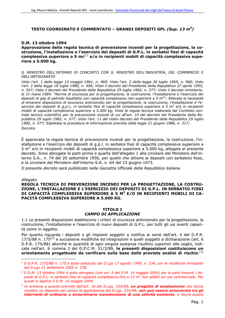 Ing. Mauro Malizia - Grandi Depositi GPL - testo coordinato - Comando Provinciale dei Vigili del Fuoco di Ascoli Piceno TESTO COORDINATO E COMMENTATO – GRANDI DEPOSITI GPL (Sup. 13 m3) D.M. 13 ottobre 1994 Approvazione della regola tecnica di prevenzione incendi per la progettazione, la costruzione, l'installazione e l'esercizio dei depositi di G.P.L. in serbatoi fissi di capacità complessiva superiore a 5 mc(1) e/o in recipienti mobili di capacità complessiva superiore a 5.000 kg. IL MINISTRO DELL'INTERNO Dl CONCERTO CON IL MINISTRO DELL'INDUSTRIA, DEL COMMERCIO E DELL'ARTIGIANATO Visto l'art. 1 della legge 13 maggio 1961, n. 469; Visto l’art. 2 della legge 26 luglio 1965, n. 966; Visto l'art. 2 della legge 18 luglio 1980, n. 406; Visto il decreto del Presidente della Repubblica 27 aprile 1955, n. 547; Visto il decreto del Presidente della Repubblica 29 luglio 1982, n. 577; Visto il decreto ministeriale 31 mano 1984: "Norme di sicurezza per la progettazione, la costruzione, l'installazione e l'esercizio dei depositi di gas di petrolio liquefatto con capacità complessiva non superiore a 5 m3"; Rilevata la necessità di emanare disposizioni di sicurezza antincendio per la progettazione, la costruzione, l'installazione é l'esercizio dei depositi di g.p.l., in serbatoi fissi di capacità complessiva superiore a 5 m3 e/o in recipienti mobili di capacità complessiva superiore a 5.000 kg; Vista la regola tecnica elaborata dal Comitato centrale tecnico scientifico per la prevenzione incendi di cui all'art. 10 del decreto del Presidente della Repubblica 29 luglio 1982, n. 577; Visto l'art. 11 del citato decreto del Presidente della Repubblica 29 luglio 1982, n. 577; Espletata la procedura di informazione prevista dalla legge 21 giugno 1986, n. 317; Decreta: É approvata la regola tecnica di prevenzione incendi per la progettazione, la costruzione, l'installazione e l'esercizio dei depositi di g.p.l. in serbatoi fissi di capacità complessiva superiore a 5 m3 e/o in recipienti mobili di capacità complessiva superiore a 5.000 kg, allegata al presente decreto. Sono abrogate le parti prima e quarta dell'allegato 1 alla circolare del Ministero dell'interno S.A., n. 74 del 20 settembre 1956, per quello che attiene ai depositi con serbatoio fisso, e la circolare del Ministero dell'interno S.A. n. 64 del 23 giugno 1973. Il presente decreto sarà pubblicato nella Gazzetta Ufficiale della Repubblica italiana. Allegato REGOLA TECNICA DI PREVENZIONE INCENDI PER LA PROGETTAZIONE, LA COSTRUZIONE, L'INSTALLAZIONE E L'ESERCIZIO DEI DEPOSITI DI G.P.L. IN SERBATOI FISSI DI CAPACITÀ COMPLESSIVA SUPERIORE A 5 M3 E/O IN RECIPIENTI MOBILI DI CAPACITÀ COMPLESSIVA SUPERIORE A 5.000 KG. TITOLO I CAMPO DI APPLICAZIONE 1.1 Le presenti disposizioni stabiliscono i criteri di sicurezza antincendio per la progettazione, la costruzione, l'installazione e l'esercizio di nuovi depositi di G.P.L. per tutti gli usi aventi capacità come in oggetto. Per quanto riguarda i depositi e gli impianti soggetti a notifica ai sensi dell'art. 4 del D.P.R. 17/5/88 n. 175(2) e successive modifiche ed integrazioni e quelli soggetti a dichiarazione (art. 6 D.P.R. 175/88) allorché le quantità di ogni singola sostanza risultino superiori alle soglie, indicate nell'art. 6 comma 2 del D.P.C.M. 31/3/89, le presenti disposizioni costituiscono un orientamento progettuale da verificare sulla base delle previste analisi di rischio.(3) 1 Il D.P.R. 17/5/88 n. 175 è stato sostituito dal D.Lgs 17 agosto 1999, n. 334, con le modifiche introdotte dal D.Lgs 21 settembre 2005 n. 238. 2 Il D.M. 13 ottobre 1994 è stato abrogato (con art. 6 del D.M. 14 maggio 2004) per le parti inerenti i depositi di G.P.L. in serbatoi fissi di capacità complessiva fino a 13 m3 non adibiti ad uso commerciale. Per questi si applica il D.M. 14 maggio 2004. 3 In armonia a quanto previsto dall'art. 16 del D.Lgs. 334/99, un progetto di ampliamento che faccia ricadere un deposito nel campo di applicazione del D.Lgs. 334/99, non può essere annoverato tra gli interventi di ordinaria e straordinaria manutenzione di una attività esistente, e dovrà essere Pag. 1 Ing. Mauro Malizia - Grandi Depositi GPL - testo coordinato - Comando Provinciale dei Vigili del Fuoco di Ascoli Piceno Le modalità per l'adeguamento dei depositi esistenti sono stabilite al titolo XV. 1.2 Non rientrano nel campo di applicazione del presente decreto: a) i depositi refrigerati e criogenici; b) i depositi in caverna; c) gli impianti di distribuzione stradale già regolamentati con D.P.R. n. 208 del 12.1.1971 (G.U. n. 109 del 3 maggio 1971) e successive modificazioni. 1.3 Sono soggetti alle presenti disposizioni gli impianti indicati al precedente punto 1.1 in cui siano utilizzate una o più delle seguenti miscele commerciali, definite dalla 13a Serie di Norme integrative del 28 febbraio 1960 al Regolamento approvato con D.M. 22 luglio 1930: MISCELA A (Butano commerciale): tensione di vapore a 70 °C non superiore a 10,79 bar e densità a 50 °C non inferiore a 0,525; MISCELA A0: tensione di vapore a 70 °C non superiore a 15,69 bar e densità a 50 °C non inferiore a 0,495; MISCELA A1: tensione di vapore a 70 °C non superiore a 20,6 bar e densità' a 50 °C non inferiore a 0,485; MISCELA B: tensione di vapore a 70 °C non superiore a 25,5 bar e densità a 50 °C non inferiore a 0,450; MISCELA C: (Propano commerciale): tensione di vapore a 70 °C non superiore a 30,4 bar e densità a 50 °C non inferiore a 0,440. TITOLO II TERMINI, DEFINIZIONI E TOLLERANZE DIMENSIONALI 2.1 Per i termini, le definizioni e le tolleranze dimensionali si rimanda a quanto emanato con D.M. 31 novembre 1983 (G.U., n. 339 del 12,12 1983). Inoltre, ai fini del presente decreto, si definisce: APPARECCHIATURA DI IMBOTTIGLIAMENTO: bilancia singola o multipla o altro sistema equivalente utilizzato per il riempimento dei recipienti mobili; BARRIERA D'ACQUA: sistema di protezione attiva antincendio realizzato mediante tubi provvis
