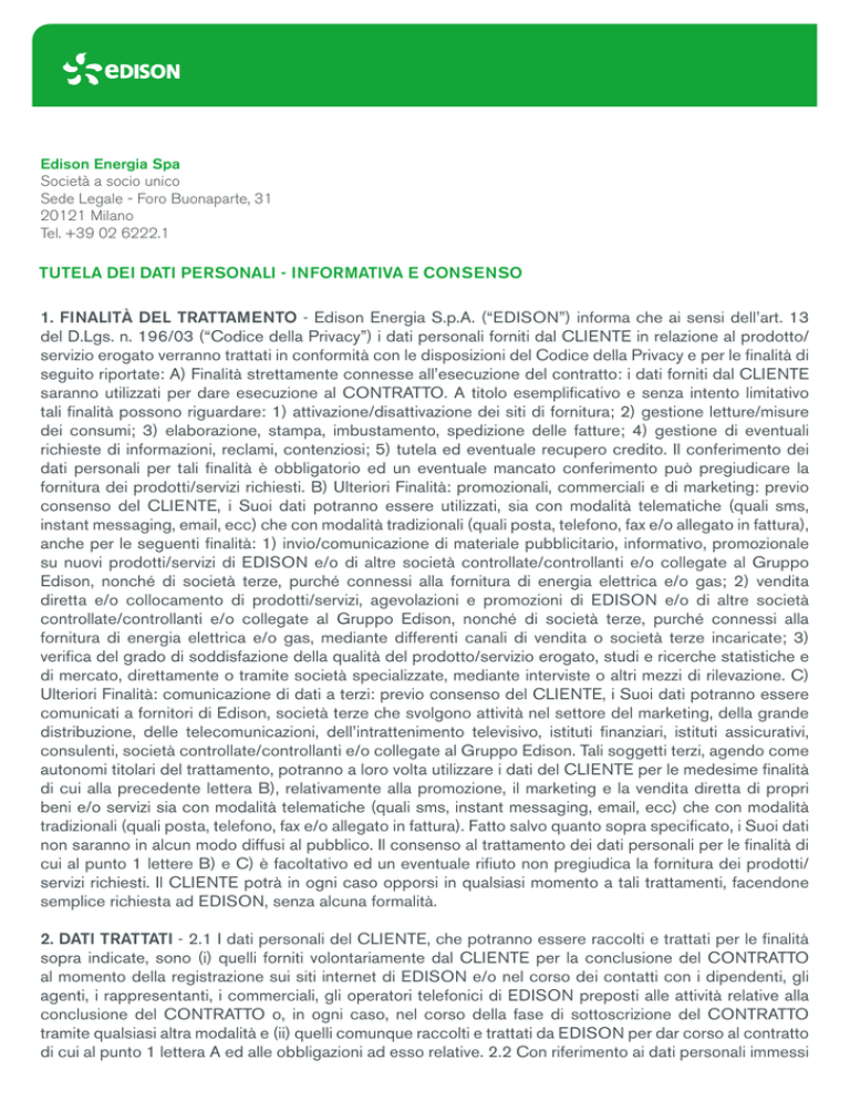 Edison Energia Spa Società a socio unico Sede Legale - Foro Buonaparte, 31 20121 Milano Tel. +39 02 6222.1 TUTELA DEI DATI PERSONALI - INFORMATIVA E CONSENSO 1. FINALITÀ DEL TRATTAMENTO - Edison Energia S.p.A. (“EDISON”) informa che ai sensi dell’art. 13 del D.Lgs. n. 196/03 (“Codice della Privacy”) i dati personali forniti dal CLIENTE in relazione al prodotto/ servizio erogato verranno trattati in conformità con le disposizioni del Codice della Privacy e per le finalità di seguito riportate: A) Finalità strettamente connesse all’esecuzione del contratto: i dati forniti dal CLIENTE saranno utilizzati per dare esecuzione al CONTRATTO. A titolo esemplificativo e senza intento limitativo tali finalità possono riguardare: 1) attivazione/disattivazione dei siti di fornitura; 2) gestione letture/misure dei consumi; 3) elaborazione, stampa, imbustamento, spedizione delle fatture; 4) gestione di eventuali richieste di informazioni, reclami, contenziosi; 5) tutela ed eventuale recupero credito. Il conferimento dei dati personali per tali finalità è obbligatorio ed un eventuale mancato conferimento può pregiudicare la fornitura dei prodotti/servizi richiesti. B) Ulteriori Finalità: promozionali, commerciali e di marketing: previo consenso del CLIENTE, i Suoi dati potranno essere utilizzati, sia con modalità telematiche (quali sms, instant messaging, email, ecc) che con modalità tradizionali (quali posta, telefono, fax e/o allegato in fattura), anche per le seguenti finalità: 1) invio/comunicazione di materiale pubblicitario, informativo, promozionale su nuovi prodotti/servizi di EDISON e/o di altre società controllate/controllanti e/o collegate al Gruppo Edison, nonché di società terze, purché connessi alla fornitura di energia elettrica e/o gas; 2) vendita diretta e/o collocamento di prodotti/servizi, agevolazioni e promozioni di EDISON e/o di altre società controllate/controllanti e/o collegate al Gruppo Edison, nonché di società terze, purché connessi alla fornitura di energia elettrica e/o gas, mediante differenti canali di vendita o società terze incaricate; 3) verifica del grado di soddisfazione della qualità del prodotto/servizio erogato, studi e ricerche statistiche e di mercato, direttamente o tramite società specializzate, mediante interviste o altri mezzi di rilevazione. C) Ulteriori Finalità: comunicazione di dati a terzi: previo consenso del CLIENTE, i Suoi dati potranno essere comunicati a fornitori di Edison, società terze che svolgono attività nel settore del marketing, della grande distribuzione, delle telecomunicazioni, dell’intrattenimento televisivo, istituti finanziari, istituti assicurativi, consulenti, società controllate/controllanti e/o collegate al Gruppo Edison. Tali soggetti terzi, agendo come autonomi titolari del trattamento, potranno a loro volta utilizzare i dati del CLIENTE per le medesime finalità di cui alla precedente lettera B), relativamente alla promozione, il marketing e la vendita diretta di propri beni e/o servizi sia con modalità telematiche (quali sms, instant messaging, email, ecc) che con modalità tradizionali (quali posta, telefono, fax e/o allegato in fattura). Fatto salvo quanto sopra specificato, i Suoi dati non saranno in alcun modo diffusi al pubblico. Il consenso al trattamento dei dati personali per le finalità di cui al punto 1 lettere B) e C) è facoltativo ed un eventuale rifiuto non pregiudica la fornitura dei prodotti/ servizi richiesti. Il CLIENTE potrà in ogni caso opporsi in qualsiasi momento a tali trattamenti, facendone semplice richiesta ad EDISON, senza alcuna formalità. 2. DATI TRATTATI - 2.1 I dati personali del CLIENTE, che potranno essere raccolti e trattati per le finalità sopra indicate, sono (i) quelli forniti volontariamente dal CLIENTE per la conclusione del CONTRATTO al momento della registrazione sui siti internet di EDISON e/o nel corso dei contatti con i dipendenti, gli agenti, i rappresentanti, i commerciali, gli operatori telefonici di EDISON preposti alle attività relative alla conclusione del CONTRATTO o, in ogni caso, nel corso della fase di sottoscrizione del CONTRATTO tramite qualsiasi altra modalità e (ii) quelli comunque raccolti e trattati da EDISON per dar corso al contratto di cui al punto 1 lettera A ed alle obbligazioni ad esso relative. 2.2 Con riferimento ai dati personali immessi sui formulari presenti sui siti Internet di EDISON, EDISON informa che, qualora il CLIENTE non porti a termine la procedura di registrazione, tali dati saranno utilizzati da EDISON al fine esclusivo di ricontattare il CLIENTE per invitarlo a portare a termine la procedura interrotta e fornire istruzioni operative. 3. MODALITÀ DI TRATTAMENTO DEI DATI - Il trattamento avviene prevalentemente con l’ausilio di strumenti informatici/telematici o, se necessario, con procedure manuali ed in ogni caso con l’adozione delle precauzioni e cautele atte ad evitare l’uso improprio o l’indebita diffusione dei dati stessi. I dati saranno trattati dai dipendenti di EDISON designati “Incaricati del trattamento” che hanno ricevuto adeguate istruzioni operative. Alcuni trattamenti dei dati potranno essere altresì effettuati sia da personale di società controllate/controllanti/collegate al Gruppo Edison sia da soggetti terzi ai quali EDISON affida talune attività per le finalità elencate al punto 1 lettera A) e, previo consenso del CLIENTE, per le ulteriori finalità di cui al punto 1 lettera B). I dati saranno prevalentemente trattati in Italia e comunque in stati facenti parte dell’Unione Europea, tuttavia alcune attività di trattamento potrebbero essere svolte in paesi non facenti parte dell’Unione Europea, garantendo in ogni caso i necessari standard di protezione e tutela richiesti dalla normativa. Il consenso del CLIENTE riguarderà pertanto anche l’attività e il trattamento svolti dai suddetti soggetti. In tal caso gli stessi soggetti opereranno in qualità di “Res