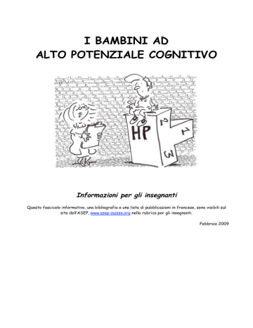 I BAMBINI AD ALTO POTENZIALE COGNITIVO Informazioni per gli insegnanti Questo fascicolo informativo, una bibliografia e una lista di pubblicazioni in francese, sono visibili sul sito dell’ASEP, www.asep-suisse.org nella rubrica per gli insegnanti. Febbraio 2009 ASEP, Association Suisse pour les Enfants Précoces INDICE Bambini ad alto potenziale cognitivo: dal mito alla realtà Come si riconosce un bambino alto potenziale cognitivo Lo smarrimento del bambino alto potenziale cognitivo I test QI Cosa misura il QI Come accorgersi dei bambini AP a scuola Caratteristiche dei bambini AP in classe Un funzionamento intellettuale differente Un bisogno di riconoscimento Un bisogno di complessità Un bisogno di motivazione Delle soluzioni L’accelerazione L’arricchimento L’approfondimento Apprendimento dei metodi: i metodi di apprendimento In conclusione Bibliografia pag. 2 ASEP, Association Suisse pour les Enfants Précoces BAMBINI AD ALTO POTENZIALE COGNITIVO: DAL MITO ALLA REALTA’ Mito: un piccolo genio, dalla conoscenza enciclopedica, studioso, con la risposta a tutto, sempre pronto ad andare avanti in classe ... La realtà deriva da un terribile equivoco: i bambini il cui quoziente intellettivo è nella fascia medio-alta (tra 100 e 125/130) attivi, attraenti, con buone competenze linguistiche, che iniziano a leggere e scrivere facilmente verso i 6 - 7 anni, sono talvolta identificati dagli insegnanti come bambini ad alto potenziale, quando in verità si tratta di bravi allievi, applicati e socievoli (spesso si confonde, a torto, l’efficienza cognitiva con l’efficacia scolastica). In realtà il ragazzo ad alto potenziale cognitivo (QI tra 125/130 e 160) è spesso un bambino difficile che ha incontrato rapidamente dei problemi d’integrazione nella scuola. In classe, l’allievo ad APC evita, in generale, di farsi notare troppo performante; consapevole della sua differenza, cerca di nasconderla facendo a volte volontariamente degli errori. Egli non ama imparare a memoria, è raramente un bravo studente. Contando esclusivamente sulla sua memoria, manca di metodo e d’organizzazione, è insaziabile sugli argomenti che lo appassionano e cambia sovente i suoi centri d’interesse. Il suo sviluppo motorio non è in rapporto con la sua precocità intellettuale, scrive male, è spesso maldestro nelle attività manuali o sportive e il lavoro scolastico è ben lungi dall'essere soddisfacente. I suoi insegnanti dicono che “potrebbe fare di meglio.” Dai suoi insegnanti può essere considerato come pigro, irrequieto, dirompente, o sognatore, “altrove”. Questo bambino vive molto male la sua differenza. Soprattutto dal momento che è negata o male accettata. pag. 3 ASEP, Association Suisse pour les Enfants Précoces Quando il talento del ragazzo viene riconosciuto, alcuni insegnanti sono tentati di rispondere dicendo che non necessita d’aiuto, perché è già così ben dotato. Oppure che “siccome è intelligente, sta a lui mettersi al livello degli altri”. Tuttavia, è un po’ come chiedere ad un bambino d’intelligenza normale di trascorrere la sua vita scolastica in classi per ritardati mentali e di mettersi al loro livello. Solo una informazione chiara e dettagliata può dissipare questo tragico equivoco. E’ terribile per un bambino essere considerato ciò che non è, di non essere riconosciuto per quello che è. Pertanto, in caso di dubbio, dopo aver letto le caratteristiche descritte qui di seguito, si raccomanda vivamente d’incontrare i genitori e consultare uno psicologo specializzato e sperimentato, che potrà procedere ad un bilancio psicologico del bambino in questione. Più presto un bambino ad alto potenziale viene identificato, riconosciuto ed accettato dal proprio entourage, tanto più esso si realizzerà, in accordo con se stesso e con l'immagine che gli altri hanno di lui, ed avrà la possibilità di vivere armoniosamente la sua vita scolastica, sociale ed emozionale. pag. 4 ASEP, Association Suisse pour les Enfants Précoces COME SI RICONOSCE UN BAMBINO AD ALTO POTENZIALE COGNITIVO? • Molto presto, il bambino precoce cerca stimoli. Non ama le attività ripetitive e la routine. S’interessa profondamente a qualche cosa, poi quando ha l’impressione di averne “fatto il giro”, cambia interesse. • L'uso del linguaggio è, in generale, precoce: non c'è un “linguaggio infantile”. • L'anticipo della padronanza linguistica spesso significa imparare a leggere prima della prima elementare, e spesso da solo, senza che nessuno abbia spinto il bambino a farlo. • Grande curiosità: il bambino fa molte domande, ha molti “perché?”. Questi interrogativi s’orientano abbastanza velocemente su questioni d’ordine metafisico. L'origine dell'universo, l’origine dell'uomo, la preistoria l’interessano spesso. • Il ritardo, la di-sincronia, è notevole – tra la pertinenza delle sue osservazioni e un comportamento che può essere molto “infantile” - tra la comprensione e la goffaggine in determinate attività, “pratiche” o sportive. • Elevata sensibilità - e in particolare, molto sensibile alle ingiustizie. • Grande senso dell'umorismo. • La noia in classe si manifesta spesso già alla scuola dell’infanzia. • Difficoltà d’integrazione nel gruppo, cosa che si può vedere molto presto; di solito il bambino precoce preferisce la compagnia degli adulti - o, almeno, di bambini più grandi di lui. • Di fatto è in avanti. Il QI traduce questo vantaggio in un numero. • Tutti questi segni non appaiono obbligatoriamente in tutti i ragazzi AP, perché ognuno è differente. Ma la combinazione di più segni permette di fare delle ipotesi ... In particolare l’apprendimento della lettura, solo, senza aiuti di sorta, è un segno sicuro. pag. 5 ASEP, Association Suisse pour les Enfants Précoces LO SMARRIMENTO DEL BAMBINO AD ALTO POTENZIALE COGNITIVO Già dalla scuola materna, questi ragazzi hanno dei problemi ed alcuni non sanno come si