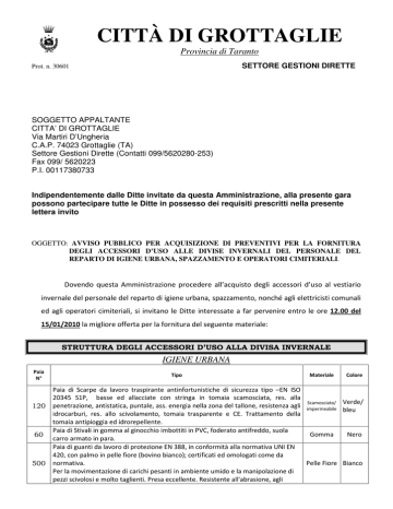 CITTÀ DI GROTTAGLIE Provincia di Taranto SETTORE GESTIONI DIRETTE Prot. n. 30601 SOGGETTO APPALTANTE CITTA’ DI GROTTAGLIE Via Martiri D’Ungheria C.A.P. 74023 Grottaglie (TA) Settore Gestioni Dirette (Contatti 099/5620280-253) Fax 099/ 5620223 P.I. 00117380733 Indipendentemente dalle Ditte invitate da questa Amministrazione, alla presente gara possono partecipare tutte le Ditte in possesso dei requisiti prescritti nella presente lettera invito OGGETTO: AVVISO PUBBLICO PER ACQUISIZIONE DI PREVENTIVI PER LA FORNITURA DEGLI ACCESSORI D’USO ALLE DIVISE INVERNALI DEL PERSONALE DEL REPARTO DI IGIENE URBANA, SPAZZAMENTO E OPERATORI CIMITERIALI. Dovendo questa Amministrazione procedere all’acquisto degli accessori d’uso al vestiario invernale del personale del reparto di igiene urbana, spazzamento, nonché agli elettricisti comunali ed agli operatori cimiteriali, si invitano le Ditte interessate a far pervenire entro le ore 12.00 del 15/01/2010 la migliore offerta per la fornitura del seguente materiale: STRUTTURA DEGLI ACCESSORI D’USO ALLA DIVISA INVERNALE IGIENE URBANA Paia N° Tipo Materiale Colore Paia di Scarpe da lavoro traspirante antinfortunistiche di sicurezza tipo –EN ISO 20345 S1P, basse ed allacciate con stringa in tomaia scamosciata, res. alla Scamosciato/ Verde/ 120 penetrazione, antistatica, puntale, ass. energia nella zona del tallone, resistenza agli impermeabile bleu idrocarburi, res. allo scivolamento, tomaia trasparente e CE. Trattamento della tomaia antipioggia ed idrorepellente. Paia di Stivali in gomma al ginocchio imbottiti in PVC, foderato antifreddo, suola Gomma Nero 60 carro armato in para. Paia di guanti da lavoro di protezione EN 388, in conformità alla normativa UNI EN 420, con palmo in pelle fiore (bovino bianco); certificati ed omologati come da Pelle Fiore Bianco 500 normativa. Per la movimentazione di carichi pesanti in ambiente umido e la manipolazione di pezzi scivolosi e molto taglienti. Presa eccellente. Resistente all'abrasione, agli strappi, ai tagli e alle perforazioni. Strato in lattice con finitura adesiva rugosa su supporto lavorato Kevlar® senza cuciture. CIMITERO COMUNALE Paia N° Tipo Materiale 12 Paia di Scarpe da lavoro traspirante antinfortunistiche di sicurezza tipo –EN ISO 20345 S1P, basse ed allacciate con stringa in tomaia scamosciata, res. alla penetrazione, antistatica, puntale, ass. energia nella zona del tallone, resistenza agli idrocarburi, res. allo scivolamento, tomaia trasparente e CE. Trattamento della tomaia antipioggia ed idrorepellente. Scamosciato/ impermeabile 6 Paia di Stivali in gomma al ginocchio imbottiti in PVC, foderato antifreddo, suola carro armato in para. 200 Colore Verde/ bleu Gomma Nero PVC Rosso Paia di guanti da lavoro di protezione EN 388, in conformità alla normativa UNI EN 420, con palmo in PVC lunghi non meno di cm 32; certificati ed omologati come da normativa. ELETTRICISTI Paia N° 4 4 100 200 Tipo Paia di Scarpe da lavoro traspiranti antinfortunistiche di sicurezza –EN 347- S1P alte ed allacciate con stringa in crosta di vitello, fodera antibatterica con protezione al malleolo; sottopiede antistatico tipo polivital, suola di gomma nitrilica antiscivolo, antiolio, tipo PU2D; puntale di protezione; trattamento della pelle antipioggia ed idrorepellente. Paia di Stivali in gomma al ginocchio imbottiti in PVC, foderato antifreddo, suola carro armato in para. Paia di guanti da lavoro di protezione EN 388, in conformità alla normativa UNI EN 420, con palmo in PVC lunghi non meno di cm 35; certificati ed omologati come da normativa. Per la movimentazione di carichi pesanti in ambiente umido e la manipolazione di pezzi scivolosi e molto taglienti. Presa eccellente. Resistente all'abrasione, agli strappi, ai tagli e alle perforazioni. Strato in lattice con finitura adesiva rugosa su supporto lavorato Kevlar® senza cuciture. Materiale Colore Vera Pelle Marrone Gomma Nero PVC Rosso Bianco/vari Detto preventivo offerta, redatto su foglio intestato e contenuto in una busta chiusa, deve portare all’esterno, oltre agli indirizzi del destinatario e del mittente, anche la scritta “PREVENTIVO FORNITURA ACCESSORI D’USO ALLE DIVISE INVERNALI PERSONALE IGIENE URBANA, SPAZZAMENTO E OPERATORI CIMITERIALI”. Deve altresì, chiaramente specificare in cifre ed in lettere il prezzo unitario del materiale offerto, nonché quello complessivo della fornitura. Il prezzo complessivo deve intendersi comprensivo di ogni onere accessorio per la confezione a regola d’arte e la fornitura della massa vestiario suddetta. Nel preventivo deve essere altresì autocertificata la produzione “Made in Italy” del materiale offerto. La ditta che avrà offerto il prezzo più basso sarà nominata aggiudicataria provvisoria della fornitura. L’aggiudicazione definitiva avverrà solo dopo l’esibizione della campionatura e il parere positivo, espresso da tecnico comunale, di corrispondenza tra il vestiario offerto e il vestiario richiesto con la presente lettera. La Ditta aggiudicataria dovrà effettuare entro gg. 7 dall’avviso di aggiudicazione definitivo, presso il luogo di lavoro del committente, la misurazione individuale delle scarpe e stivali e, dopo aver acquisito tutte le misurazioni, potrà effettuare la fornitura, che comunque dovrà avvenire entro 45 gg. dalla data di aggiudicazione definitiva della fornitura, in colli individuali per ogni singolo dipendente predisposti dalla Ditta aggiudicataria secondo il corredo indicato dall’Ufficio Ambiente. Tutte le Ditte interessate dovranno a far pervenire entro le ore 12.00 del 15/01/2010 il miglior preventivo per la fornitura di divise invernali nelle caratteristiche e nei quantitativi sopraindicati, al seguenti indirizzo Comune di Grottaglie – Ufficio Gestioni Dirette – Via Martiri d’Ungheria 1 – 74023 GROTTAGLIE. Qualora la Ditta aggiudicataria non provveda entro il termine suddetto alla fornitura, sarà tenuta al pagamento di una penale di €. 150,00 (C