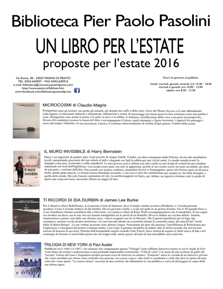 Biblioteca Pier Paolo Pasolini UN LIBRO PER L’ESTATE proposte per l’estate 2016 Via Roma, 38 - 33037 PASIAN DI PRATO TEL. 0432-645957 - FAX 0432-645915 e-mail: [email protected] http://www.pasian.it/bibliote.htm www.facebook.com/bibliotecapasiandiprato Orari di apertura al pubblico: lunedì, martedì, giovedì, venerdì: ore 14.30 - 18.30 martedì e giovedì: ore 10.00 - 12.00 sabato: ore 8.30 - 12.30 MICROCOSMI di Claudio Magris Protagonisti sono gli uomini, ma anche gli animali, gli abitanti dei caffè o delle isole, l'orso del Monte Nevoso e il cane abbandonato nella laguna, rivoluzionari indomiti e dimenticati, infatuazioni e manie di personaggi che hanno perso la loro esistenza come una partita a carte. Protagonisti sono anche le pietre e le onde, la neve e la sabbia, le frontiere, un'inflessione della voce o un gesto inconsapevole... Diversi fili conduttori tessono la trama del libro e accompagnano il lettore, quali immagini o figure ricorrenti: i rapporti fra paesaggi e senso del tempo, l'identità e la sua incertezza, l'amore, il continuo attraversamento di confini d'ogni genere, l'ombra della morte. IL MURO INVISIBILE di Harry Bernstein Harry è un ragazzino di quattro anni, il più piccolo di cinque fratelli. Il padre, un ebreo immigrato dalla Polonia, lavora alle manifatture tessili, sperperando gran parte del suo salario al pub e sfogando sui figli la rabbia per una vita di stenti. La madre manda avanti la famiglia come può, ricorrendo a mille espedienti. La loro povera casa si allinea con altre simili su una strada di ciottoli di una cittadina industriale nel nord dell'Inghilterra. Una strada come tante, ma solo in apparenza, perché al suo centro scorre un muro invisibile: gli ebrei da una parte, i cristiani dall'altra. Due mondi con usanze, credenze, pregiudizi diversi si fronteggiano, quasi non fossero parte di un'unica realtà, quella della miseria. La Prima Guerra Mondiale incombe, e con essa eventi che cambieranno per sempre la vita della famiglia, e quella della strada. Ma solo l'amore contrastato di Lily, la sorella maggiore di Harry, per Arthur, un ragazzo cristiano, sarà in grado di aprire una crepa nel muro, lasciando filtrare un raggio di luce. TI RICORDI DI IDA DURBIN di James Lee Burke Per il detective Dave Robicheaux, la Louisiana è terra di fantasmi: dove il tempo sembra scorrere all'indietro, e i ricordi possono uccidere. Come il ricordo inatteso di Ida Durbin. Ida era giovane e bella, e svanì nel nulla in un giorno d'estate. Era il '58 quando Dave e il suo fratellastro Jimmie conobbero Ida a Galveston. Lei cantava i blues di Kitty Wells accompagnandosi con il mandolino. Il suo sogno era incidere un disco, ma la sua vita era rimasta intrappolata tra le pareti di un bordello. Doveva saldare un vecchio debito. Jimmie, innamoratosi a prima vista delle sue chiome rosse, voleva scappare con lei in Messico. Ma il giorno pianificato per la fuga, Ida scomparve, portata via da un'auto misteriosa. Un caso ben più attuale sta scuotendo intanto la comunità cajun: gli omicidi del "serial killer di Baton Rouge". Le sue vittime accertate sono almeno cinque. Nonostante gli anni che passano, l'insofferenza di Robicheaux per l'ingiustizia e l'arroganza del potere è rimasta intatta. Così come il genuino desiderio di andare oltre la ferita razziale che non ha mai smesso di lacerare la sua terra. Protetto dall'inseparabile angelo custode Clete Purcel, Dave tenterà di seguire le labili tracce di Ida e nel contempo di fermare il serial killer prima che sia troppo tardi, anche grazie all'aiuto di una incredibile suora-attivista. TRILOGIA DI NEW YORK di Paul Auster Pubblicati tra il 1985 e il 1987, i tre romanzi che compongono questa "Trilogia" sono raffinate detective stories in cui le strade di New York fanno da cornice e palcoscenico a una profonda inquietudine esistenziale. "Città di vetro" è la storia di uno scrittore di gialli che "accetta" l'errore del caso e fingendosi un'altra persona cerca di risolvere un mistero. "Fantasmi" narra la vicenda di un detective privato che viene assoldato per tenere sotto controllo una persona, ma a poco a poco i due ruoli si scambiano e colui che doveva spiare diventa colui che viene spiato. "La stanza chiusa" racconta di uno scrittore che abbandona la vita pubblica e cerca di distruggere le copie della sua ultima opera. NON LASCIARMI di Kazuo Ishiguro Kathy, Tommy e Ruth vivono in un collegio, Hailsham, immerso nella campagna inglese. Non hanno genitori, ma non sono neppure orfani, e crescono insieme ai compagni, accuditi da un gruppo di tutori, che si occupano della loro educazione. Fin dalla più tenera età nasce fra i tre bambini una grande amicizia. La loro vita, voluta e programmata da un'autorità superiore nascosta, sarà accompagnata dalla musica dei sentimenti, dall'intimità più calda al distacco più violento. Una delle responsabili del collegio, che i bambini chiamano semplicemente Madame, si comporta in modo strano con i piccoli. Anche gli altri tutori hanno talvolta reazioni eccessive quando i bambini pongono domande apparentemente semplici. Cosa ne sarà di loro in futuro? Che cosa significano le parole "donatore" e "assistente"? E perché i loro disegni e le loro poesie, raccolti da Madame in un luogo misterioso, sono così importanti? Non lasciarmi è prima di tutto una grande storia d'amore. È anche un romanzo politico e visionario, dove viene messa in scena un'utopia al rovescio che non vorremmo mai vedere realizzata. È uno di quei libri che agiscono sul lettore come lenti d'ingrandimento: facendogli percepire in modo intenso la fragilità e la finitezza di qualunque vita. DOVE NESSUNO TI TROVERA’ di Alicia Giménez-Bartlett Anni Cinquanta del secolo scorso. Lucien Nourissier, psichiatra di Parigi studioso di menti criminali, prende contatto con un giornalista spiantato di Barcellona, Carlos Infante, autore di un servizio sulla Pastora. Donna e uomo, partigiana e bandito, datasi alla macchia per connat