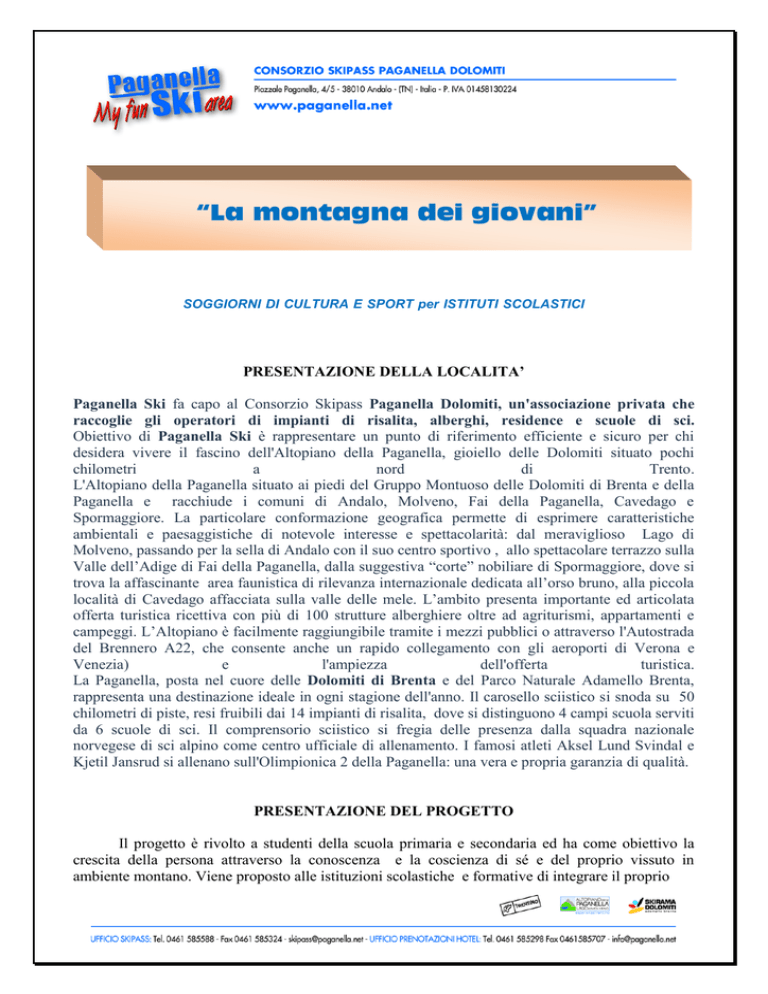 “La montagna dei giovani” SOGGIORNI DI CULTURA E SPORT per ISTITUTI SCOLASTICI PRESENTAZIONE DELLA LOCALITA’ Paganella Ski fa capo al Consorzio Skipass Paganella Dolomiti, un'associazione privata che raccoglie gli operatori di impianti di risalita, alberghi, residence e scuole di sci. Obiettivo di Paganella Ski è rappresentare un punto di riferimento efficiente e sicuro per chi desidera vivere il fascino dell'Altopiano della Paganella, gioiello delle Dolomiti situato pochi chilometri a nord di Trento. L'Altopiano della Paganella situato ai piedi del Gruppo Montuoso delle Dolomiti di Brenta e della Paganella e racchiude i comuni di Andalo, Molveno, Fai della Paganella, Cavedago e Spormaggiore. La particolare conformazione geografica permette di esprimere caratteristiche ambientali e paesaggistiche di notevole interesse e spettacolarità: dal meraviglioso Lago di Molveno, passando per la sella di Andalo con il suo centro sportivo , allo spettacolare terrazzo sulla Valle dell’Adige di Fai della Paganella, dalla suggestiva “corte” nobiliare di Spormaggiore, dove si trova la affascinante area faunistica di rilevanza internazionale dedicata all’orso bruno, alla piccola località di Cavedago affacciata sulla valle delle mele. L’ambito presenta importante ed articolata offerta turistica ricettiva con più di 100 strutture alberghiere oltre ad agriturismi, appartamenti e campeggi. L’Altopiano è facilmente raggiungibile tramite i mezzi pubblici o attraverso l'Autostrada del Brennero A22, che consente anche un rapido collegamento con gli aeroporti di Verona e Venezia) e l'ampiezza dell'offerta turistica. La Paganella, posta nel cuore delle Dolomiti di Brenta e del Parco Naturale Adamello Brenta, rappresenta una destinazione ideale in ogni stagione dell'anno. Il carosello sciistico si snoda su 50 chilometri di piste, resi fruibili dai 14 impianti di risalita, dove si distinguono 4 campi scuola serviti da 6 scuole di sci. Il comprensorio sciistico si fregia delle presenza dalla squadra nazionale norvegese di sci alpino come centro ufficiale di allenamento. I famosi atleti Aksel Lund Svindal e Kjetil Jansrud si allenano sull'Olimpionica 2 della Paganella: una vera e propria garanzia di qualità. PRESENTAZIONE DEL PROGETTO Il progetto è rivolto a studenti della scuola primaria e secondaria ed ha come obiettivo la crescita della persona attraverso la conoscenza e la coscienza di sé e del proprio vissuto in ambiente montano. Viene proposto alle istituzioni scolastiche e formative di integrare il proprio curricolo con esperienze di avvicinamento all’ambiente montano nelle molteplici situazioni al fine di legare maggiormente i ragazzi al territorio, renderli consapevoli delle potenzialità ed apprezzare i valori che vengono trasmessi con tali contatti. Nella fattispecie il territorio viene vissuto nella stagione apparentemente “dormiente” come l’inverno con attività motorie di carattere sportivo ma anche con integrazione e multiculturalità con altre discipline. Riteniamo che effettuare un percorso formativo all’aria aperta, in un contesto ambientale di pregio e guidati da persone competenti ed attente, possa contribuire in maniera efficace all’acquisizione di valori e stili di vita positivi. La nostra proposta. I programmi sotto riportati sono stati pensati per periodi di soggiorno compresi tra 3 e 6 giorni. L’attività principale sarà quella sportiva legata allo sci, ad essa verranno integrate altre attività multidisciplinari come la conoscenza dell’ambiente montano, la conoscenza della neve e della meteorologia , esercitazioni pratiche e prove di soccorso nella neve con strumenti come ARVA e RECCO, ecc.., conoscenza delle tecnologie e del funzionamento degli impianti di risalita. STAFF Tutte le attività sono organizzate dallo scrivente con la collaborazione di uno staff particolarmente qualificato quale: Accompagnatori di Territorio, Maestri di Sci, Giude Alpine, ecc.. Le figure professionali sono altamente preparate e competenti nelle specifiche discipline e seguiranno i ragazzi nella loro attività durante l’arco dell’intera giornata, dalla mattina fino alla sera, fornendo tutto il materiale e/o le attrezzature necessarie (sci, scarponi, noleggio, deposito, ecc…). Esempio soggiorno di 4 giorni: I° giorno mattina: scuola sci con lezioni collettive per 3 ore di sci alpino e snowboard; pranzo: in hotel o presso i rifugi della skiarea; pomeriggio: attività didattica con escursione con le racchette da neve (guide e/o accompagnatori di territorio) alla scoperta delle tracce degli animali nel Parco Naturale Adamello Brenta; pomeriggio: attività didattica con soccorso alpino; esercitazione di soccorso e prevenzione rischio valanghe con utilizzo apparecchiatura ARVA e RECCO; cena: in hotel; sera: proiezione DVD sulla nascita delle Dolomiti, patrimonio dell’Umanità ed intervento di un esperto accompagnatore di territorio; II° giorno mattina: scuola sci con lezioni collettive per 3 ore di sci alpino e snowboard; pranzo: in hotel o presso i rifugi della skiarea; pomeriggio: attività didattica; visita al Museo degli Usi e Costumi delle genti Trentine con organizzazione percorso didattico nelle 40 sale inerenti alla tecnologia locale di montagna (ricostruzione del mulino, della segheria, ecc..). pomeriggio: attività didattica visita alla centrale di pompaggio innevamento artificiale e dimostrazione manovra gatto delle nevi; sera: libera; III° giorno mattina: scuola sci con lezioni collettive per 3 ore di sci alpino e snowboard; pranzo: in hotel o presso i rifugi della skiarea; pomeriggio: gara di sci fine corso; consegna tessera di classificazione ufficiale della scuola sci italiana; pomeriggio: corso con esperti primo intervento conoscenza e rispetto delle proprie capacità motorie e reazioni fisiologiche, respiratorie, cardiache. Il programma preso ad esempio, coniuga l’attività sportiva e motoria con l’attività didattica e culturale, lo stesso potr