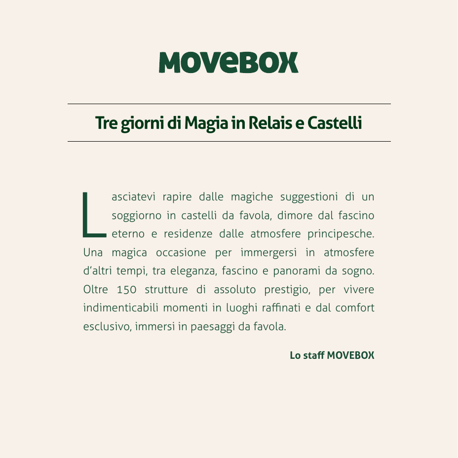 Tre giorni di Magia in Relais e Castelli L asciatevi rapire dalle magiche suggestioni di un soggiorno in castelli da favola, dimore dal fascino eterno e residenze dalle atmosfere principesche. Una magica occasione per immergersi in atmosfere d’altri tempi, tra eleganza, fascino e panorami da sogno. Oltre 150 strutture di assoluto prestigio, per vivere indimenticabili momenti in luoghi raffinati e dal comfort esclusivo, immersi in paesaggi da favola. Lo staff MOVEBOX nord italia La mappa delle esperienze VAL D’AOSTA VILLA FRIDAU pag. 19 4 1 13 14 11 6 2 9 PIEMONTE CASTELLO DI CAMINO CASTELLO DI TAGLIOLO CASTELLO ROSSO GOLDEN PALACE TORINO HOTEL LE RONDINI ROCCA CIVALIERI ROMA IMPERIALE HOTEL TALICE RADICATI TENUTA LA ROMANA VALGRANDE RELAIS I CASTAGNONI LOMBARDIA QUALITY HOTEL SAN MARTINO ACQUASERIA ALBERGO RELAX CORTE UCCELLANDA EXCELSIOR PALACE BOARIO HOTEL ACQUAVIVA IL CASTELLETTO LA FIORIDA RIZZI ACQUACHARME PIEVE DI PISOGNE VILLA DELLE ORTENSIE HOTEL ST. GEORGE VILLA CASTELBARCO TRENTINO CAVALLINO BIANCO MASO DOSS HOTEL PANORAMA VILLA BERTAGNOLLI VENETO ABANORITZ HOTEL ALCOVA DEL DOGE CASTELBRANDO RESIDENZA CA’ ZANARDI GAARTEN HOTEL VILLA BONOMO HOTEL IL CANOVA GARDALAND HOTEL HOTEL PRINCIPE LOCANDA CANDOLA VILLA BRAIDA pag. 21 pag. 22 pag. 23 pag. 24 pag. 25 pag. 27 pag. 28 pag. 29 pag. 30 pag. 31 pag. 32 pag. 33 pag. 34 pag. 35 pag. 36 pag. 37 pag. 38 pag. 39 pag. 40 pag. 41 pag. 43 pag. 45 pag. 46 pag. 47 pag. 49 pag. 51 pag. 52 pag. 53 pag. 54 pag. 55 pag. 57 pag. 58 pag. 59 pag. 60 pag. 61 pag. 63 pag. 65 pag. 66 pag. 67 VILLA GASPARINI VILLA TACCHI HOTEL ANTARES FRIULI IL MILIONE COUNTRY HOUSE CASTELLO DI SPESSA LIGURIA CASTELLARO GOLF RESORT GRAND HOTEL SAVOIA PALAZZO FIESCHI TORRE CAMBIASO RIVIERA DEI FIORI AREGAI MARINA EMILIA ROMAGNA CASTELLO DI MONTEGRIDOLFO HELVETIA THERMAL SPA VILLA RONCUZZI HOTEL PORTA SAN MAMOLO HOTEL POSTA LA LOCANDA DI BAGNARA LOCANDA DEL FEUDO MARE TERMALE VILLAGGIO DELLA SALUTE + RIPAGRANDE HOTEL pag. 68 pag. 69 pag. 70 pag. 71 pag. 73 pag. 74 pag. 75 pag. 77 pag. 79 pag. 80 pag. 81 pag. 83 pag. 85 pag. 87 pag. 88 pag. 89 pag. 91 pag. 92 pag. 93 pag. 95 CENTRO italia La mappa delle esperienze SAN MARINO GRAND HOTEL PRIMAVERA RSM 1 24 8 13 2 11 pag. 97 TOSCANA BORGO VILLA CASTELLETTI ANTICO CASALE DI SCANSANO CALAMIDORO HOTEL CASA HOWARD FIRENZE RELAIS CHIOSTRO DI PIENZA CASTELLO DI TORNANO HOTEL COLUMBIA PALAZZO TOLOMEI Renaissance Tuscany Il Ciocco Resort & Spa PALAZZO LEOPOLDO PALAZZO SAN LORENZO PALAZZO SAN NICCOLO’ PARK HOTEL VILLA ARISTON RELAIS VILLA BALDELLI SATURNIA TUSCANY HOTEL HOTEL SCILLA TOSCANA VERDE L’ULTIMO MULINO VILLA FIESOLE VILLA AUREA VILLA CAMPESTRI OLIVE OIL RESORT VILLA DEI BOSCONI VILLA LE RONDINI LA BORGHETTA pag. 99 pag. 100 pag. 101 pag. 102 pag. 103 pag. 105 pag. 106 pag. 107 pag. 109 pag. 111 pag. 112 pag. 113 pag. 115 pag. 116 pag. 117 pag. 118 pag. 119 pag. 120 pag. 121 pag. 122 pag. 123 pag. 124 pag. 125 pag. 127 UMBRIA RELAIS BORGO BRUFA CASTELLO DI PETROIA HEALTH CENTER MARC MESSEGUE ANTICO CASALE DI MONTEGUALANDRO HOTEL PALAZZO BONTADOSI LE 3 VASELLE RESORT & SPA RELAIS DUCALE RELAIS TENUTA DEI CICLAMINI RIPA RELAIS COLLE DEL SOLE VILLA CICONIA LE DIMORE DI SAN CRISPINO LE TERRE DEL VERDE VILLA VALENTINA TERME pag. 129 pag. 131 pag. 132 pag. 133 pag. 135 pag. 137 pag. 138 pag. 139 pag. 140 pag. 141 pag. 142 pag. 143 pag. 145 MARCHE BORGO STORICO SEGHETTI PANICHI GRAND HOTEL MICHELACCI HOTEL BONCONTE ALBERGO SAN DOMENICO pag. 147 pag. 148 pag. 149 pag. 151 HOTEL VITTORIA RESIDENZA 100 TORRI VILLA CARLO RELAIS 2 CAMPANILI pag. 152 pag. 153 pag. 155 pag. 156 LAZIO LEO HOTEL RELAIS CASTRUM BOCCEA CASTELLO DI PROCENO CASTELLO ORSINI GRAND HOTEL HELIO CABALA TORRE SANT’ANGELO CASA HOWARD ROMA HOTEL CILICIA RELAIS FALISCO SAN GIOVANNI HOLIDAY INN ROMA VILLA ROMANA pag. 157 pag. 159 pag. 161 pag. 163 pag. 165 pag. 167 pag. 168 pag. 169 pag. 170 pag. 171 pag. 172 ABRUZZO VILLA MON REPOS SEXTANTIO pag. 173 pag. 175 La mappa delle esperienze SUD italia 1 9 8 3 5 4 MOLISE DIMORA DEL PRETE DI BELMONTE pag. 177 CAMPANIA SAN FRANCESCO AL MONTE ALBERGO LA VIGNA DECUMANI HOTEL DE CHARME CASA RAFFAELE CONFORTI CHIAIA HOTEL DE CHARME GRAND HOTEL OSMAN HOTEL ORIZZONTE VILLA RIZZO RESORT & SPA pag. 179 pag. 180 pag. 181 pag. 182 pag. 183 pag. 184 pag. 185 pag. 186 BASILICATA LA LOCANDA DELLE DONNE MONACHE SEXANTIO GROTTE DELLA CIVITA RESIDENCE SAN GIORGIO pag. 187 pag. 189 pag. 190 PUGLIA PALACE HOTEL LUCERA HILTON GARDEN INN LECCE CORTE ALTAVILLA RELAIS & CHARME RELAIS CORTE PALMIERI PALACE HOTEL SAN MICHELE MASSERIA BARONI NUOVI SOTTO LE CUMMERSE TERRANOBILE METARESORT CALABRIA LA CASA DI GIANNA VILLA SAN DOMENCO VILLA AFRODITE GRAND HOTEL GALATRO TERME SICILIA VILLA TRIGONA CASTELLO SAN MARCO MASSERIA SUSAFA 3 SARDEGNA TARTESH HOTEL HOTEL PANORAMA OLBIA EL FARO HOTEL SU LITHU GEOVILLAGE RESORT OLBIA pag. 191 pag. 192 pag. 193 pag. 195 pag. 196 pag. 197 pag. 198 pag. 199 pag. 200 pag. 201 pag. 203 pag. 205 pag. 206 pag. 207 pag. 209 pag. 211 pag. 213 pag. 214 pag. 215 pag. 216 pag. 217 il catalogo deLle esperienze Tre giorni di Magia in Relais e Castelli 150 soggiorni di 2 notti in incantevoli Castelli, Relais e Dimore d’epoca, per 2 persone DOVE villa fridau 11025 Gressoney St. Jean (AO) APERTURA Tutto l’anno, tutti i giorni. VALLE D’AOSTA NEI DINTORNI Aosta: 78 km Torino: 94 km Gli appartamenti sono dotati di cucina attrezzata, biancheria di camera, asciugacapelli elettrico, linea cortesia, TV a colori, connessione Wi-fi e di rete cablata ethernet. Le zone comuni comprendono: salotto, saletta per bambini, terrazza con solarium, lavanderia, free skiroom con armadietti riscaldati. Villa Fridau Villa Fridau è una tranquilla ed elegante signora ringiovanita per accogliervi. Vive in Valle d’Aosta, a Gressoney Saint Jean, su un grande prato. Suo rifugio segreto è il vicino bosco di aceri ed abeti rossi. Come tutte le signore perbene ha molti interessi: in estate ama perdersi nei sentieri, leggere nel dehors solegg