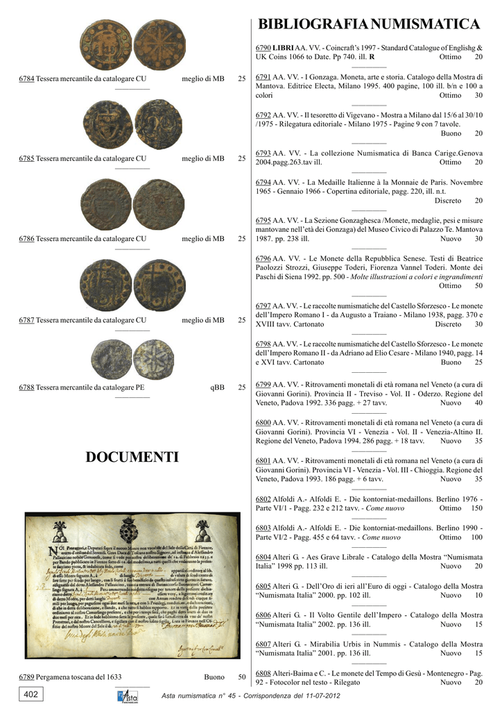 BIBLIOGRAFIA NUMISMATICA 6784 Tessera mercantile da catalogare CU ————— meglio di MB 25 6785 Tessera mercantile da catalogare CU ————— meglio di MB 25 6786 Tessera mercantile da catalogare CU ————— meglio di MB 25 6787 Tessera mercantile da catalogare CU ————— meglio di MB 25 6788 Tessera mercantile da catalogare PE ————— qBB 25 Buono 50 DOCUMENTI 6789 Pergamena toscana del 1633 ————— 402 6790 LIBRI AA. VV. - Coincraft’s 1997 - Standard Catalogue of Englishg & UK Coins 1066 to Date. Pp 740. ill. R Ottimo 20 ————— 6791 AA. VV. - I Gonzaga. Moneta, arte e storia. Catalogo della Mostra di Mantova. Editrice Electa, Milano 1995. 400 pagine, 100 ill. b/n e 100 a colori Ottimo 30 ————— 6792 AA. VV. - Il tesoretto di Vigevano - Mostra a Milano dal 15/6 al 30/10 /1975 - Rilegatura editoriale - Milano 1975 - Pagine 9 con 7 tavole. Buono 20 ————— 6793 AA. VV. - La collezione Numismatica di Banca Carige.Genova 2004.pagg.263.tav ill. Ottimo 20 ————— 6794 AA. VV. - La Medaille Italienne à la Monnaie de Paris. Novembre 1965 - Gennaio 1966 - Copertina editoriale, pagg. 220, ill. n.t. Discreto 20 ————— 6795 AA. VV. - La Sezione Gonzaghesca /Monete, medaglie, pesi e misure mantovane nell’età dei Gonzaga) del Museo Civico di Palazzo Te. Mantova 1987. pp. 238 ill. Nuovo 30 ————— 6796 AA. VV. - Le Monete della Repubblica Senese. Testi di Beatrice Paolozzi Strozzi, Giuseppe Toderi, Fiorenza Vannel Toderi. Monte dei Paschi di Siena 1992. pp. 500 - Molte illustrazioni a colori e ingrandimenti Ottimo 50 ————— 6797 AA. VV. - Le raccolte numismatiche del Castello Sforzesco - Le monete dell’Impero Romano I - da Augusto a Traiano - Milano 1938, pagg. 370 e XVIII tavv. Cartonato Discreto 30 ————— 6798 AA. VV. - Le raccolte numismatiche del Castello Sforzesco - Le monete dell’Impero Romano II - da Adriano ad Elio Cesare - Milano 1940, pagg. 14 e XVI tavv. Cartonato Buono 25 ————— 6799 AA. VV. - Ritrovamenti monetali di età romana nel Veneto (a cura di Giovanni Gorini). Provincia II - Treviso - Vol. II - Oderzo. Regione del Veneto, Padova 1992. 336 pagg. + 27 tavv. Nuovo 40 ————— 6800 AA. VV. - Ritrovamenti monetali di età romana nel Veneto (a cura di Giovanni Gorini). Provincia VI - Venezia - Vol. II - Venezia-Altino II. Regione del Veneto, Padova 1994. 286 pagg. + 18 tavv. Nuovo 35 ————— 6801 AA. VV. - Ritrovamenti monetali di età romana nel Veneto (a cura di Giovanni Gorini). Provincia VI - Venezia - Vol. III - Chioggia. Regione del Veneto, Padova 1993. 186 pagg. + 6 tavv. Nuovo 35 ————— 6802 Alfoldi A.- Alfoldi E. - Die kontorniat-medaillons. Berlino 1976 Parte VI/1 - Pagg. 232 e 212 tavv. - Come nuovo Ottimo 150 ————— 6803 Alfoldi A.- Alfoldi E. - Die kontorniat-medaillons. Berlino 1990 Parte VI/2 - Pagg. 455 e 64 tavv. - Come nuovo Ottimo 100 ————— 6804 Alteri G. - Aes Grave Librale - Catalogo della Mostra “Numismata Italia” 1998 pp. 113 ill. Nuovo 20 ————— 6805 Alteri G. - Dell’Oro di ieri all’Euro di oggi - Catalogo della Mostra “Numismata Italia” 2000. pp. 102 ill. Nuovo 10 ————— 6806 Alteri G. - Il Volto Gentile dell’Impero - Catalogo della Mostra “Numismata Italia” 2002. pp. 136 ill. Nuovo 15 ————— 6807 Alteri G. - Mirabilia Urbis in Nummis - Catalogo della Mostra “Numismata Italia” 2001. pp. 136 ill. Nuovo 15 ————— 6808 Alteri-Baima e C. - Le monete del Tempo di Gesù - Montenegro - Pag. 92 - Fotocolor nel testo - Rilegato Nuovo 20 Asta numismatica n° 45 - Corrispondenza del 11-07-2012 6809 Amisano G. - La moneta: origine, valori, arte, ... - Serravalle 2001. pp. 286 ill. Nuovo 15 ————— 6810 Amisano G. - La Storia di Roma antica e le sue monete I, Dalle origini alla supremazia in Italia - Formia 2004. Pagg. 227 ill. e 4 Tavv. Nuovo 20 ————— 6811 Amisano G. - La Storia di Roma antica e le sue monete II, L’epopea delle guerre romano-cartaginesi - Formia 2004. Pagg. 188 ill. - Formia 2011 Nuovo 15 ————— 6812 Amisano G. - Le monete della Bibbia e dei Vangeli con monete e parole - Formia 2009. Pagg. 126 ill. Nuovo 10 ————— 6813 Anzani A. - Numismatica Axumita - Milano 1926, Ristampa Forni Pagg. 96+64 ew 12 Tavv. - Copertina telata Nuovo 35 ————— 6814 Attardi G. - Varianti ed errori nelle monete della Repubblica Italiana San Marino 2002/2003 pp. 790 e 300 foto - Assieme a Come nasce una moneta Nuovo 25 ————— 6815 Attardi G. e Gaudenzi G. - Prove-Vairianti-Errori-Falsi nelle monete dei Savoia da Carlo Alberto a Umberto I - pp. 410 e oltre 800 foto - 2008 1000 copie numerate Nuovo 35 ————— 6816 Attardi G. e Gaudenzi G. - Prove-Vairianti-Errori-Falsi nelle monete dei Savoia di Vittorio Emanuele IIII - pp. 760 e oltre 2200 foto - 2010 - 1000 copie numerate Nuovo 70 ————— 6817 Attianese P. - Calabria greca. Opera completa. Voll. I-III - Santa Severina, 1974-1980 - Come nuovi Ottimo 250 ————— 6818 Attianese P. - Calabria greca. Vol. III - Santa Severina, 1980 - Come nuovo ma leggermente macchiato sul taglio Buono 65 ————— 6819 Babelon E. - Description historique et chronologique des monnaies de la Republique Romaine - 2 vol. Ristampa Forni - Come nuovi Ottimo 120 ————— 6820 Banca Popolare di Novara. - La moneta italiana-Un secolo di storia, dal 1870. Novara 1973. 558 pp. ill. a colori - 2 Voll. In cofanetto Ottimo 100 ————— 6821 Banca Popolare di Novara. - La moneta italiana-Un secolo di storia, dal 1870. Novara 1973. 558 pp. ill. a colori - 2 Voll. Con sovracoperta a colori Ottimo 80 ————— 6822 Banti A. - Corpus Nummorum Romanorum - Monetazione Repubblicana. 9 Voll. Firenze 1980-1982. Ottimo 200 ————— 6823 Banti A. - I grandi bronzi imperiali. Vol. IV-3. Filippo I - Postumo. Firenze 1987. 348 pp. Testo in it
