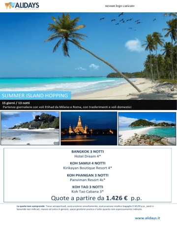 nessun logo caricato SUMMER ISLAND HOPPING 15 giorni / 13 notti Partenze giornaliere con voli Etihad da Milano e Roma, con trasferimenti e voli domestici BANGKOK 3 NOTTI Hotel Dream 4* KOH SAMUI 4 NOTTI Kirikayan Boutique Resort 4* KOH PHANGAN 3 NOTTI Panviman Resort 4s* KOH TAO 3 NOTTI Koh Tao Cabana 3* Quote a partire da 1.426 € p.p. . La quota non comprende: Tasse aeroportuali, assicurazione annullamento, assicurazione medico bagaglio € 60,00 p.p., pasti e bevande non indicati, mance ed extra in genere, spese gestione pratica e tutto quanto non espressamente indicato. www.alidays.it Incluso nella quota: acqua durante le escursioni, assistenza italiana durante tutto il soggiorno, guida parlante italiano, colazione, pranzi e cene, sistemazione negli hotel indicati e transfer da/per aeroporto, voli intercontinentali e domestici. Powered by TCPDF (www.tcpdf.org)