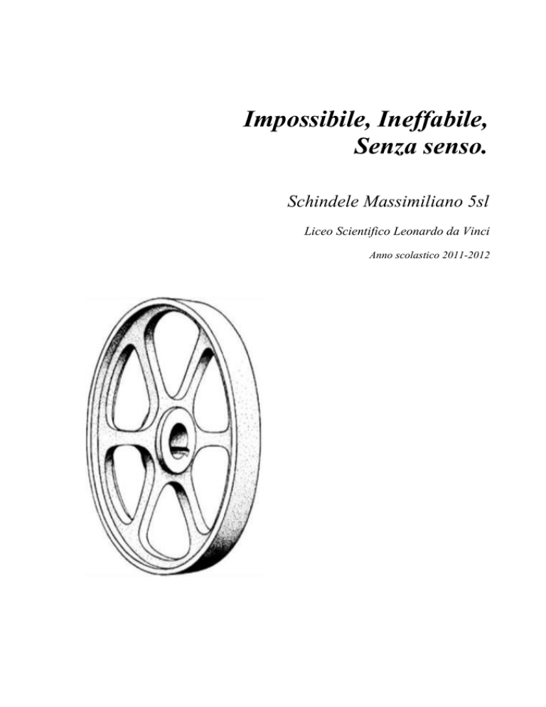 Impossibile, Ineffabile, Senza senso. Schindele Massimiliano 5sl Liceo Scientifico Leonardo da Vinci Anno scolastico 2011-2012 Introduzione 1. Motivazioni e proposito La scelta dell’argomento trattato è stata dettata da un personale interesse per ciò che viene normalmente ritenuto impossibile o assurdo, quali controsensi, giochi di logica e paradossi. Il fine dell’analisi che svilupperò è darne una definizione generale e personale, e dove e quando questo concetto è stato presente nella storia dell’uomo. 2. Riassunto, punti principali e materie toccate Il lavoro è avvenuto partendo da argomenti affrontati nei programmi curricolari di quest’ultimo anno. Partendo dal XXXIII canto del Paradiso della Divina Commedia di Dante Alighieri, la cui analisi si sofferma sui concetti maggiormente inerenti all’argomento trattato, si passa, grazie ad un diretto collegamento costituito da una citazione contentuta nel canto stesso, all’ambito matematico-scientifico, proponendo il classico problema della quadratura del cerchio. Questo, richiedendo come soluzione la costruzione grafica di un numero trascendente, lascia successivamente spazio alla definizione di oggetto impossibile e al ruolo che questi hanno avuto nelle opere dell’artista olandese Maurits Escher. Restando in ambito artistico, si analizza infine il Teatro dell’Assurdo, sviluppatosi nella letteratura inglese del dopoguerra. In particolare viene trattata l’opera Waiting for Godot di Samuel Beckett. Riassumendo, i punti principali sono: • Letteratura italiana (Dante): analisi XXXIII canto del paradiso e del concetto di ineffabilità; • Matematica: problema della quadratura del cerchio e l’impossibile risoluzione; • Storia dell’arte: gli oggetti impossibili nelle opere di Maurits Escher; • Letteratura inglese: Theatre of the Absurd con Waiting for Godot di Samuel Beckett. -2- P Paradiso – Canto Trentatreesimo “Oh quanto è corto il dire e come fioco al mio concetto! e questo, a quel ch’i’ vidi, è tanto, che non basta a dicer ‘poco’.” vv. 121-123 Il canto trentatreesimo del Paradiso di Dante ha luogo nell'Empireo, la sede di tutti i beati; siamo a mezzanotte del 14 aprile 1300 quando il viaggio ultraterreno di Dante raggiunge finalmente la sua meta. Divisibile in due parti principali, il canto si apre con una preghiera di san Bernardo alla Vergine, e la sua intercessione per Dante presso Dio (vv. 1-45). Dopodiché si ha la progressiva conquista da parte del poeta della diretta visione di Dio, fino alla folgorazione finale (vv. 46-145). La preghiera alla Vergine. L’orazione di san Bernardo costituisce il momento finale dell’esperienza poetica di Dante prima della sublime visione di Dio: egli sottolinea dunque la funzione della Madonna quale supremo tramite tra l’uomo e Dio. Questa è inoltre l’ultima delle tante preghiere che percorrono la Divina Commedia ed è divisa in due parti secondo la tradizione: la lode a Maria e la richiesta di grazia e di intercessione. La visione di Dio e i tre misteri della fede cristiana. La seconda parte del canto, conclusiva dell’opera, detta al poeta il compito più impegnativo: descrivere la visione divina. Dante si trova a rappresentare il mistero dell’incarnazione di Cristo: dopo tutto ciò che di miracoloso gli è stato mostrato nel suo viaggio nei tre regni dell’oltretomba, è questa l’ultima e sublime visione, che unisce l’umano al divino e lo conduce infine all’ultima verità e all’immersione nell’Amore universale. La difficoltà che egli affronta nel descrivere esattamente le cose viste nel suo eccezionale viaggio, assume rilievo primario nell’ultima cantica, diventando in questo momento il tema principale della sua poesia e una sorta di denuncia di un’impotenza. Ecco quindi che la narrazione si affolla di immagini indicanti la labilità, l’insufficienza, l’impossibilità della sua visione, ma anche di similitudini e metafore. Tra le più rilevanti: il ricordo della visione di Dio è per Dante come un sogno del quale, dopo essersi svegliati, permane soltanto l’emozione (vv.58-61); -3- esso si è dissolto come la neve al sole o come le parole delle profezie della Sibilla, scompaginate dal vento (vv.64-66). Il poeta tenta inoltre la descrizione “sensibile” di ciò che contempla proponendo l’immagine dei tre cerchi, figura geometrica simbolo della perfezione e rappresentazione dottrinale del mistero della Trinità, sovrapposti e identici, ma di colore diverso (fenomeno impossibile dal punto di vista della scienza ottica). Nei primi due sono raffigurati il Padre e il Figlio, dove il secondo è reflesso, cioè procede dal primo; il terzo cerchio è lo Spirito Santo, fuoco d’amore che eternamente spira fra i primi due.Per rappresentare il mistero dell’Incarnazione, cioè della doppia natura umana e divina di Cristo, Dante afferma di aver visto nel cerchio del Figlio i tratti della figura umana, segnati con lo stesso colore del cerchio, cosa inconcepibile razionalmente, ma proprio per questo efficace a descrivere il mistero. Per esprimere il proprio vano sforzo di comprendere il mistero dell’Incarnazione di Cristo, il poeta usa la similitudine classica del geomètra alle prese con l’eterno e insolubile problema della quadratura del cerchio, incentrato sul rapporto tra diametro e circonferenza, intorno al quale fin dall’antichità si sono inutilmente affannati i matematici. “Qual è ‘l geomètra che tutto s’affigge per misurar lo cerchio, e non ritrova, pensando, quel principio ond’elli indige […]” La quadratura del cerchio Il “misurar lo cerchio”, assieme al problema della duplicazione del cubo e a quello della trisezione dell'angolo, costituisce un problema classico della geometria greca. La quadratura del cerchio non è altro che un classico problema di matematica (più precisamente di geometria) che si prefissa lo scopo di costruire un quadrato che abbia area uguale a quella di un cerchio dato, i