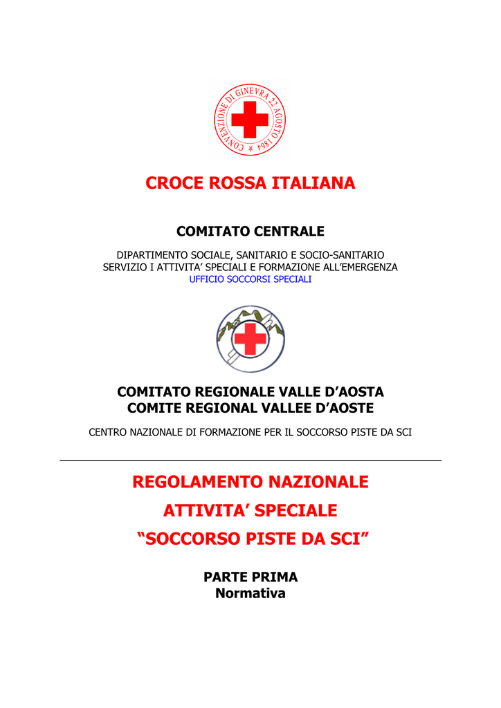 CROCE ROSSA ITALIANA COMITATO CENTRALE DIPARTIMENTO SOCIALE, SANITARIO E SOCIO-SANITARIO SERVIZIO I ATTIVITA’ SPECIALI E FORMAZIONE ALL’EMERGENZA UFFICIO SOCCORSI SPECIALI COMITATO REGIONALE VALLE D’AOSTA COMITE REGIONAL VALLEE D’AOSTE CENTRO NAZIONALE DI FORMAZIONE PER IL SOCCORSO PISTE DA SCI REGOLAMENTO NAZIONALE ATTIVITA’ SPECIALE “SOCCORSO PISTE DA SCI” PARTE PRIMA Normativa CAPO I Definizioni ed Organi ART. 1 Attività Speciale “Soccorso Piste da Sci” Il “Soccorso Piste da Sci”, siglabile “S.P.S.”, è un’attività speciale intercomponente della Croce Rossa Italiana che opera nell’ambito della stessa riconosciuta ai sensi del Decreto del Presidente del Consiglio dei Ministri 6 Maggio 2005, n. 97 recante “Approvazione del nuovo Statuto dell’Associazione Italiana della Croce Rossa” pubblicato sulla G.U. n. 131 dell’8 giugno 2005. Il “S.P.S.” ricomprende al suo interno l’attività speciale di “Soccorso Terreno Innevato”, siglabile “S.T.I.”. L’organizzazione, la gestione tecnica ed operativa, nonché la formazione e l’attività didattica del “S.P.S.” sono disciplinate dal presente Regolamento nonché da piani formativi, raccomandazioni, circolari ed atti emanati dal “Centro Nazionale di Formazione per il Soccorso Piste da Sci” e/o dalla “Commissione Tecnica Nazionale per il Soccorso Piste da Sci”. ART. 2 Compiti Sono compiti del “S.P.S.”: 1. l’assistenza sanitaria, il soccorso e il trasporto dell’infortunato sulle piste da sci alpino e nordico nonché su terreni innevati; 2. l’attività di formazione in materia di assistenza sanitaria, soccorso e trasporto dell’infortunato sulle piste da sci alpino e nordico nonché su terreni innevati; 3. quanto ulteriormente necessario allo svolgimento delle funzioni attribuite agli organismi di cui al presente Regolamento. ART. 3 “Centro Nazionale di Formazione per il Soccorso Piste da Sci” Al “Centro Nazionale di Formazione per il Soccorso Piste da Sci”, siglabile “C.N.F.S.P.S.”, avente sede presso il Comitato Regionale Valle d’Aosta – Comité Régional Vallée d’Aoste, è attribuita l’attività formativa e didattica dell’intero settore. Il “C.N.F.S.P.S.” provvede a disciplinare la propria organizzazione ed attività mediante l’approvazione di un organigramma - recepite le indicazioni di merito da parte del Referente Nazionale - di un Regolamento e dei piani formativi e didattici. Sono atti del “C.N.F.S.P.S.” le delibere, le raccomandazioni e le circolari emanate anche di concerto con la “Commissione Tecnica Nazionale per il Soccorso Piste da Sci”. ART. 4 Compiti Sono compiti del “C.N.F.S.P.S.”: 1. l’organizzazione delle selezioni per aspiranti “Operatori, Istruttori ed Istruttori Nazionali S.P.S.” e “Operatori Soccorso Terreno Innevato”; 2. la formazione e l’aggiornamento degli “Operatori, Istruttori ed Istruttori Nazionali S.P.S.” e degli “Operatori Soccorso Terreno Innevato”; 3. rilasciare il nulla osta per l’attivazione dei corsi di formazione per “Operatori S.P.S.” ai Comitati promotori; 4. la formazione e l’aggiornamento di personale civile e/o militare non appartenente all’Associazione Italiana della Croce Rossa; 5. la formazione e l’aggiornamento per la guida su neve di veicoli speciali quali motoslitte, quadricicli, fuoristrada rivolta a personale civile e/o militare anche esterno alla C.R.I.; 6. il rilascio di attestati e certificazioni ottenute a seguito del superamento del percorso formativo; 7. concorrere alla redazione di capitolati tecnici per uniformi e capi di abbigliamento, mezzi, attrezzature, ecc…; 8. richiedereeventuale verifica dei requisiti di permanenza negli Albi Nazionali di cui agli Artt. 4344-45-46 all'Ufficio Soccorsi Speciali del Comitato Centrale e trasmettere le risultanze alla “Commissione Tecnica Nazionale per il Soccorso Piste da Sci” 9. il concorso, con i “Referenti tecnici Locali, Provinciali e Regionali S.P.S.”, nel favorire lo sviluppo delle “Unità Soccorso Piste da Sci”; 10. elaborare eventuali proposte tecniche ed operative da presentare alla “Commissione Tecnica Nazionale per il Soccorso Piste da Sci”; 11. fornire la collaborazione al “Referente Nazionale S.P.S.” e alla “Commissione Tecnica Nazionale per il Soccorso Piste da Sci”; 12. offrire supporto all'Ufficio Soccorsi Speciali nell'elaborare relazioni statistiche e di monitoraggio delle attività; 13. ricercare le opportune collaborazioni per lo sviluppo delle attività didattiche del settore. Detti scopi, che per motivi organizzativi e/o politiche associative possono essere parzialmente delegati, possono essere attuati con il concorso di altri soggetti tra cui quelli individuati all’Art. 9. ART. 5 “Commissione Tecnica Nazionale per il Soccorso Piste da Sci” Alla “Commissione Tecnica Nazionale per il Soccorso Piste da Sci”, siglabile “C.T.N.S.P.S.”, avente sede presso il Comitato Centrale in Roma, è attribuita l’attività di definizione delle linee strategiche per lo sviluppo del settore operativo recepite le indicazioni del Presidente Nazionale e/o del “Referente Nazionale S.P.S.” di cui all’Art. 41. La “C.T.N.S.P.S.” è composta da: 1. il “Referente Nazionale S.P.S.” di cui all’Art. 41 che la presiede; 2. il “Direttore Tecnico” del “C.N.F.S.P.S.”; 3. un rappresentante per ogni Componente Ausiliaria delle Forze Armate di cui all’Art. 9 del D.P.C.M. 6 Maggio 2005 n. 97 in possesso dei requisiti di cui agli Artt. 18-21-24 ed iscritto in uno degli Albi nazionali di cui ai successivi Artt. 43-44-45; 4. un rappresentante per il personale dipendente in possesso dei requisiti di cui agli Artt. 18-2124 ed iscritto in uno degli Albi nazionali di cui ai successivi Artt. 43-44-45; 5. un funzionario del competente Servizio del Comitato Centrale che svolge le funzioni di segretario verbalizzante. Sono atti della “C.T.N.S.P.S.” le delibere, le r