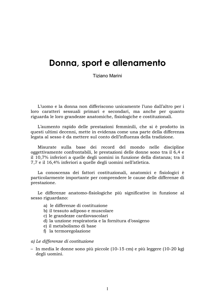 Donna, sport e allenamento Tiziano Marini L’uomo e la donna non differiscono unicamente l’uno dall’altro per i loro caratteri sessuali primari e secondari, ma anche per quanto riguarda le loro grandezze anatomiche, fisiologiche e costituzionali. L’aumento rapido delle prestazioni femminili, che si è prodotto in questi ultimi decenni, mette in evidenza come una parte della differenza legata al sesso è da mettere sul conto dell’influenza della tradizione. Misurate sulla base dei record del mondo nelle discipline oggettivamente confrontabili, le prestazioni delle donne sono tra il 6,4 e il 10,7% inferiori a quelle degli uomini in funzione della distanza; tra il 7,7 e il 16,4% inferiori a quelle degli uomini nell’atletica. La conoscenza dei fattori costituzionali, anatomici e fisiologici è particolarmente importante per comprendere le cause delle differenze di prestazione. Le differenze anatomo-fisiologiche più significative in funzione al sesso riguardano: a) b) c) d) e) f) le differenze di costituzione il tessuto adiposo e muscolare le grandezze cardiovascolari la unzione respiratoria e la fornitura d’ossigeno il metabolismo di base la termoregolazione a) Le differenze di costituzione – In media le donne sono più piccole (10-15 cm) e più leggere (10-20 kg) degli uomini. 1 – La minore statura della donna è dovuta alla sua maturazione ossea più rapida e, quindi, all’ossificazione più precoce delle sue cartilagini di coniugazione. – Le femmine hanno, dalla nascita e malgrado un peso inferiore, in media uno sviluppo osseo in anticipo di due settimane su quello dei maschi. Questo anticipo aumenta negli anni successivi ed arriva a due anni nel momento della pubertà. – La causa sembra essere dovuta al maggior sviluppo e alla maggiore attività secretoria delle ovaie femminili nella fase prepuberale confrontata a quella dei testicoli maschili. – La produzione di basse quantità di estrogeni durante la fase di sviluppo prepuberale del sesso femminile sembra determinare, contemporaneamente, una maturazione scheletrica più rapida e l’inizio della pubertà più precoce. – Lo scheletro femminile è, in media, più leggero di quello maschile del 25%. Tipicamente, la donna presenta un’accentuazione del tronco, l’uomo un’accentuazione delle estremità. – Nella donna esiste, tra il braccio e l’avambraccio, un angolo articolare a forma di X ed un’iperestensibilità. Parametro Maschi Femmine Statura in piedi 174,10 163,84 Statura da seduti 90,79 85,75 Altezza del trocantere 88,09 82,37 Apertura arti superiori 177,67 163,70 Perimetro xifoide medio 77 80 Diametro bi-trocanterico 33,5 33,5 45 41,5 Diametro bi-deltoideo Fonte: Indagine statistica francese del 1969 (Creff, Canu) Tabella 1 Differenze di alcuni parametri maschi / femmine 2 b) Tessuto adiposo e muscolatura – La donna possiede, nei suoi depositi di grasso (sottocutanei), 1,75 volte più grasso dell’uomo. La percentuale di grasso in rapporto al peso totale corporeo è nella donna del 28,2% contro il 18,2% dell’uomo; quindi la donna possiede una percentuale di grasso superiore del 10% di quella dell’uomo. – A causa delle maggiori riserve di grasso e dello scheletro più leggero, le donne dispongono di una densità corporea più bassa (1,05 g/cm2 contro l’1,07 g/cm2 dell’uomo). – L’abbassamento del centro di gravità e l’allungamento del tronco permettono una posizione di nuoto più favorevole, oltre agli arti più corti rispetto all’uomo. – In valore relativo (rapportato al peso corporeo), la parte della muscolatura rappresenta il 35,8% nelle donne non allenate, contro il 41,8% negli uomini non allenati. In valore assoluto, la donna dispone di 23 kg di massa muscolare, contro 35 kg dell’uomo. – Non esiste differenza legata al sesso per quanto riguarda la ripartizione delle fibre muscolari. La proporzione delle fibre rapide e lente è quasi la stessa nei due sessi (Costill, 1976). – In funzione dei gruppi muscolari, la forza della donna rappresenta dal 54 all’80% della forza dell’uomo. – I gruppi muscolari, che possiedono una funzione essenzialmente dinamica, presentano differenze legate al sesso, mentre i muscoli statici sono identici nei due sessi per quanto riguarda la loro allenabilità e la loro capacità di adattamento. – La causa delle differenze di sviluppo e dell’allenabilità della muscolatura nell’uomo e nella donna è da attribuire all’aumentata produzione dell’ormone sessuale maschile (testosterone) nell’uomo, ormone che possiede un effetto anabolizzante. c) La funzione cardio-respiratoria e la fornitura di ossigeno – In generale, si può dire che le vie respiratorie come le narici, la trachea e i bronchi sono meno sviluppati nelle donne, così come i polmoni hanno minore peso e dimensioni inferiori a quelle dell’uomo. – Le caratteristiche polmonari della donna sono inferiori a quelle dell’uomo sia in valori assoluti sia in valori relativi. – Le donne sono svantaggiate rispetto agli uomini anche sul piano del prelevamento dell’ossigeno e della sua utilizzazione periferica: il prelevamento d’ossigeno è ridotto a causa della minor massa e della meno buona capillarizzazione nella donna non allenata. 3 Parametro Femmine Maschi Peso del cuore (assoluto) 250-300 g 300-350 g Peso del cuore (relativo) 4,8 g/kg 5,7 g/kg Volume cardiaco (assoluto) 500-600 ml 600-800 ml Volume cardiaco (relativo) 9,5-10 ml/kg 11-12 ml/kg Volume d’eiezione sistolica (riposo) 40-50 ml 70 ml Volume d’eiezione sistolica (sforzo) 70-90 ml 120 ml Debito cardiaco (riposo) 3-5 litri 4-6 litri Debito cardiaco (sforzo massimo) 12-14 litri 20 litri Frequenza cardiaca (riposo) 70 / minuto 60 / minuto Tabella 2 Grandezze cardiovascolari Caratteristiche cardiache della donna confrontate a quelle dell’uomo (valori medi di soggetti non allenati, tratti dalla letteratura) Parametro Femmine Maschi Capacità polmonare totale 4.5-5.0 litri 6.7-7.0 litri Capacità vita