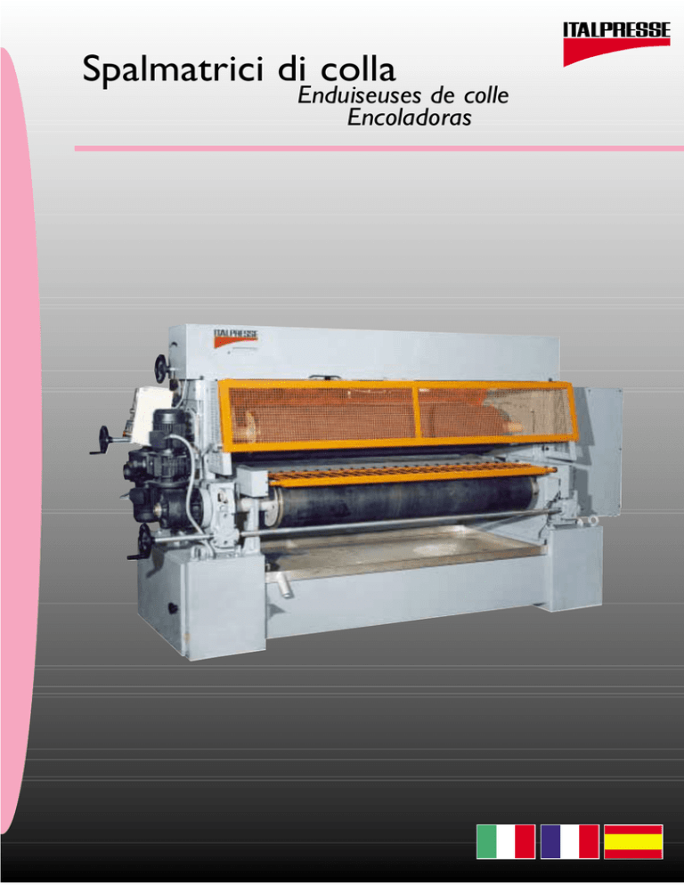 Spalmatrici di colla Enduiseuses de colle Encoladoras L’innovazione per Italpresse é una passione Pour Italpresse, l’innovation est une passion La innovación para Italpresse es una pasión Nel progettare le nostre macchine stabiliamo costantemente i massimi criteri di riferimento. L’affidabilità, la precisione e la facilità d’utilizzo di queste macchine Vi entusiasmeranno senza riserve. Lorsque nous projetons nos machines, nous déterminons constamment les meilleurs critères de référence. La fiabilité, la précision et la facilité d’utilisation de ces machines vous enthousiasmeront sans réserve Al proyectar nuestras máquinas establecemos constantemente los máximos criterios de referencia. La fiabilidad, la precisión y la facilidad de utilización de estas máquinas les entusiasmará sin reservas 2 Una costante assistenza che Vi segue nel mondo Une assistance constante où que vous soyez Una constante asistencia que os sigue por todo el mundo Giusti uomini giusti mezzi: la competitività vincente Italpresse Personnel et moyens adéquats: la compétitivité gagnante Italpresse. Hombres ideales con los apropiados medios: la competitividad ganadora Italpresse Personale specializzato ed una ampia disponibilità di ricambi garantiscono una immediata risposta ad ogni Vostra urgente richiesta sia di carattere operativo che di manutenzione. Du personnel qualifié et une ample disponibilité de pièces détachées : telles sont les garanties pour satisfaire immédiatement toutes vos requêtes urgentes, aussi bien sur le plan opérationnel que de maintenance. Personal especializado y una amplia disponibilidad de recambios garantizan una inmediata respuesta a cada urgente requerimiento por parte vuestra sea de carácter operativo o de mantenimiento. Il nostro Servizio Tecnico é a Vostra disposizione per proporre le soluzioni più adeguate ad ogni specifica esigenza tecnologica e produttiva. L’intera gamma delle nostre macchine, progettate con sistemi AUTOCAD, e con notevole grado di standardizzazione, presenta una notevole versatilità ed adattabilità per ogni singola tematica produttiva. Notre Bureau d’Etude est à votre entière disposition pour proposer les solutions les plus adéquates à toute exigence spécifique en matière de technologie et de production. Toute la gamme de nos machines, projetées à l’aide de systèmes AUTOCAD et avec un niveau de standardisation optimal, présente une versatilité et une adaptabilité remarquables quels que soient les thèmes de production. Nuestro servicio técnico está a vuestra disposición para proponerles las soluciones más adecuadas para cada particular exigencia tecnológica y productiva. La completa gama de nuestras máquinas, proyectadas con sistemas AUTOCAD, y con notables grados de estandarización, presenta una gran versatilidad y adaptabilidad para cada singular temática productiva. Gruppo: Incollatrice-Spazzolatrice-Accoppiatore carte in linea Groupe : Encolleuse-Brosseuse-Assembleuses papiers en ligne Grupo: Encoladora-Cepillo de limpieza-Laminadora bilateral para papel en línea Il nostro parco macchine utensili ed i continui investimenti rappresentano la più valida garanzia della qualità del nostro prodotto. Notre parc de machines-outils, ainsi que les investissements continus représentent une garantie indiscutable de la qualité de notre produit. Nuestro parque máquinas uténsiles y las contínuas inversiones representan la más válida garantía de calidad de nuestro producto. 4 Spazzolatrice mod. “B/140” Brosseuse mod. “B/140” Bürstmaschine mod. “B/140” Mod. SPAZZOLATRICE mod. “B/140” Le spazzolatrici sono realizzate in robusta carpenteria metallica saldata ed opportunamente lavorata alla macchina utensile. I rulli spazzolatori, ruotano in senso contrario all’avanzamento del pannello per consentire la massima pulizia dello stesso. La traslazione dei pannelli é assicurata da due coppie di rulli trascinatori ricoperti in gomma. La spazzolatrice é dotata di due cappe di aspirazione delle polveri con raccordi di collegamento all’impianto di aspirazione. BROSSEUSE mod. “B/140” Les brosseuses ont été réalisées en charpenterie métallique soudée très robuste et opportunément usinée sur machine-outil. Les rouleaux brosseurs tournent dans le sens contraire à celui d’avancement du panneau, afin de garantir à ce dernier le maximum de propreté. La translation des panneaux est assurée par deux couples de rouleaux d’entraînement, recouverts en caoutchouc. La brosseuse est équipée de deux hottes pour l’aspiration des poussières avec branchements pour le raccordement à l’installation d’aspiration. B/130 B/140 B/160 Larghezza max di lavoro Largeur max. de travail Ancho máximo de trabajo mm. inch. 1.300 (51”) 1.400 (55”) 1.600 (63”) Spessore max. di lavoro Épaisseur max. de travail Altura máx. de paso piezas mm. inch. 100 (4”) 100 (4”) 100 (4”) Potenza installata Puissance installée Potencia instalada Kw 0.55 0.55 0.55 8-40 26-130 8-40 26-130 Velocità avanzamento rullli mt/1’ 8-40 Vitesse d’avancement des rouleaux ft/min. 26-130 Velocidad de avance rodillos’ LIMPIADORA DOBLE A CEPILLOS MOD “B/140" Las limpiadoras dobles están construídas en robusta carpintería metálica soldada y oportunamente mecanizada en máquina uténsil. Los cepillos limpiadores, rotan en sentido contrario al de avance de la pieza para consentir la máxima limpieza de las mismas. La translación de las piezas se asegura por medio de un par de rodillos de arrastre recubiertos de goma. La limpiadora doble a cepillos está dotada de dos capas de aspiración de polvos con racords de conexión al equipo de aspiración. Diametro spazzole Diamètre des brosses Ø cepillos limpiadores mm. inch. 180 (7”) 180 (7”) 180 (7”) Ø attacco aspirazione sup. Ø branchement aspiration sup. Ø boca de aspiración sup. mm. inch. 160 (6”) 160 (6”) 160 (6”) OPTIONALS: • Sol
