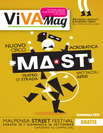 Settembre 2012 editoriale Spettacolo..... …..per …..per professione! www.sonicaservizi.com [email protected] sonica servizi +393381762022 +3903321807762 +3903321800319 http email facebook cell phone fax di Vincenzo Morreale Estate finita? Vi siamo mancati? In questo momento scrivo l'editoriale dopo una nottata di temporali che ha rinfrescato il fuoco di questa ultima settimana d'agosto. Un caldo davvero insopportabile tanto che avevo i miraggi mistici tipo i primi film di “Fantozzi” e, mentre l'Arcangelo Gabriele mi indicava la strada verso il più vicino condizionatore, pensavo a come fare più bello e ricco questo numero del nostro rientro settembrino... Comunque: c'è ancora un gran sole e non manca la voglia di uscire, vivere la provincia, partecipare a festival e manifestazioni. Cosa fare a casa se si è in ferie e si è rimasti a Varese? O se si è rientrati al lavoro ma si ha un magone enorme per la fine prematura delle vacanze? Questo settembre ci riserva un gran finale d'estate, se non altro per le due principali proposte relative ai festival che offre la provincia di Varese. Parlo dei festival Mollalosso e MAST (Malpensa street festival): il primo, giunto alla sua seconda edizione, porterà sul palco un cast di musicisti davvero ric- chissimo ed eterogeneo mentre il secondo, alla sua prima edizione, proporrà una formula del tutto inedita e particolare. Qualcosa di sicuramente originale e mai visto prima sul nostro territorio. E se siete stati fuori provincia per tutta l'estate e siete curiosi di sapere come sono andate le tantissime manifestazioni, ci ha pensato la nostra rubrica “live report” con Jessica Musto che ha confezionato un vero e proprio resoconto dei migliori festival della nostra zona. Diamo anche il benvenuto, o in qualche modo il bentornato, ad una rubrica relativa al territorio che da diverso tempo mancava fra le nostre pagine: Urban Garden (Where the wild things are), curato da Laura Castoldi, parlerà di giardinaggio urbano e ci farà scoprire un mondo nascosto e del tutto nuovo agli occhi dei più (n.d.r. anche del sottoscritto!). E poi? E poi come sempre un'agenda ricca di eventi, arte, libri, le migliori recensioni di dischi, fumetti, poesia... Insomma: siamo tornati! vivamag #04 3 varese e provincia | settembre 2012 sommario editore Quattrocentocinquantuno Associazione di Promozione Sociale - via Giovanni XXIII, 12 21041 Albizzate VA direttore responsabile Giuseppe Morreale direttore Vincenzo Morreale [email protected] grafica Gaia Daverio [email protected] web content Vera Morreale collaboratori Laura De Bernardi [email protected] Laura Orlandi [email protected] Stefano “Monty” Montesano Ilaria Pamio Federica Pamio Cristina Santoro Daniele Piccoli Jessica Musto Paola Truglia Marta Campo Raffaele Riccioli Laura Castoldi #04 agenda musica 21 cultura 42 report 48 urban garden 53 fumetti 54 indirizzi 58 recensioni, appuntamenti arte | libri tiratura 8.000 copie vivamag Registrazione del tribunale di Varese n° 1/2012 contatti redazione e pubblicità www.vivamag.it www.myspace.com/vivamagvarese www.facebook.com/vivamag www.twitter.com/vivamagvarese +39 329 0170561 stampa BIEMME Grafica via Verdi, 8 21041 Albizzate (VA) 6 La redazione consiglia di verificare preventivamente gli eventi segnalati. Non si assume nessuna responsabilità in caso di modifiche o cancellazioni. Giornalisti e collaboratori scrivono e operano in forma gratuita sulla rivista. Tutti i diritti riservati. I punti di vista espressi non sono necessariamente quelli dell’editore. L’editore non si assume responsabilità per eventuali errori ed omissioni relativi alla pubblicità. Nessuna parte della pubblicazione può essere riprodotta salvo consenso esplicito dell’editore La segnalazione degli eventi relativi ai clubs si intendono riservati ai soci. vivamag #04 5 eventi di settembre agenda 01 domenica sabato sabor da terra festival brasiliano 19.00 0 Vai a p 48 aperitivo con musica live o dj set, bancarelle e mostre d'arte 18.30 0 area pic nic Cuasso al Monte festa di fine estate prodotti tipici, degustazione 9.30 | 0.00 0 la baytina parco altomilanese festival del teatro e della comicità omaggio a Giorgio Gaber 6 vivamag #04 21.00 n.d. arlecchino summertime end summer fest reggae night blues General Levy, Villa Ada Posse e Powa Flowa 21.00 0 campo sportivo Castronno achtung babies U2 tribute band 21.30 n.d. 0 Maccagno festa del rock Malnate 21.00 teatro auditorium josie pearl & burninside Castellanza lago di comabbio Vergiate 03 02 fdb Venegono Inferiore hot coals 22.00 n.d. area feste Casorate Sempione noisynight live musc + hardrock & heavymetal djset by Radio Lupo Solitario 22.00 0 twister Varese rassegna antichi organi concerto 21.00 0 chiesa santa croce Gazzada Schianno sagra degli uccelli tra cinguettii a premio e imbonitori di paese dalle 5.30 n.d. lunedì ul vin de chi visin vino e specialità gastronomiche dalle 12.00 n.d. ristoro lago d'elio Maccagno aperitivo latino con Dj Gary el Mundo con 10 euro bevi 3 birre 18.00 0 area feste twister festa di fine estate end summer fest rockabilly night Cantello prodotti tipici, degustazione 9.30 | 0.00 0 lago di comabbio Vergiate Varese con The Waver e The Field 21.00 0 campo sportivo Castronno i maestri itineranti percorsi di esplorazione per bambini (8-12 anni) 9.00 | 16.30 n.d. casa del sole Barasso riapertura sdm tutto il mese gratis ai primi 10 nuovi iscritti n.d. 0 stazione della musica Besnate nesli showcase 18.00 0 casa del disco Varese vivamag #04 7 04 05 06 martedì mika marian masterclass del famoso pianista polacco 9.30 n.d. cfm Barasso i legnanesi in 'Sem Nasü Par Patì... E Pateèm!' 21.00 n.d. via verdi, 20 Cardano al Campo passeggiando per rioni percorso pedonale a San Fermo 18.30 0 mercoledì italo giglioli cena e cabaret 21.30 n.d. oratorio di masnago Varese i maestri itineranti campo natura: percorsi di esplorazione per bambini (8-12 anni) 9.00 | 16.30 n.d. casa del sole Barasso notte latina con Dj Gar