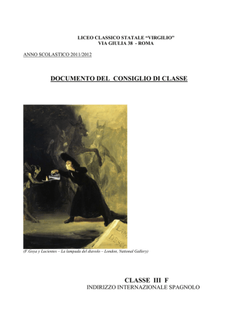 LICEO CLASSICO STATALE “VIRGILIO” VIA GIULIA 38 - ROMA ANNO SCOLASTICO 2011/2012 DOCUMENTO DEL CONSIGLIO DI CLASSE (F.Goya y Lucientes – La lampada del diavolo – London, National Gallery) CLASSE III F INDIRIZZO INTERNAZIONALE SPAGNOLO 1.PRESENTAZIONE DEL LICEO 1.1 Presentazione delle finalità del Liceo con riferimento al Piano dell’Offerta Formativa Il Liceo Classico Statale “Virgilio” ha sede nel centro storico di Roma. Qui, in via Giulia, il corpo del seicentesco Palazzo Ghislieri incontra l’architettura ideata da Marcello Piacentini dando vita all’edificio attuale, inaugurato nel 1938 che si estende fino al Lungotevere dei Tebaldi. Nelle sue sale il liceo ospita una popolazione scolastica alquanto eterogenea. Sebbene gli studenti provengano prevalentemente dalle zone centrali della città, un numero limitato ma significativo giunge anche da quelle periferiche. Nel rispetto della formazione liceale ad indirizzo classico, il Liceo Virgilio attua da diversi anni modifiche al piano di studi tradizionale, storicamente legate alle sperimentazioni già approvate dal Ministero. 1.2 Caratteri specifici dell’indirizzo LICEO INTERNAZIONALE SPAGNOLO: si propone una formazione basata sull’assunzione di saperi culturali e linguistici diversi. Caratteristica fondamentale dell’indirizzo è l’insegnamento dello Spagnolo affidato a professori provenienti, in base ad accordi internazionali, da Licei spagnoli. quadro orario Disciplina Religione/A.A. IV V 1 1 I 1 II III 1 1 Italiano 5 5 4 4 4 Storia dell'arte - - 2 2 2 Matematica ed Informatica 4 4 3 3 3 Fisica 2 2 - - - Spagnolo (*) 7 5 4 4 4 Inglese 3 3 3 3 3 Francese - - 5 4 5 Storia (**) 2 2 3 3 3 Filosofia - - 2 3 3 Latino 2 2 2 2 - Geografia (**) - 2 - - - Scienze 2 2 2 2 2 Educazione fisica 2 2 2 2 2 Totali 30 30 33 33 32 (*) = le lezioni sono tenute in lingua spagnola da un docente spagnolo. (**) = il corso si svolge in compresenza con il docente italiano e il docente spagnolo 2. PRESENTAZIONE DELLA CLASSE 2.1 Elenco dei docenti e quadro indicativo della loro stabilità nel corso del triennio MATERIA Italiano Spagnolo Storia (1) Storia in Spagnolo (1) Filosofia Inglese Convers.inglese Francese Convers.francese Matematica DOCENTE Marina Carteny Luis Moliner Marco Marocchini Magdalena Andreu Marco Marocchini Barbara Colangeli Elisabetta Donesi Liliana Boccarossa Mathilde Asselberghs Nicola Nigro STABILITA’ NEL TRIENNIO Stabile in tutto il triennio Stabile negli ultimi due anni; nel primo anno Stabile in tutto il triennio Stabile in tutto il triennio Primo anno Prof. Voltaggio, stabile nel secondo e terzo anno Primo anno Prof.ssa Napoleone, stabile nel secondo e terzo anno Primo anno Donesi, secondo anno Mamolo, terzo anno Donesi Primo anno incaricato annuale, secondo anno Prof.ssa Ciarlo, terzo anno Prof.ssa Boccarossa Primo anno Bellashene , secondo e terzo anno Asselberghs Primo e secondo anno Prof. D’Alessio, nell’ultimo anno Prof. Nigro Scienze Viviana Aureli Primo anno prof.ssa La Starza, stabile nel secondo e terzo anno Storia dell’arte Marina Ciai Stabile in tutto il triennio Educazione fisica Francesco Varone Stabile in tutto il triennio Religione /A.A Carlo Benedettini Stabile in tutto il triennio / Fotografia Paolo Fenn (1) L’insegnamento della storia avviene in compresenza 2.2 Composizione della classe e provenienza degli alunni, quadro della loro carriera scolastica La classe si compone di 21 studenti tutti provenienti dalla II F 2010/2011; una studentessa ha frequentato il II anno in Spagna e si è reinserita nel gruppo-classe quest’anno. Numero di alunni promossi in terza con la media di NUMERO STUDENTI SOSP. G. 6 6.0-7.0 7.0-8.0 6 8 8.0-9.0 1 9.0-10 Numero di alunni con valutazione di (alla fine del Trimestre) 4 <4 5 6 7 8 9-10 NC MATERIA ITALIANO 1 3 7 7 2 1 SPAGNOLO 1 4 5 4 2 4 1 3 5 6 2 4 1 6 3 7 5 2 STORIA FILOSOFIA INGLESE 2 5 4 7 FRANCESE 2 3 8 8 5 8 4 2 SCIENZE 5 7 7 2 STORIA DELL’ARTE 2 6 9 4 2 3 12 MATEMATICA ED. FISICA 2 1 4 La classe non ha avuto, nel triennio, un percorso uniforme: in alcune materie i docenti non sono stati stabili nei tre anni, nel primo anno di corso il gruppo manifestava (come spesso avviene nella prima classe del triennio) scarsa consapevolezza nei confronti dell’impegno scolastico. La situazione generale è sicuramente migliorata nel secondo anno, i risultati raggiunti dagli studenti alla fine del percorso non risultano però sempre pienamente soddisfacenti, non tutti i componenti la classe hanno fatto registrare una crescita armoniosa e costante. Il profitto risulta piuttosto differenziato nelle varie materie: in qualche caso si è verificata una sensibile crescita, il livello generale è discreto con punte di eccellenza; in altri casi il livello generale oscilla tra la mediocrità e la sufficienza, con alcune eccezioni. Per quanto riguarda il comportamento, non si sono verificati nel corso del triennio particolari episodi di indisciplina, è stato però sempre necessario rimarcare la scarsa assiduità di parecchi studenti della classe, che hanno accumulato numerose assenze e molte entrate/uscite fuori orario; questo aspetto, oltre a denotare uno scarso rispetto delle regole, ha influito negativamente sull’andamento didattico. 3. PERCORSO FORMATIVO REALIZZATO SULLA BASE DELLA PROGETTUALITA’ COLLEGIALE 3.1 Obiettivi trasversali Competenze relazionali • Partecipare attivamente e responsabilmente alla vita della comunità scolastica • Acquisire una solida cultura della legalità non solo all’interno della scuola • Saper collaborare all’interno della classe al raggiungimento di obiettivi comuni attraverso un atteggiamento attivo e responsabile, rispettoso dei propri compagni e dei propri docenti Competenze trasversali • Sviluppare senso critico e rigore intellettuale nella lettura della realtà in cui si è inseriti • Acquisire una consapevole motivazione allo studio sostenuta da impegno responsabile e serio • Saper usare forme comunicative, 