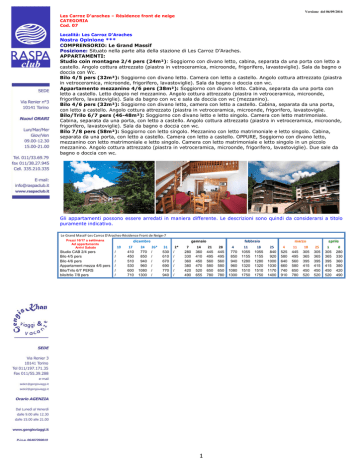 Versione del 06/09/2016 Les Carroz D’araches – Résidence front de neige CATEGORIA Cod. 07 Località: Les Carroz D’Araches Nostra Opinione *** COMPRENSORIO: Le Grand Massif Posizione: Situato nella parte alta della stazione di Les Carroz D’Araches. APPARTAMENTI: Studio coin montagne 2/4 pers (24m²): Soggiorno con divano letto, cabina, separata da una porta con letto a castello. Angolo cottura attrezzato (piastra in vetroceramica, microonde, frigorifero, lavastoviglie). Sala da bagno o doccia con Wc. Bilo 4/5 pers (32m²): Soggiorno con divano letto. Camera con letto a castello. Angolo cottura attrezzato (piastra in vetroceramica, microonde, frigorifero, lavastoviglie). Sala da bagno o doccia con wc. Appartamento mezzanino 4/6 pers (38m²): Soggiorno con divano letto. Cabina, separata da una porta con letto a castello. Letto doppio nel mezzanino. Angolo cottura attrezzato (piastra in vetroceramica, microonde, frigorifero, lavastoviglie). Sala da bagno con wc e sala da doccia con wc (mezzanino). Bilo 4/6 pers (32m²): Soggiorno con divano letto, camera con letto a castello. Cabina, separata da una porta, con letto a castello. Angolo cottura attrezzato (piastra in vetroceramica, microonde, frigorifero, lavastoviglie. Bilo/Trilo 6/7 pers (46-48m²): Soggiorno con divano letto e letto singolo. Camera con letto matrimoniale. Cabina, separata da una porta, con letto a castello. Angolo cottura attrezzato (piastra in vetroceramica, microonde, frigorifero, lavastoviglie). Sala da bagno o doccia con wc. Bilo 7/8 pers (58m²): Soggiorno con letto singolo. Mezzanino con letto matrimoniale e letto singolo. Cabina, separata da una porta, con letto a castello. Camera con letto a castello. OPPURE, Soggiorno con divano letto, mezzanino con letto matrimoniale e letto singolo. Camera con letto matrimoniale e letto singolo in un piccolo mezzanino. Angolo cottura attrezzato (piastra in vetroceramica, microonde, frigorifero, lavastoviglie). Due sale da bagno o doccia con wc. Gli appartamenti possono essere arredati in maniera differente. Le descrizioni sono quindi da considerarsi a titolo puramente indicativo. Le Grand Massif‐Les Carroz D'Araches‐Résidence Front de Neige‐7 Prezzi 16/17 a settimana Ad appartamento Arrivi Sabato Studio CAB 2/4 pers Bilo 4/5 pers Bilo 4/6 pers Appartament mezza 4/6 pers Bilo/Trilo 6/7 PERS bilo/trilo 7/8 pers dicembre 10 / / / / / / 17 410 450 510 530 600 710 24 770 850 940 960 1080 1300 gennaio 26* / / / / / / 31 530 610 670 690 770 940 2* / / / / / / 7 280 330 360 380 420 490 14 360 410 450 470 520 655 1 febbraio 21 445 495 560 580 650 780 28 445 495 560 580 650 780 4 770 850 940 960 1080 1300 11 1055 1155 1280 1320 1510 1750 18 1055 1155 1280 1320 1510 1750 marzo 25 840 920 1000 1030 1170 1400 4 525 580 640 660 740 910 11 445 495 560 580 650 780 18 305 365 395 415 450 520 aprile 25 305 365 395 415 450 520 1 305 365 395 415 450 520 8 280 330 360 380 420 490 Versione del 06/09/2016 Les Carroz D’araches – Résidence Sunotel CATEGORIA Cod. 07 Località: Les Carroz D’araches Nostra Opinione *** COMPRENSORIO: Le Grand Massif Posizione: Situato al centro della stazione. APPARTAMENTI: Studio 4 pers (17-21m²): Soggiorno con divano letto o bascolante. Cabina, separata da un a porta, con letto a castello. Angolo cottura attrezzato (piastra elettrica o in vetroceramica, forno a microonde o microonde/grill, frigorifero, caffettiera, bollitore, tostapane). Sala da bagno o doccia con wc. Alcuni appartamenti dispongono di un balcone. Gli appartamenti possono essere arredati in maniera differente. Le descrizioni sono quindi da considerarsi a titolo puramente indicativo. Le Grand Massif‐Les Carroz D'Arache‐Résidence Sunotel‐7 Prezzi 16/17 a settimana Ad appartamento Arrivi Sabato Studio 4 pers dicembre 10 / 17 360 24 690 gennaio 26* / 31 490 2* / 7 240 14 305 2 febbraio 21 395 28 395 4 690 11 930 18 930 marzo 25 740 4 460 11 395 18 260 aprile 25 260 1 260 8 240 Versione del 06/09/2016 MODULO DI RICHIESTA PRENOTAZIONE MONTAGNA (richiesta impegnativa) Si prega di stampare il seguente modulo, di compilarlo accuratamente e di inviarlo via fax allo 011.38.27.945. Tutti i moduli di prenotazione, non compilati in tutte le loro parti, non saranno considerati validi. Capogruppo Cognome e Nome..........................………………..................……… Data Nascita...........................Tel. Uff............................................………. Tel.Casa...........................................Fax............................................... Cellulare.................................e-mail:…………….……………….…@………………...…. Via\Corso\Piazza...........................................................…….....n°........... Città ............................................…....C.A.P.......…......Prov..…................ Per accellerare i tempi di conferma, vi consigliamo di inserire 2 scelte; nel caso la prima non fosse disponibile, verrà fatta la richiesta per la seconda scelta con automatica conferma in caso di disponibilità. 1° SCELTA Arrivo il Partenza il Località CODICE residence N° appartamenti N° posti letto x appartamento Partenza il Località CODICE residence N° appartamenti N° posti letto x appartamento 2° SCELTA Arrivo il Elenco partecipanti e servizi richiesti SKIPASS consecutivi Telefono 4 3 2 ___ Cognome e Nome giorni giorni giorni giorni Dal Tessera Raspa Club 16/17 + Assicurazione neve Base 1 € 20,00 Numero Tessera Raspa Club 16/17 + Assicurazione neve Base 3 € 23,00 Numero Tessera Raspa Club 16/17 + Assicurazione neve No Problem Tessera Raspa Club 16/17 € 69,00 € 12,00 € 31,00 Totale Numero Numero Quota d’iscrizione per affiliato a 1 singola Assicurazione All Inclusive Globy Verde Al € 6,00 Numero a persona e fino a 9 giorni + 4,50 % del Costo Viaggio Numero TOTALE EURO _________,___ Cos’è una richiesta impegnativa? La richiesta impegnativa non è semplicemente una richiesta 