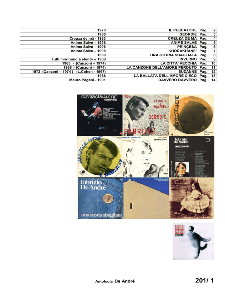 1970 1966 Creuza de mä - 1983 Anime Salve – 1998 Anime Salve – 1998 Anime Salve – 1998 1980 Tutti morimmo a stento – 1968 1965 - (Canzoni – 1974) 1966 – (Canzoni – 1974) 1972 (Canzoni – 1974 ) (L.Cohen - 1967) 1966 Mauro Pagani - 1991 Antologia IL PESCATORE GEORDIE CREUZA DE MÄ ANIME SALVE PRINÇESA KHORAKHANE’ UNA STORIA SBAGLIATA INVERNO LA CITTA’ VECCHIA LA CANZONE DELL’AMORE PERDUTO SUZANNE LA BALLATA DELL’AMORE CIECO DAVVERO DAVVERO De Andrè Pag. Pag. Pag. Pag. Pag. Pag. Pag. Pag. Pag. Pag. Pag. Pag. Pag. 2 3 4 5 6 7 8 9 10 11 12 13 14 201/ 1 IL PESCATORE Fabrizio De André 1970 (Spartito SIbem, con la PFM DO) (DO ) ¦FA ¦DO DO ¦SOL ¦DO SOL7 ¦FA SOL7 ¦DO DO ¦FA FA DO ¦SOL LA DO All'ombra dell'ultimo sole s'era assopito un pescatore FA SOL7 DO FA DO SOL7 DO e aveva un solco lungo il viso come una specie di sorriso. DO SOL7 DO FA DO Venne alla spiaggia un assassino due occhi grandi da bambino FA SOL7 DO FA DO SOL7 DO due occhi enormi di paura eran gli specchi di un'avventura ¦FA ¦DO ¦SOL ¦DO ¦FA SOL7 ¦DO ¦FA DO ¦SOL LA- la la la................................................. DO SOL7 DO FA DO E chiese al vecchio dammi il pane ho poco tempo e troppa fame FA SOL7 DO FA DO SOL7 DO e chiese al vecchio dammi il vino ho sete e sono un assassino. DO SOL7 DO FA DO Gli occhi dischiuse il vecchio al giorno non si guardò neppure intorno FA SOL7 DO FA DO SOL7 DO ma versò il vino e spezzò il pane per chi diceva ho sete e ho fame. ¦FA ¦DO ¦SOL ¦DO ¦FA SOL7 ¦DO ¦FA DO ¦SOL LA- la la la................................................. DO SOL7 DO FA DO E fu il calore di un momento poi via di corsa verso il vento FA SOL7 DO FA DO SOL7 DO davanti agli occhi ancora il sole dietro alle spalle un pescatore. DO SOL7 DO FA DO Dietro alle spalle un pescatore e la memoria è già dolore FA SOL7 DO FA DO SOL7 DO è già il rimpianto di un aprile giocato all'ombra di un cortile. ¦FA ¦DO ¦SOL ¦DO ¦FA SOL7 ¦DO ¦FA DO ¦SOL LA- la la la................................................. DO SOL7 DO FA DO Vennero in sella due gendarmi vennero in sella con le armi FA SOL7 DO FA DO SOL7 DO chiesero al vecchio se lì vicino fosse passato un assassino. DO SOL7 DO FA DO Ma all'ombra dell'ultimo sole s'era assopito il pescatore FA SOL7 DO FA DO SOL7 DO e aveva un solco lungo il viso come una specie di sorriso FA SOL7 DO FA DO SOL7 DO e aveva un solco lungo il viso come una specie di sorriso ¦FA ¦DO ¦SOL ¦DO ¦FA SOL7 ¦DO ¦FA DO ¦SOL DO ¦FA DO ¦SOL DO la la la................................................. ¦FA ¦DO ¦SOL ¦DO ¦FA SOL7 ¦DO la la la................................................. 201/ 2 Antologia De Andrè GEORDIE Fabrizio De André 1968 (Originale SOLmin) LA– Uomo SOL FA MI7 LA– Mentre attraversavo London Bridge LA– DO SOL DO SOL un giorno senza sole MI– LA– MI– LA– vidi una donna pianger d’amore piangeva per il suo Geordie LA– Donna SOL FA MI7 LA– DO Impiccheranno Geordie con una corda d’oro LA– DO SOL MI– LA– SOL è un privilegio raro MI– LA– rubò sei cervi nel parco del re vendendoli per denaro LA– Uomo SOL FA MI7 LA– Sellate il suo cavallo dalla bianca criniera LA– DO SOL MI– LA– DO SOL sellatele il suo pony MI– LA– cavalcherà fino a Londra stasera ad implorare per Geordie LA– Donna SOL FA MI7 LA– Geordie non rubò mai neppure per me LA– DO SOL MI– DO SOL un frutto un fiore raro LA– MI– LA– rubò sei cervi nel parco del re vendendoli per denaro LA– insieme SOL FA MI7 Salvate le sue labbra salvate il suo sorriso LA– DO SOL LA– DO SOL non ha vent’anni ancora MI– cadrà l’inverno anche sopra il suo viso LA– Uomo MI– LA– potrete impiccarlo allora LA– SOL FA MI7 LA– Né il cuore degli inglesi né lo scettro del re LA– DO SOL MI– LA– DO SOL Geordie potran salvare MI– LA– anche se piangeranno con te la legge non può cambiare LA– insieme SOL FA MI7 Così lo impiccheranno con una corda d’oro LA– DO SOL LA– DO SOL è un privilegio raro MI– rubò sei cervi nel parco del re LA– Uomo MI– LA– vendendoli per denaro Antologia De Andrè 201/ 3 CREUZA DE MÄ RE Fabrizio De André 1983 Umbra de muri muri de mainé dunde ne vegnì duve l‘è ch‘ané da ‘n scitu duve a l‘ûn-a a se mustra nûa e a neutte a n‘à puntou u cutellu ä gua e a muntä l‘àse gh‘è restou Diu u Diàu l‘è in çë e u s‘è gh‘è faetu u nìu ne sciurtìmmu da u mä pe sciugà e osse da u Dria a a funtan-a di cumbi ‘nta cä de pria RE E SOL anda RE LA SOL e-----e RE RE anda SOL SOL RE anday-----o RE SOL (2 volte) LA E ‘nta cä de pria chi ghe saià RE int’à cä du Dria che u nu l’è mainà RE LA gente de Lûgan facce de mandillä SOL LA e------e-------e RE qui che du luassu preferiscian l’ä RE LA RE figge de famiggia udù de bun che ti peu ammiàle senza u gundun RE RE E SOL anda LA RE LA SOL e-----e RE anda LA SOL RE e------e-------e LA anday-----o RE (2 volte) SOL RE E a ‘ste panse veue cose che daià SOL LA RE E SOL anda RE LA SOL e-----e LA RE çervelle de bae ‘nt’u meximu vin RE LA Lasagne da fiddià ai quattru tucchi RE RE cose da beive cose da mangiä Frittûa de pigneu giancu de Purtufin SOL (2 volte) paciûgu in aegruduse de lévre de cuppi RE anda RE LA SOL RE e------e-------e SOL anday-----o (2 volte) RE E ‘nsci’a barca du vin ghe navighemu ‘nsc’i scheuggi LA RE emigranti du rìe cu’i cioi ‘nt’i euggi SOL RE LA RE finché u matin crescià da puéilu rechéugge SOL frè di ganeuffeni e de figge RE bacan d’à corda marsa d’aegua e de sä LA RE che na liga e a ne porta ‘nte ‘na creuza de mä RE E SOL anda LA RE E RE LA SOL e-----e RE SOL anda 201/ 4 anda LA RE LA SOL e-----e anda RE LA SOL e------e-------e RE anday-----o RE RE (2 volte) (2 volte) LA SOL e------e-------e Antologia De Andrè RE anday-----o (ad lib.) ANIME SALVE (SOL LA FA DO SOL LA FA DO FA Fabrizio De André FA FA FA) 1998 SIbem9 Mille a