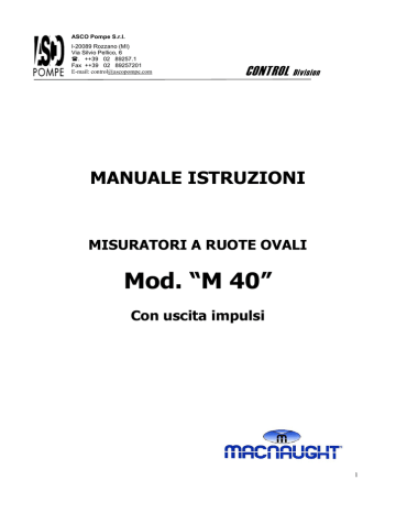 ASCO Pompe S.r.l. I-20089 Rozzano (MI) Via Silvio Pellico, 6 . ++39 02 89257.1 Fax ++39 02 89257201 E-mail: [email protected] CONTROL Division MANUALE ISTRUZIONI MISURATORI A RUOTE OVALI Mod. “M 40” Con uscita impulsi 1 ALL’ACQUIRENTE….. Grazie per aver acquistato un contatore MACNAUGHT a ruote ovali serie M. Per cortesia impieghi alcuni minuti del suo tempo per leggere questo manuale d’istruzioni prima di installare e utilizzare il contatore. Per qualsiasi problema, fare riferimento ai paragrafi “Manutenzione” e “ Ricerca guasti”. Per ulteriori informazioni, contattare ASCO Pompe Control Divison (tel. 02 89257.1). GENERALITA’ I contatori MACNAUGHT serie M utilizzano il principio di misura delle ruote ovali. Le caratteristiche principali di questo sistema sono l’affidabilità e l’accuratezza delle misure eseguite; i contatori serie M mantengono una buona precisione ed un’ottima ripetibilità anche con campi di portata e viscosità molto variabili. Le basse perdite di carico e la resistenza alle alte pressioni di linea consentono di utilizzare questi contatori sia nei processi con pressioni di linea molto basse, sia nei processi con pressioni di linea molto alte. I contatori serie M sono disponibili in molteplici versioni con materiali differenti: corpo in acciaio inox o in alluminio, rotori in PPS/Ryton o in acciaio inox, alberi in acciaio inox o Hastelloy C, o-rings in EPDM, NBR, Viton o teflon. Il contatore modello M40 è disponibile nelle seguenti versioni: - Segnale in uscita ad impulsi - Display LCD tipo STD e segnale in uscita ad impulsi: lettura di portata istantanea, portata totalizzata azzerabile e portata totalizzata non azzerabile. Maggiori dettagli in questo manuale. - Display LCD tipo Deluxe a sicurezza intrinseca e segnale in uscita ad impulsi: lettura di portata istantanea, portata totalizzata azzerabile, portata totalizzata non azzerabile e quantità preimpostata da dosare. Maggiori dettagli nel manuale specifico. INFORMAZIONI IMPORTANTI ! Leggere attentamente queste informazioni prima dell’uso! Assicurarsi che l’ingresso e l’uscita della tubazione siano perfettamente allineati. Uno stress meccanico dovuto ad un non perfetto allineamento danneggerà il contatore. Assicurarsi di aver montato un filtro di dimensioni idonee (il contatore convoglia particelle di diametro massimo pari a 0.28 mm.). Il filtro consigliato è del tipo a Y o a cesto con dimensioni pari a 60 mesh (250 microns). Ricordarsi di installare il filtro il più possibile vicino al contatore e di eseguire una periodica ed accurata pulizia: la vita media del contatore dipende strettamente da queste operazioni. Controllare la compatibilità tra liquido misurato e materiali del contatore. Evitare picchi di pressione superiori alla pressione nominale riportata sulla targhetta del contatore. 2 Assicurarsi di aver pulito l’interno della tubazione ad impianto nuovo e dopo ogni intervento (es: dopo ogni saldatura). Riempire di liquido l’impianto prima dell’utilizzo evitando il passaggio di aria nel contatore. Il segnale ad impulsi tipo REED può causare errori di lettura se abbinato ad un totalizzatore ad alta velocità. Per evitare questo problema, inserire un circuito “antirimbalzo” per il segnale REED o utilizzare un impulso ad effetto Hall. La manutenzione del display LCD e del segnale ad impulsi può essere effettuata senza scollegare il contatore dalla linea; per la manutenzione di tutte le altri parti del contatore, bisogna ridurre la pressione dell’impianto e isolare il contatore dalla linea. Utilizzare solo personale qualificato e opportunamente istruito per le operazioni di installazione e per l’operatività quotidiana. Ricordarsi di spegnere la pompa alla fine di ogni giornata di lavoro. INSTALLAZIONE ! Leggere attentamente queste informazioni prima dell’uso! 1. Macnaught consiglia di montare il contatore realizzando sempre un circuito di by-pass. In questo modo sarà possibile effettuare la manutenzione senza interrompere la produzione (vedere fig.1). 3 2. Sugli attacchi al processo filettati utilizzare sempre tenute di materiale adeguato. 3. Controllare che la massima pressione di lavoro del contatore (55 bar) sia superiore a quella massima di lavoro dell’impianto. 4. Installare appena prima del contatore un filtro a Y o a cesto con dimensione massima delle maglie di 250 microns (60 mesh). 5. Verificare che il fluido scorra nella direzione della freccia riportata sul contatore. 6. Il contatore può essere installato in qualsiasi posizione ma sempre con gli alberi in posizione orizzontale (come mostrato in fig. 2). Il registro può essere posizionato nella posizione di lettura più comoda per l’operatore, facendolo ruotare per passi successivi di 90° ciascuno. Per eseguire questa operazione bisogna svitare e avvitare le 4 viti posizionate sul frontale: fare sempre attenzione nell’inserimento delle guarnizioni nella parte inferiore del registro. Nota bene: una installazione non corretta può favorire una precoce usura dei singoli componenti 7. Collegamento tra misuratore e tubazioni: evitare un serraggio troppo energico. 8. Prima di utilizzare il contatore riempire lentamente l’impianto con liquido per evitare il funzionamento in presenza di aria che potrebbe danneggiare il misuratore. 9. Testare l’impianto prima dell’utilizzo per verificare eventuali perdite. 10. Controllare periodicamente il filtro per rimuovere eventuali particelle o solidi presenti all’interno. FUNZIONAMENTO Il fluido che passa nel contatore fa girare i due rotori; il magnete posizionato nei rotori trasmette la misura alla scheda elettronica PCB e quindi al totalizzatore LCD tipo STD o a uno strumento esterno. 4 COLLEGAMENTI ELETTRICI Collegamento del sensore REED ai morsetti della scheda PCB (fig.3) Collegamento del sensore effetto Hall ai morsetti della scheda PCB (fig.4) Tensione dell’effetto Hall: 4,5 … 24 Vcc Corrente minima prodotta: 4,6 mA Uscita NPN Open collec