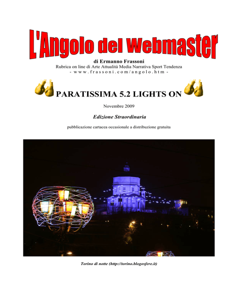 di Ermanno Frassoni Rubrica on line di Arte Attualità Media Narrativa Sport Tendenza - www.frassoni.com/angolo.htm - PARATISSIMA 5.2 LIGHTS ON Novembre 2009 Edizione Straordinaria pubblicazione cartacea occasionale a distribuzione gratuita Torino di notte (http://torino.blogosfere.it) Le parole sono pericolose. Certe vengono usate per ferire e umiliare, per alimentare la diffidenza e persino l’odio. Di altre viene distorto profondamente il significato per sostenere intenzioni di gerarchia e di discriminazione. Altre ancora sono belle e allegre. Bisogna rinunciare alle idee preconcette, a certi modi di dire e proverbi che vanno nel senso della generalizzazione e per conseguenza del razzismo. Tahar Ben Jelloun scrittore marocchino (Fes, Marocco, 1° dicembre 1944) L’Angolo del Webmaster di Ermanno Frassoni www.frassoni.com/angolo.htm info tel. +39 335 5235249 Hanno collaborato a questo Numero Speciale (in ordine alfabetico): Rosalba Di Perna - Nata a Catania nel 1983, qui vive e lavora, si è laureata in Lingue e culture europee ed extraeuropee con una tesi in storia dell’arte contemporanea dal titolo “Carla Accardi fra Astrattismo e Informale”. Tra le sue passioni la Body Art, corrente artistica diffusasi negli anni Sessanta. Si definisce classica e quindi alternativa. Emma Gabriele - Nata a Napoli nel 1980, qui vive e opera, collabora a tempo pieno con Il Denaro. Laureata in Giurisprudenza, decide poi di scegliere il giornalismo critico e affiancare la sua penna alle espressioni dell’arte. Si occupa di letteratura, cinema, arte ed enogastronomia per varie testate giornalistiche. Franco Leonetti - Nato a Torino nel 1965, qui vive e lavora, vanta numerose competenze spese tra uffici stampa e dipartimenti di comunicazione, che lo hanno indotto a cimentarsi in una nuova avventura: la scrittura del suo primo romanzo. E’ stato così concepito Linea D’Ossigeno, pubblicato nel 2008 dalla casa editrice Davide Zedda di Cagliari. Walter Nicolosi - Nato a Torino nel 1984, attualmente vive e lavora a Ferrara, ha partecipato alla stesura del primo numero cartaceo de L’Angolo del Webmaster (Luglio - Agosto 2009). Autore di recensioni d’arte, collabora tra gli altri con il portale milanese di arte, cultura e creatività Mdarte. Nel 1998 è stato insignito del Premio Marta Spallanzani consegnato dalla Società Dante Alighieri di Reggio nell’Emilia. Elena Serra - Nata a Saluggia (Vercelli) nel 1964, vive e opera nel vercellese. Ha esordito nel mondo dell’editoria nelle vesti di autrice del romanzo Lysis, pubblicato nel 2008 dalla casa editrice Enrico Folci di Montecosaro (Macerata). NOTA BENE (1): tutti gli articoli pubblicati sono stati scritti in esclusiva per l’Edizione Straordinaria. NOTA BENE (2): la maggior parte degli articoli sono corredati da immagini provenienti da Internet di proprietà dei rispettivi autori e/o proprietari, come indicato tra parentesi in alcune didascalie. Si rende pertanto noto che non è intenzione de L’Angolo del Webmaster recare danno a persone e/o Società con la pubblicazione delle predette foto. 2 PARATISSIMA, L’EVENTO OFF DI ARTISSIMA Parallelismi anticonvenzionali il banner di Paratissima 5.2 Paratissima è una manifestazione artistica nata per volontà del Gruppo Para nel 2005 al fine di realizzare la promozione e l’esposizione della creatività in siti non precipuamente deputati a tale funzione, animata dal meritorio ideale di concedere spazio ad ogni autore con le rispettive forme d’arte, come specchio fedele di quelle estemporanee, estrose ed anticonformiste attività che nell’odierno mondo ipertecnologico sono ancora pienamente vitali. L’edizione di quest’anno, denominata Paratissima 5.2, sempre ad accesso gratuito, si svolgerà, così come nel 2008, a Torino nel multietnico quartiere di San Salvario, presso esercizi commerciali ed artigianali, studi professionali, pubbliche piazze, residenze e cortili privati, e comprenderà pittura figurativa ed astratta, scultura, fotografia, design, cortometraggi documentaristici, spettacoli musicali e teatrali, creando quindi parallelismi anticonvenzionali tra differenti modalità espressive, comunque accomunate dall’essere un’efficace dimostrazione del libero pensiero trasposto in opere. Date ed orari: • • • Venerdì 6 Novembre dalle ore 15.30 alle ore 24.00 Sabato 7 Novembre dalle ore 10.00 alle ore 24.00 Domenica 8 Novembre dalle ore 15.00 alle ore 19.00 Walter Nicolosi Critico d’Arte 3 EDITORIALE Tre mesi. Questo il periodo di tempo intercorso tra la prima Edizione Straordinaria in formato cartaceo della rubrica on line L’Angolo del Webmaster (Luglio - Agosto 2009) e l’uscita del secondo numero speciale che siete ora impegnati a leggere. Forte degli incoraggiamenti ricevuti in seguito alla pubblicazione della rivista interamente dedicata alla città di Andora, ubicata nella regione Liguria a 55 chilometri da Savona, coincisa peraltro con la mostra personale del pittore Franco Frassoni intitolata L’Isola che Non C’è, la on line column di Frassoni.com, ormai prossima a festeggiare i cento numeri su Internet dopo quattro anni di militanza negli affascinanti gorghi del Web, ritorna prepotentemente sulla scena strizzando nuovamente l’occhio al mondo della carta stampata grazie al progetto Paratissima 5.2 Lights On. L’idea nasce dalla volontà di affiancare alla kermesse artistica, allestita per il secondo anno consecutivo nel quartiere torinese di San Salvario in contemporanea alla Fiera Internazionale Artissima, organizzata come di consueto nei padiglioni del Lingotto, una sorta di unofficial magazine incentrato su temi attualissimi quali l’integrazione socio-culturale e la libertà di espressione da intendersi nel suo complesso. Quale miglior sede per affrontare compiutamente simili argomenti? Non spetta comunque né a Franco Frassoni né tanto meno al sottoscritto l’onore e l’onere di calarsi individualmente nella trascinante atmosfera di Paratissima 5